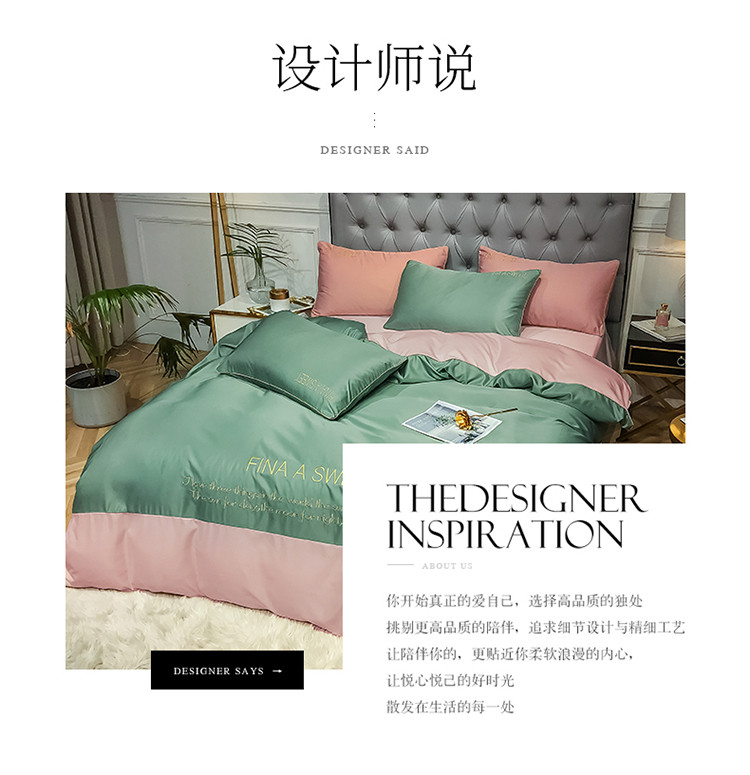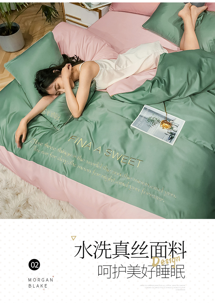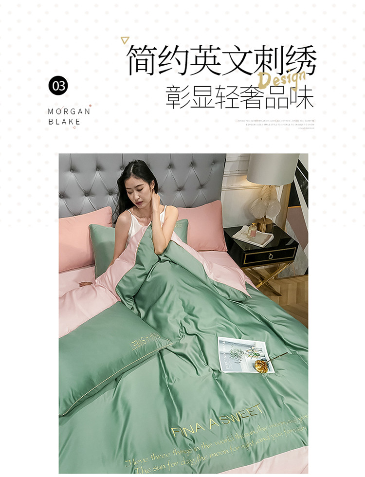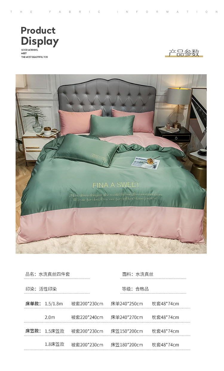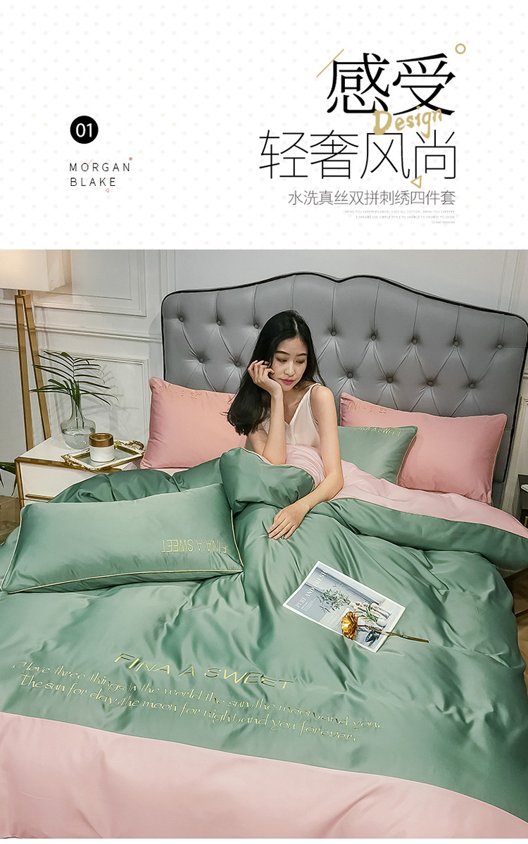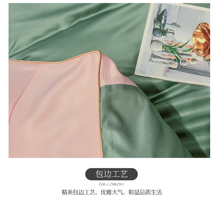 商品名称:润缦 2020新款水洗真丝四件套双拼系列 灰草绿+玫瑰粉