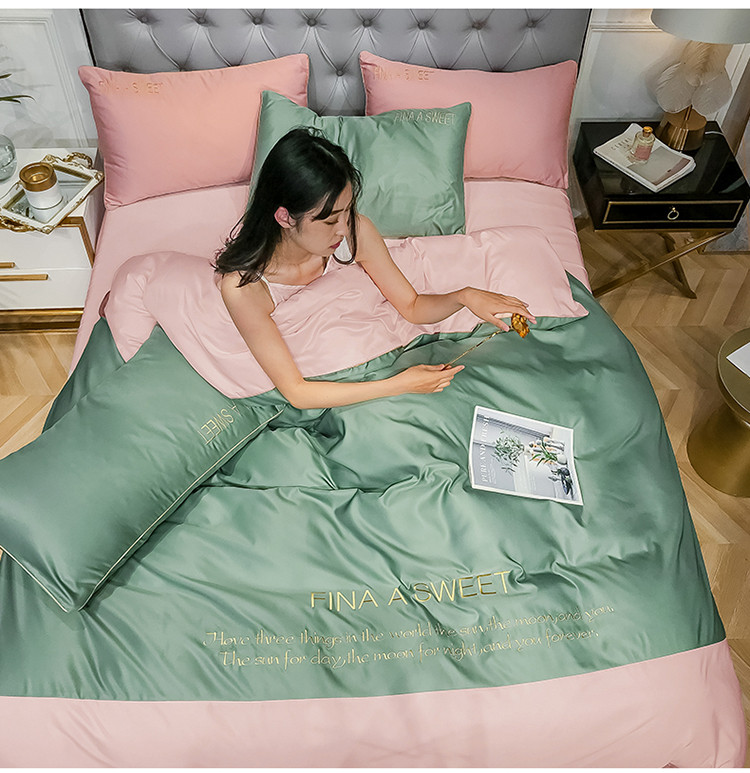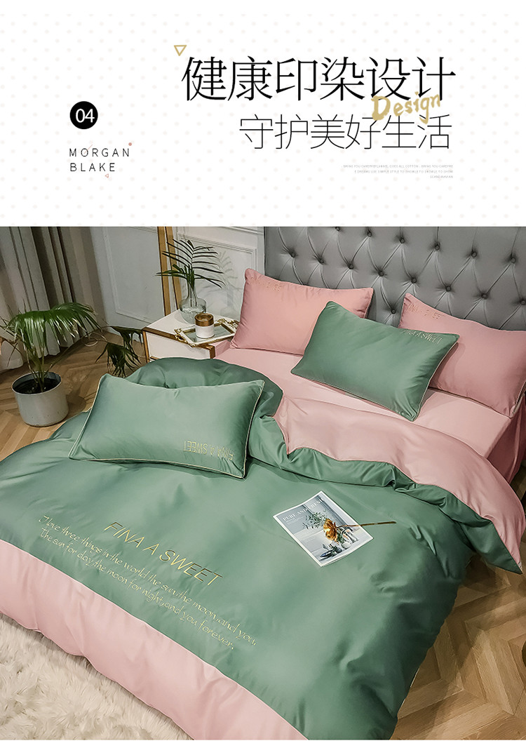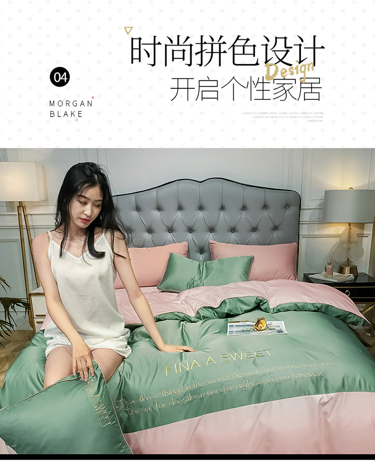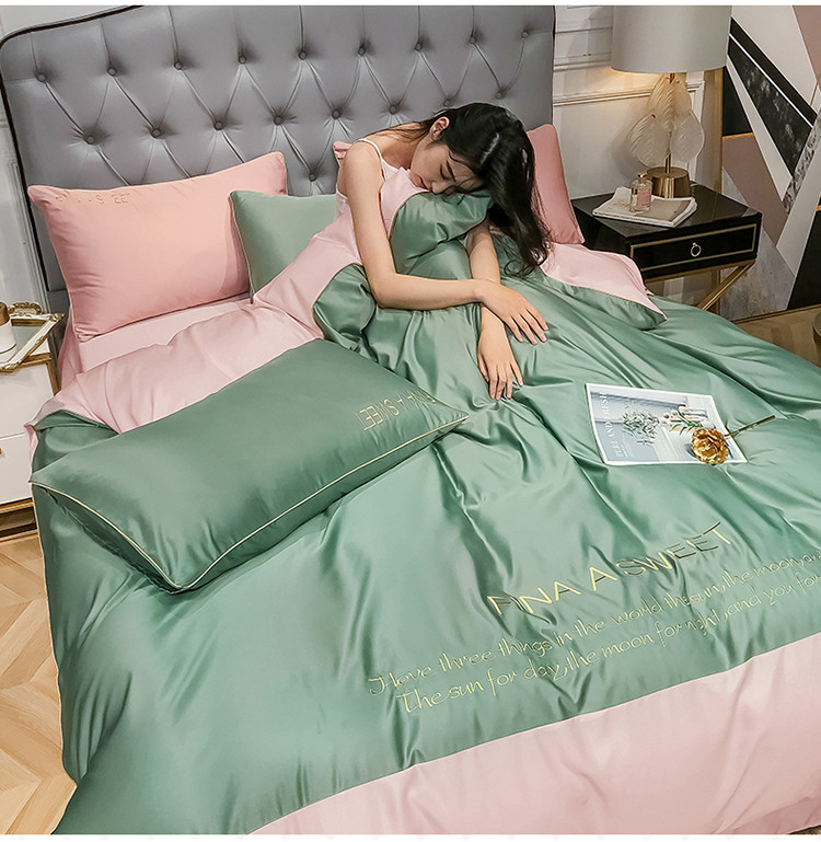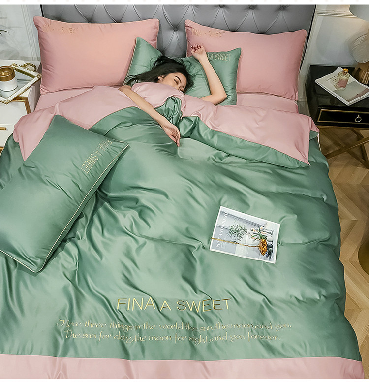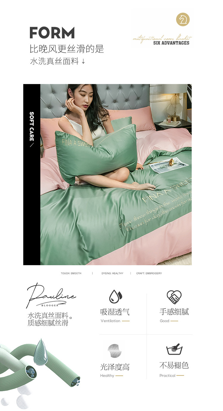 商品名称:润缦 2020新款水洗真丝四件套双拼系列 灰草绿+玫瑰粉