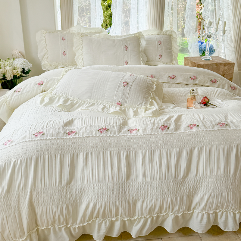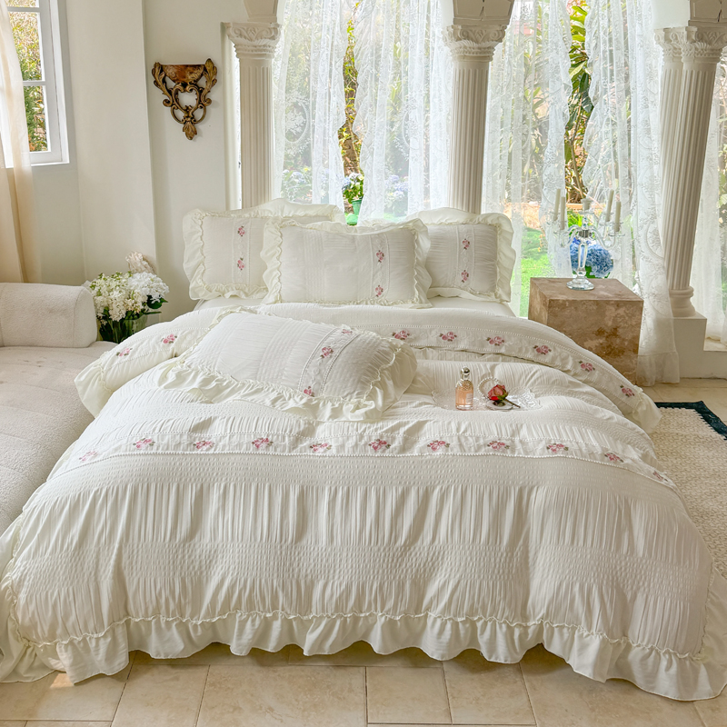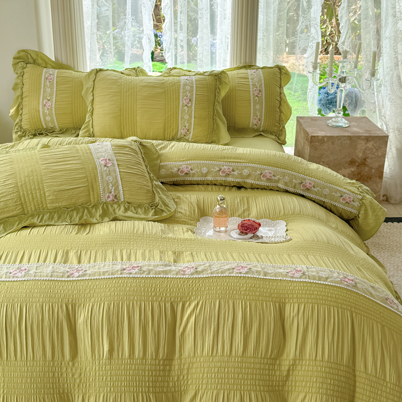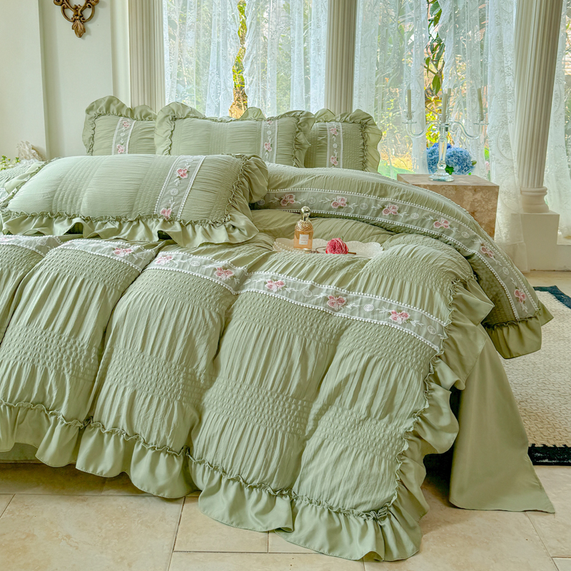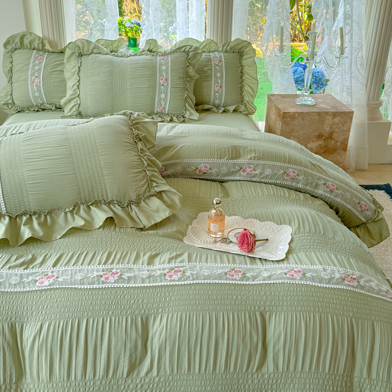 商品名称:仟网汇 2024新款韩版泡泡纱刺绣花边四件套 泡泡纱-薰衣草紫