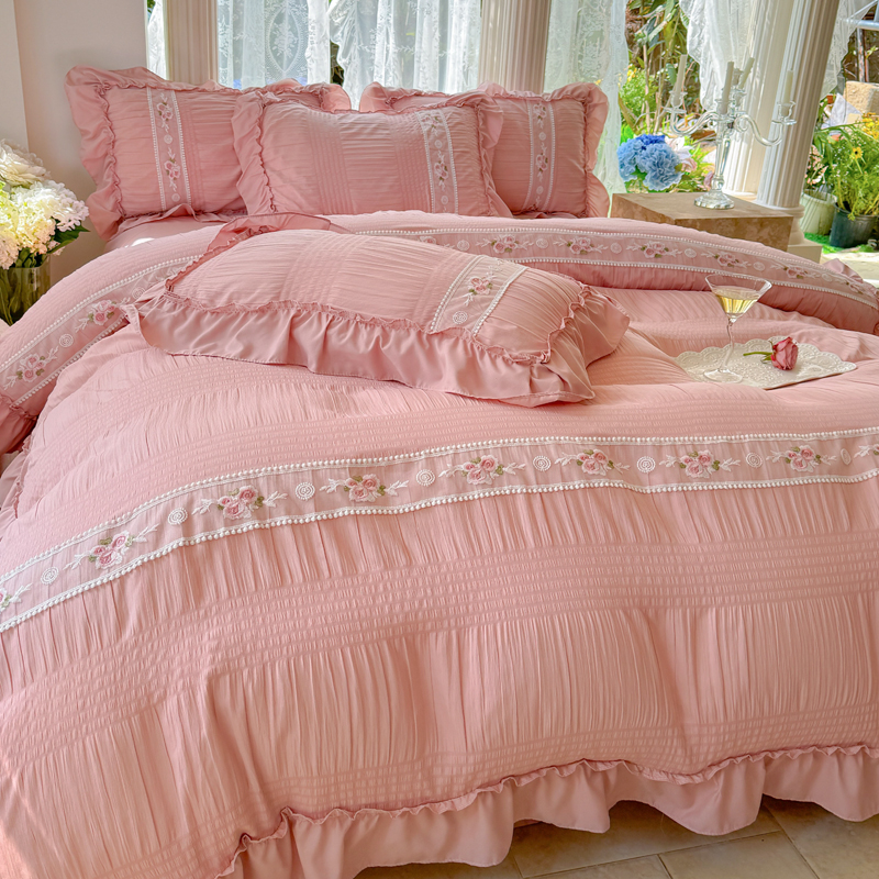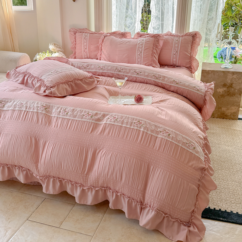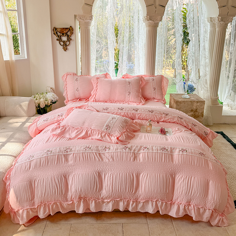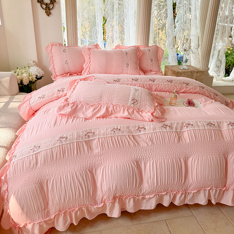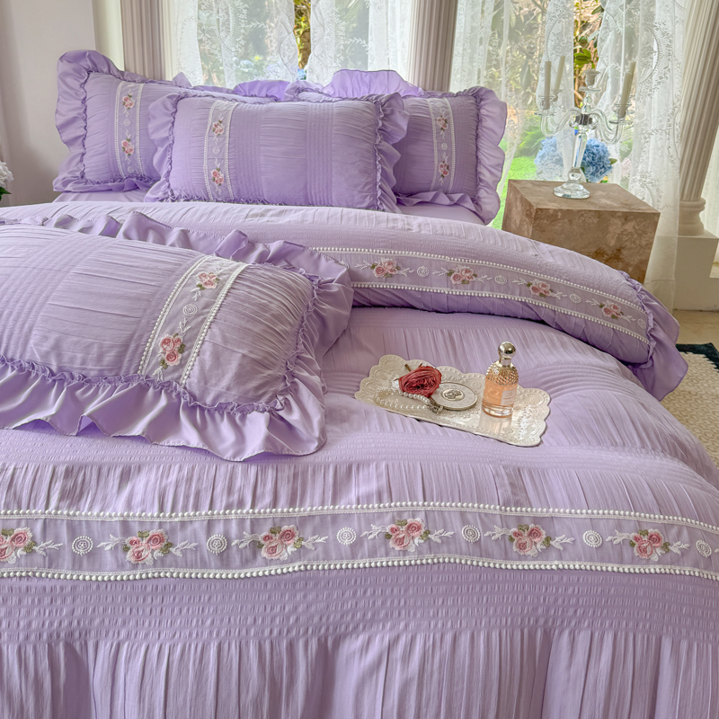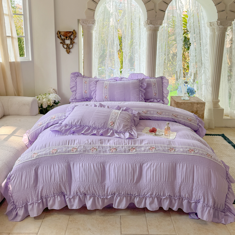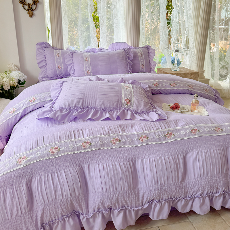 仟网汇 2024新款韩版泡泡纱刺绣花边四件套 泡泡纱-薰衣草紫