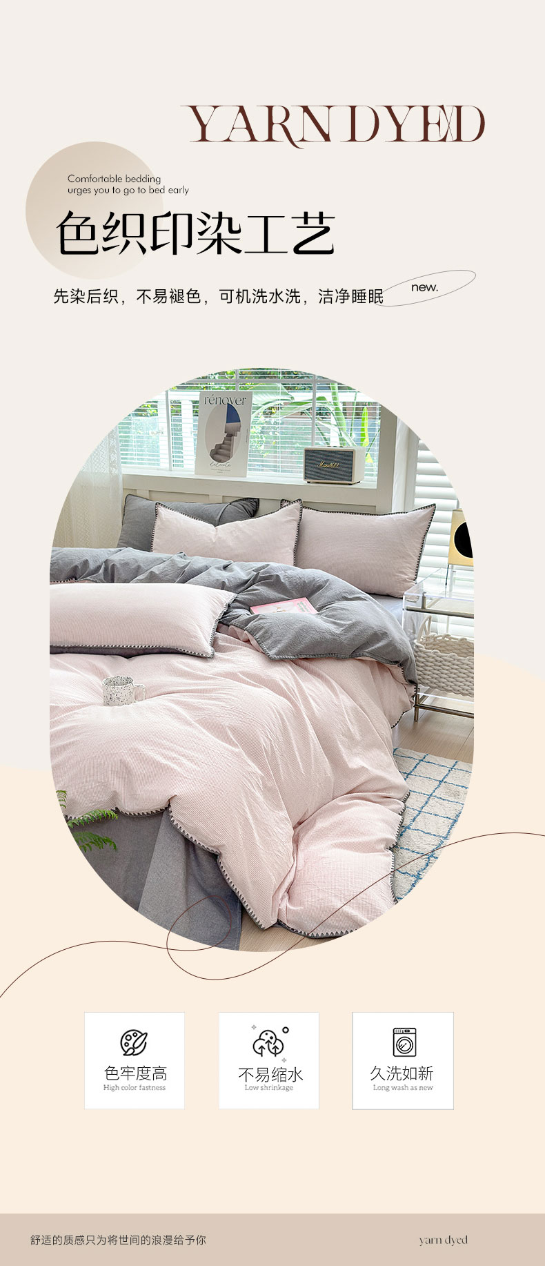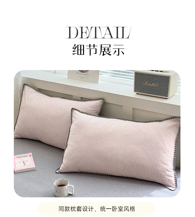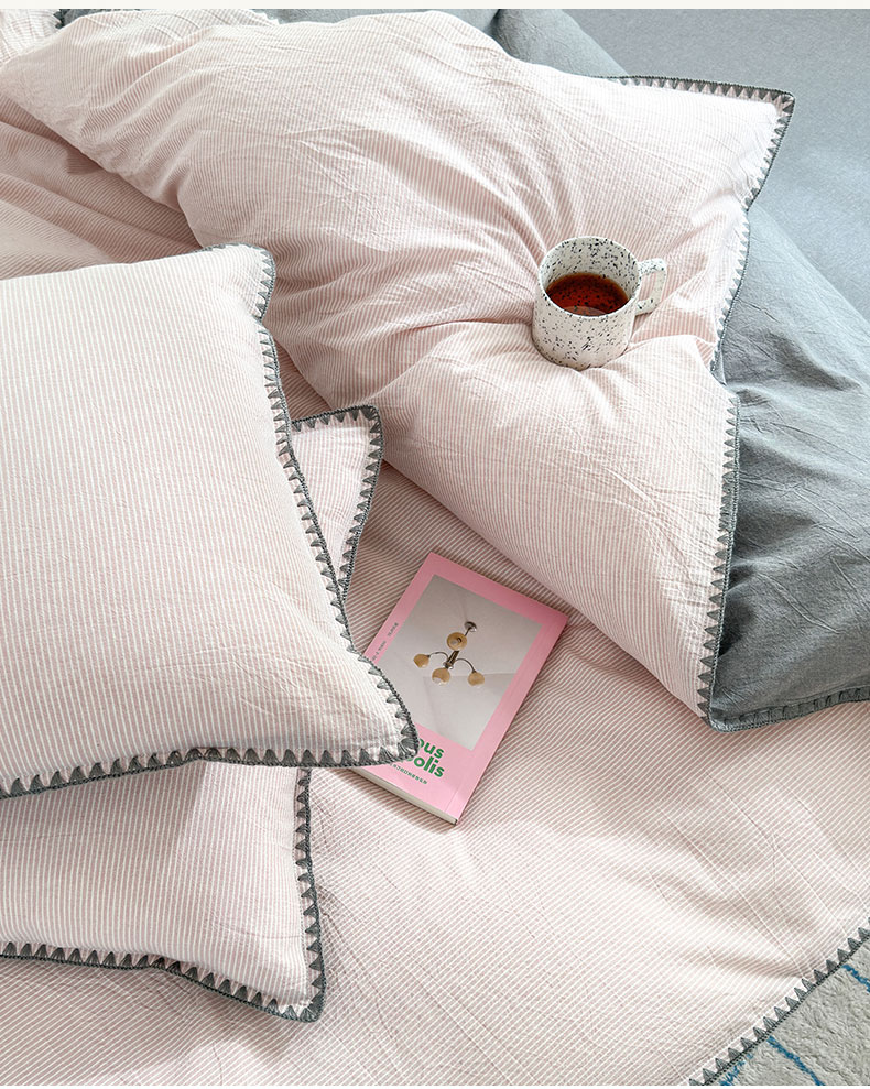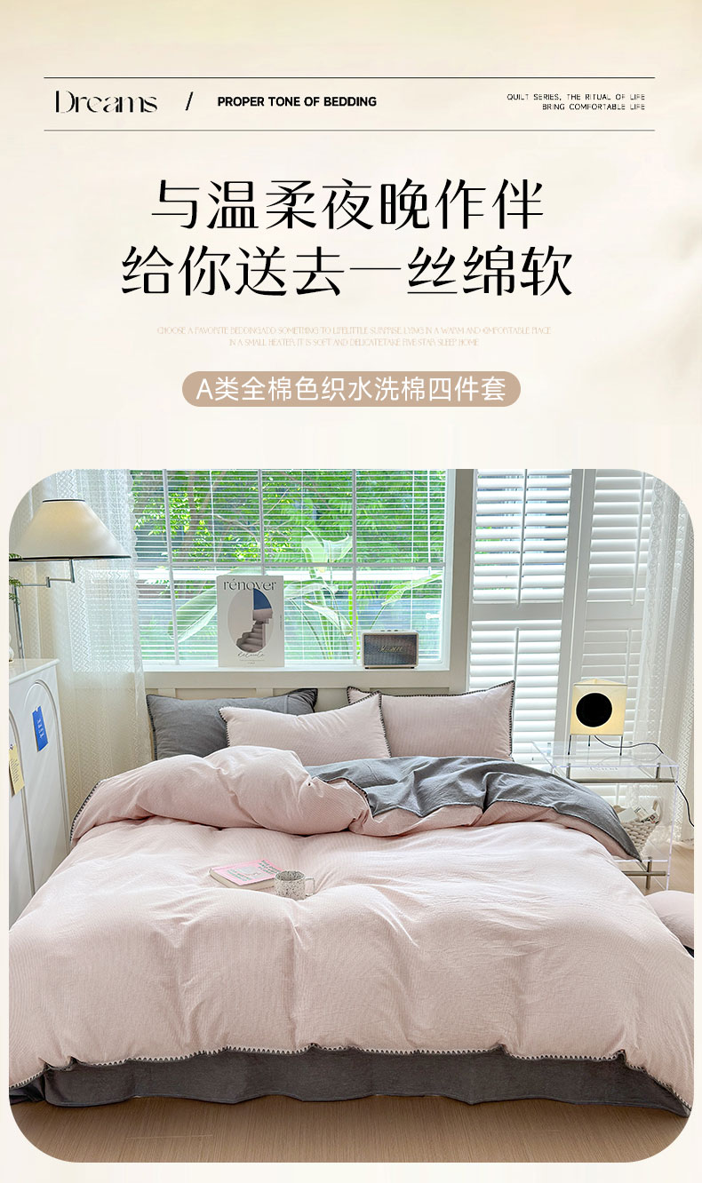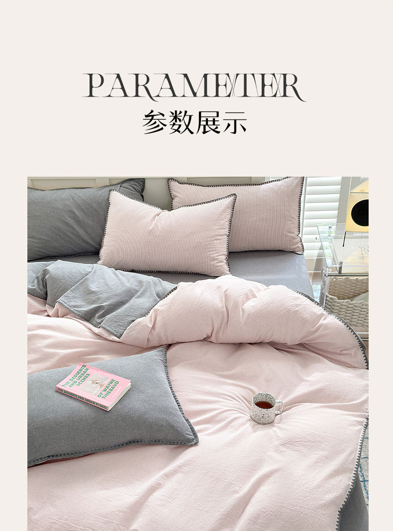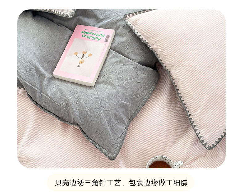 当前位置: 91家纺网 > 商品网购 > 床品套件 > 四件套 > 全棉普通四件套 > 晚依家纺 2024新款全棉色织水洗棉贝壳边绣三角针工艺四件套 时光-粉灰