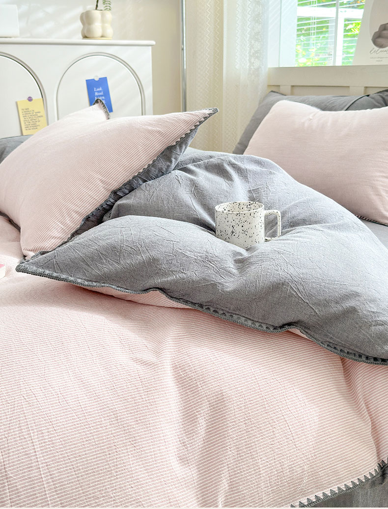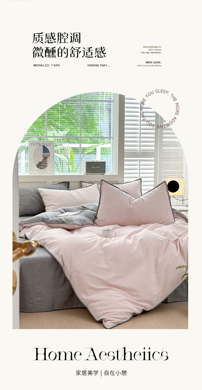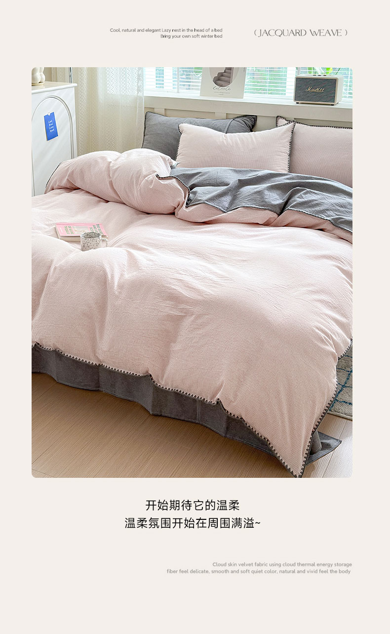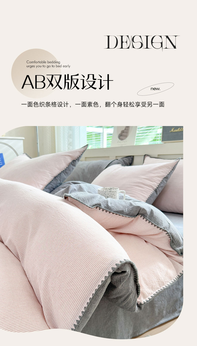 当前位置: 91家纺网 > 商品网购 > 床品套件 > 四件套 > 全棉普通四件套 > 晚依家纺 2024新款全棉色织水洗棉贝壳边绣三角针工艺四件套 时光-粉灰