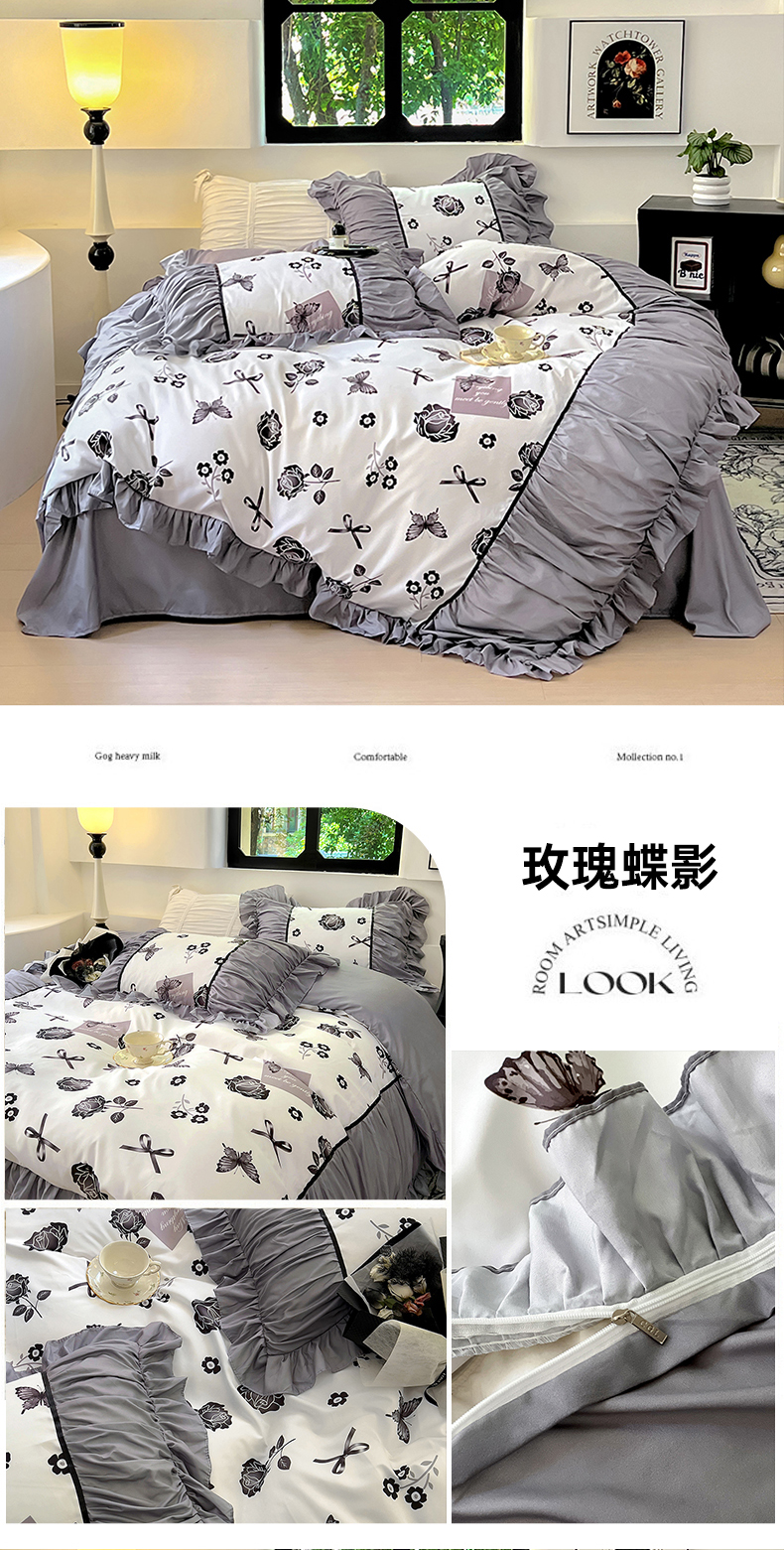 商品名称:春光里 2024新款法式大花边亲肤磨毛四件套 玫瑰蝶影