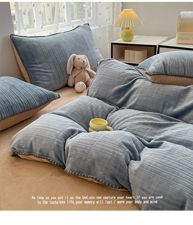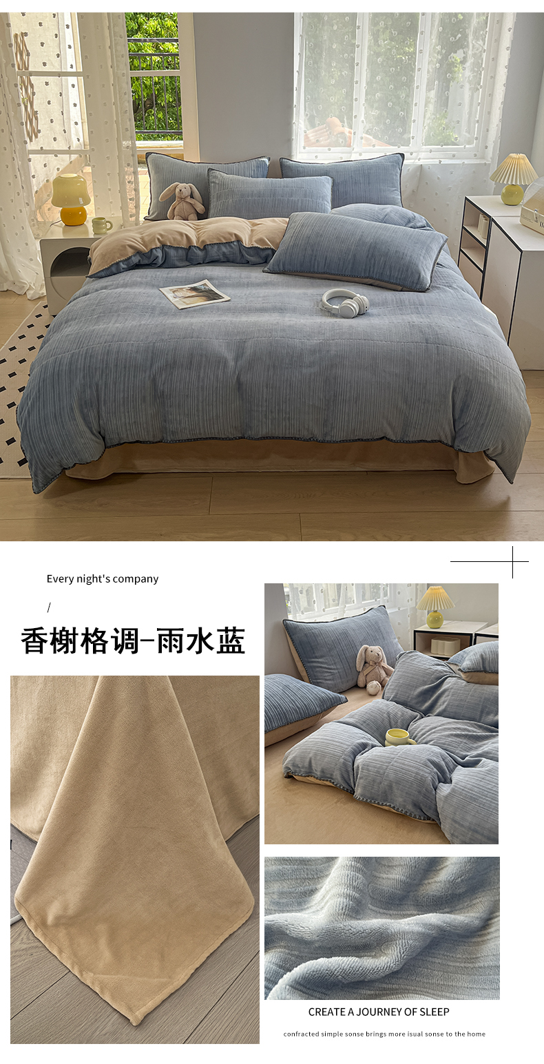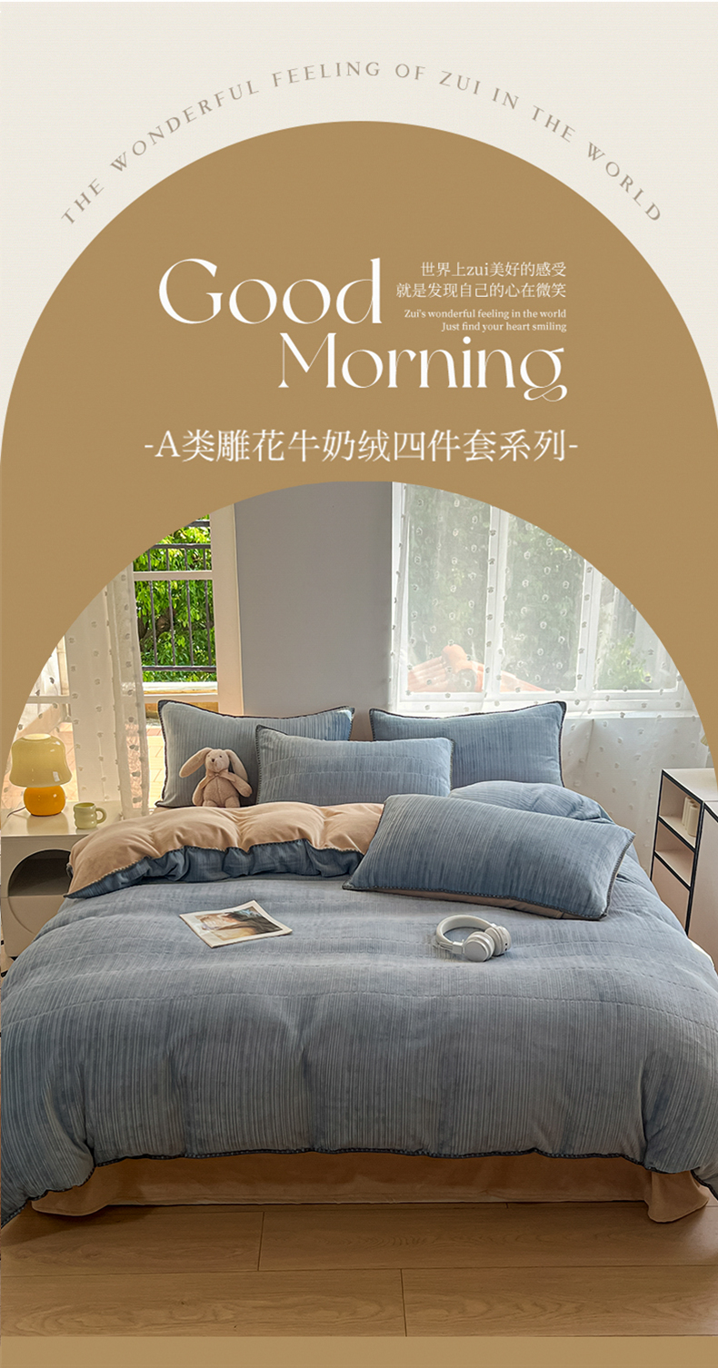 当前位置: 91家纺网 > 商品网购 > 床品套件 > 四件套 > 牛奶绒四件套 > 晚依家纺 2024新款230g纯色立体雕花牛奶绒四件套贝壳边加厚保暖定制定做 香榭格调-雨水蓝