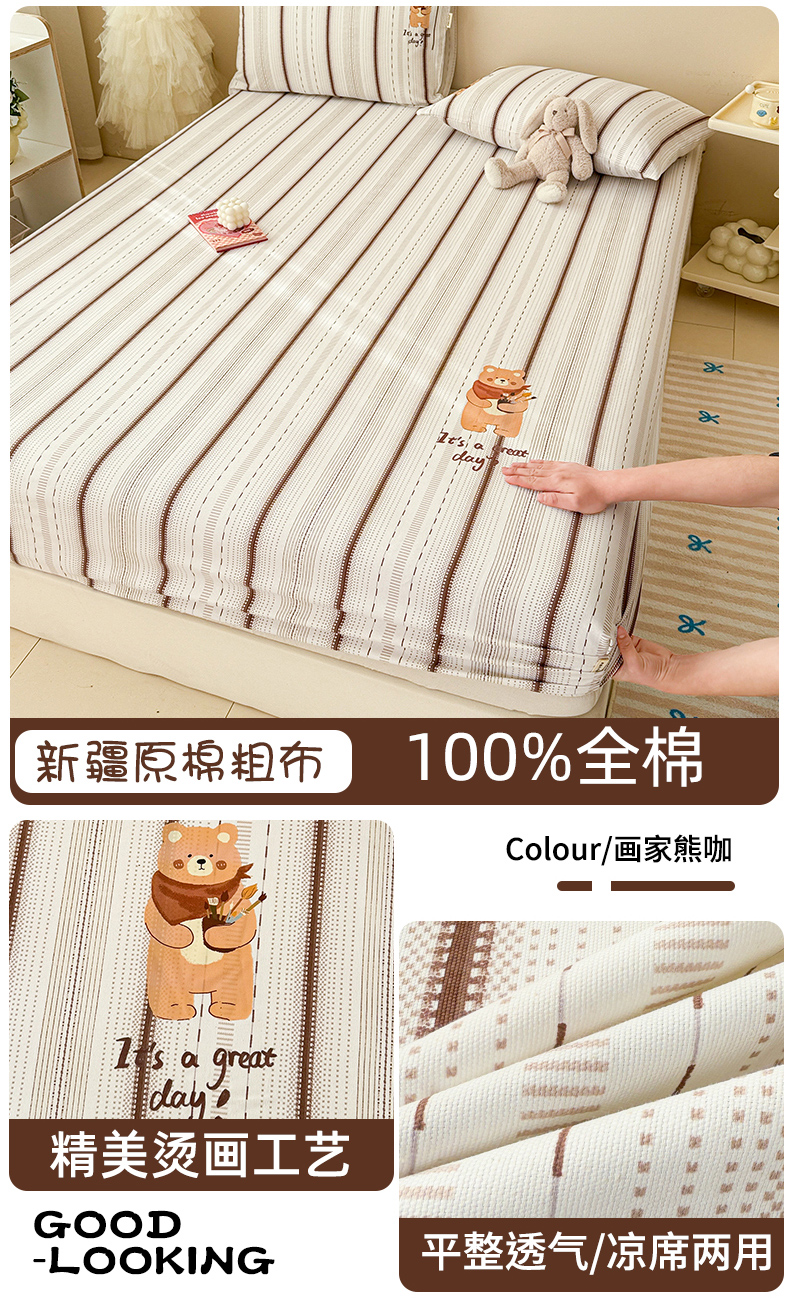 • 91家纺网 家纺一手货源 找家纺 沐辰 2025春夏新款A类全棉纯棉老粗布烫画单品床笠 床笠单件 画家熊-咖