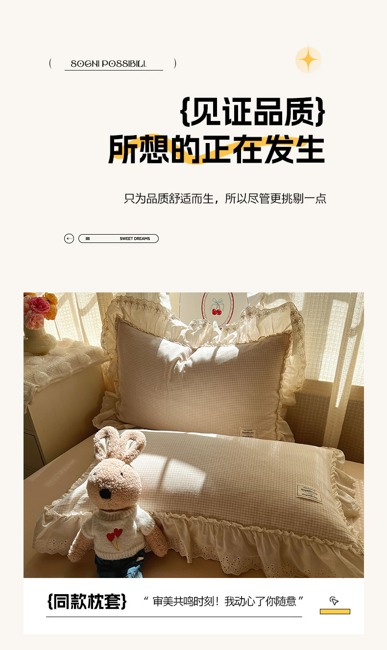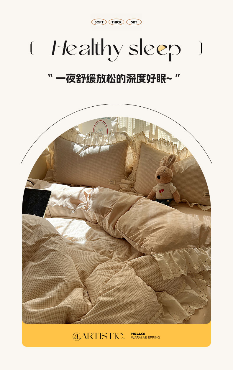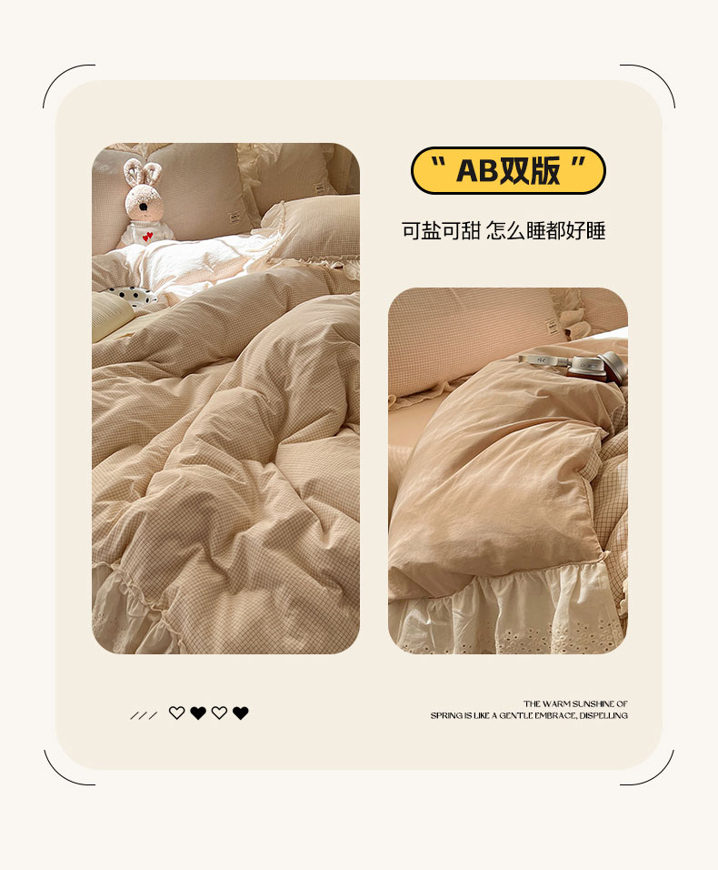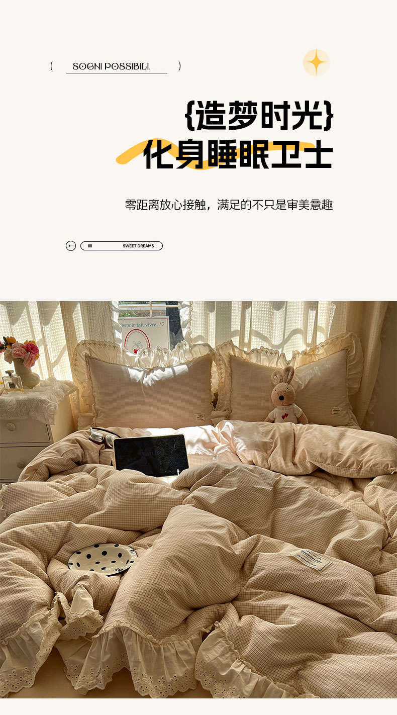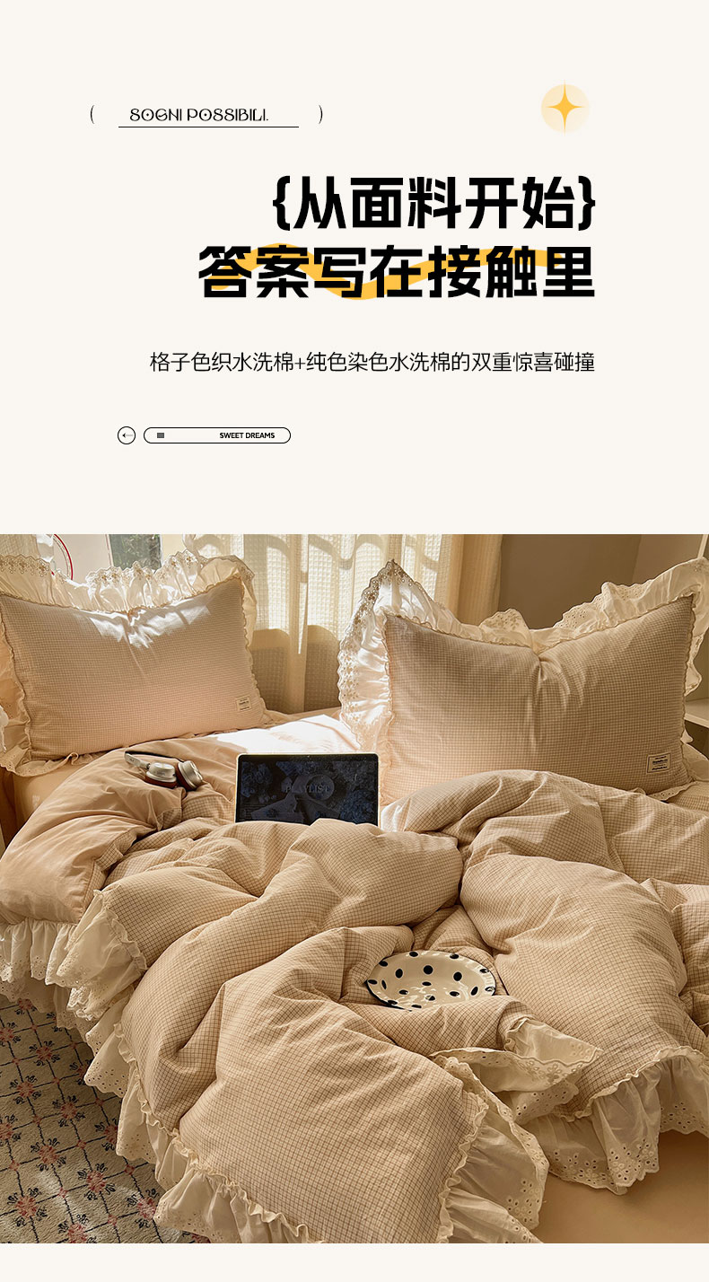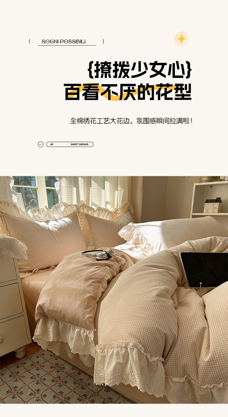 当前位置: 91家纺网 > 商品网购 > 床品套件 > 四件套 > 水洗棉四件套 > 六巷胡同 2025新款法式小清新全棉色织水洗棉花边款小格子四件套 花边加里咖格