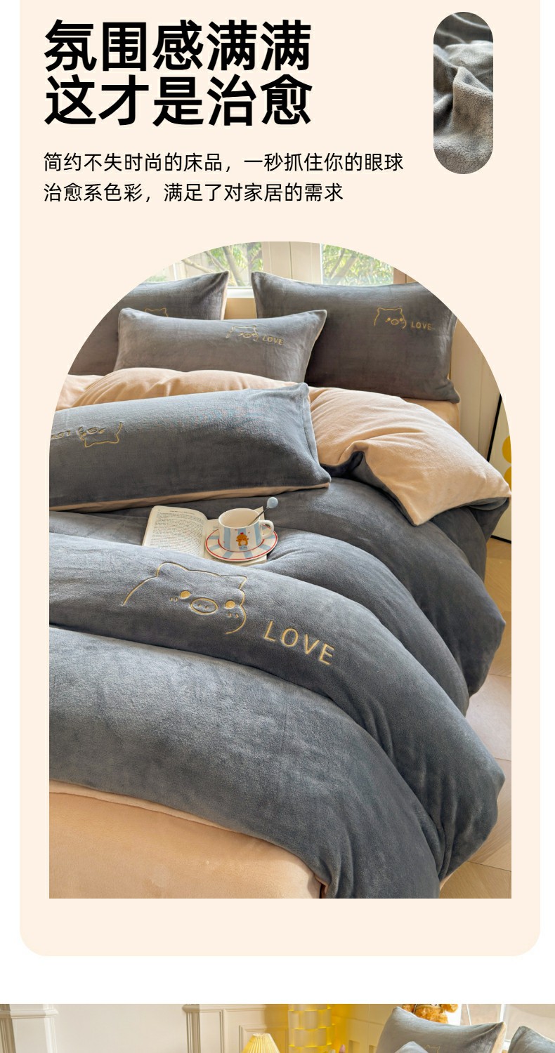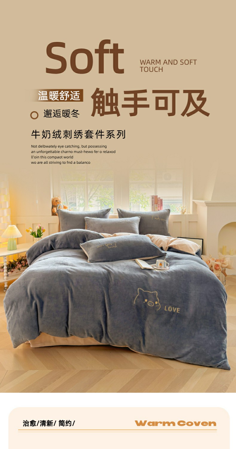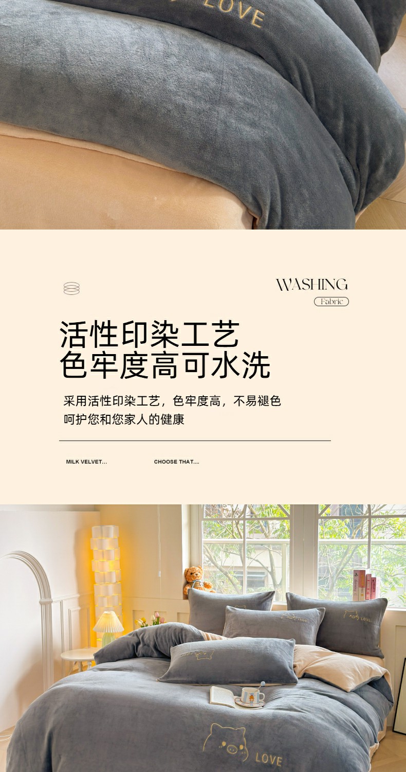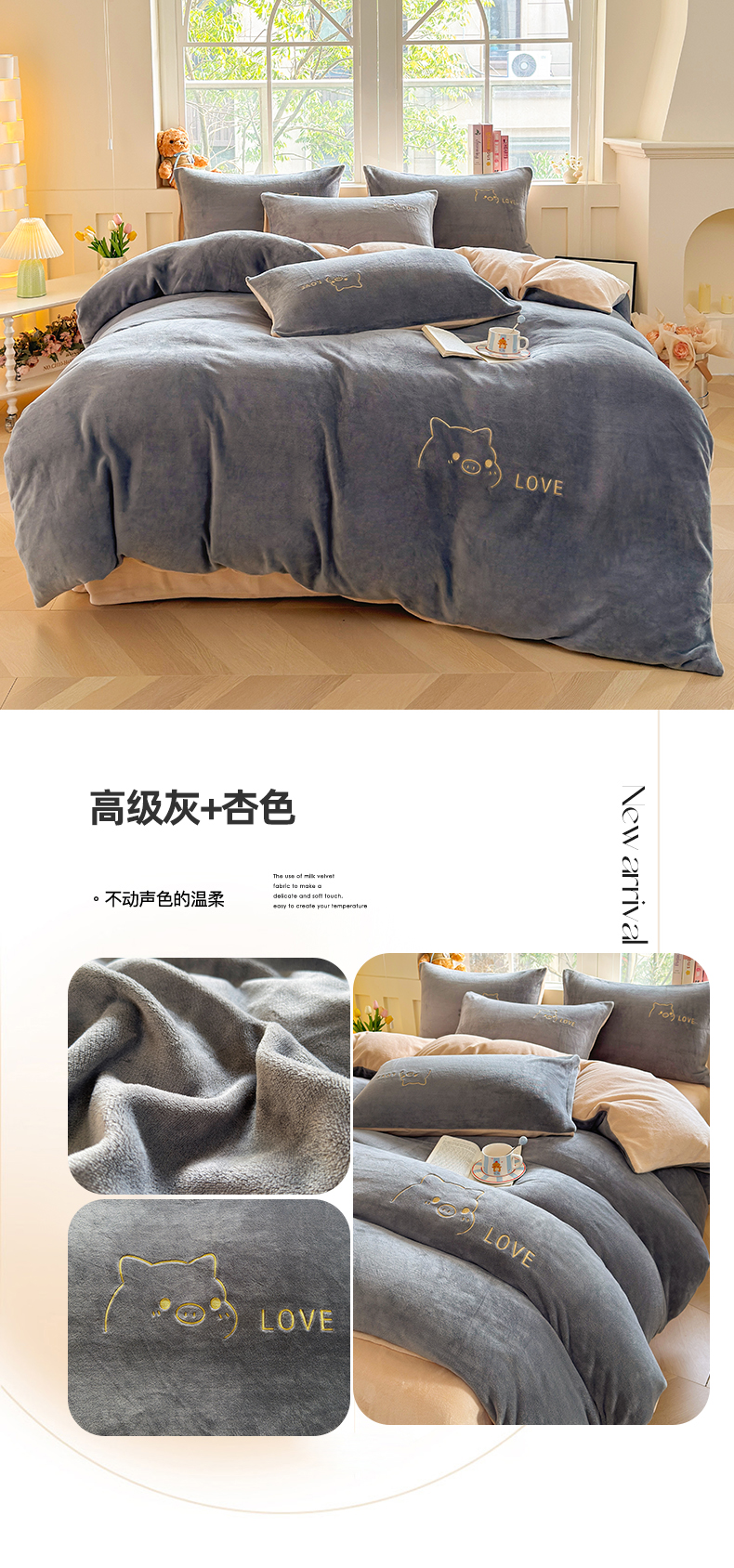(总)梦恬佳 2025新款亲肤舒适牛奶绒刺绣四件套,杏+米咖,豆沙+太空灰,高级灰,高级灰+杏色,奶白+新芽绿,奶白+樱花粉