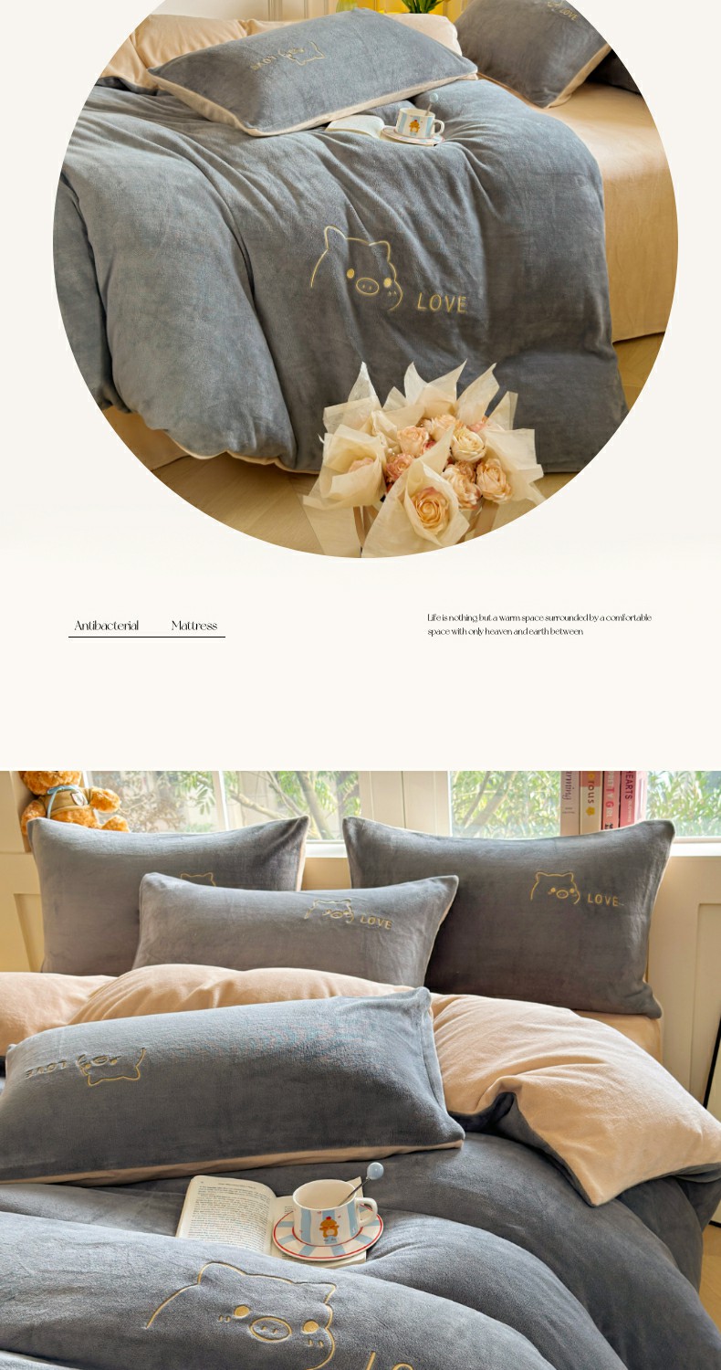 梦恬佳 2025新款亲肤舒适牛奶绒刺绣四件套 高级灰+杏色