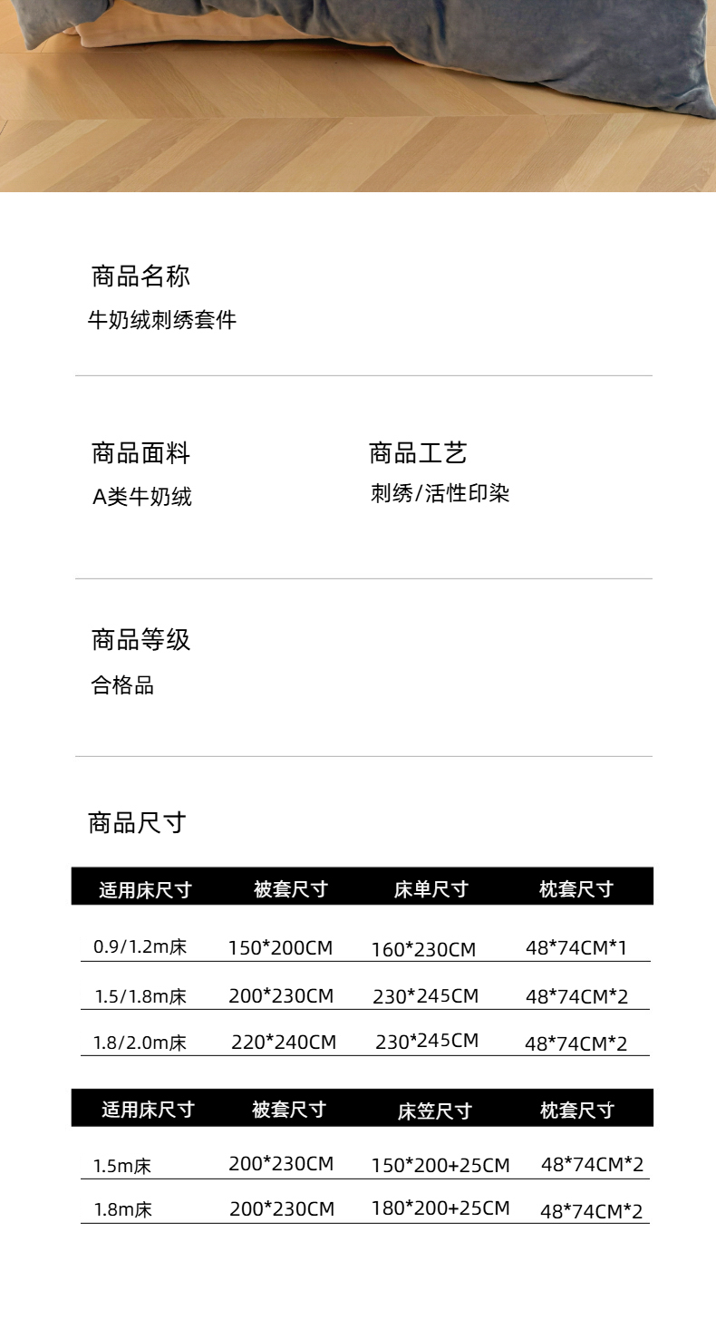 商品名称:梦恬佳 2025新款亲肤舒适牛奶绒刺绣四件套 高级灰+杏色