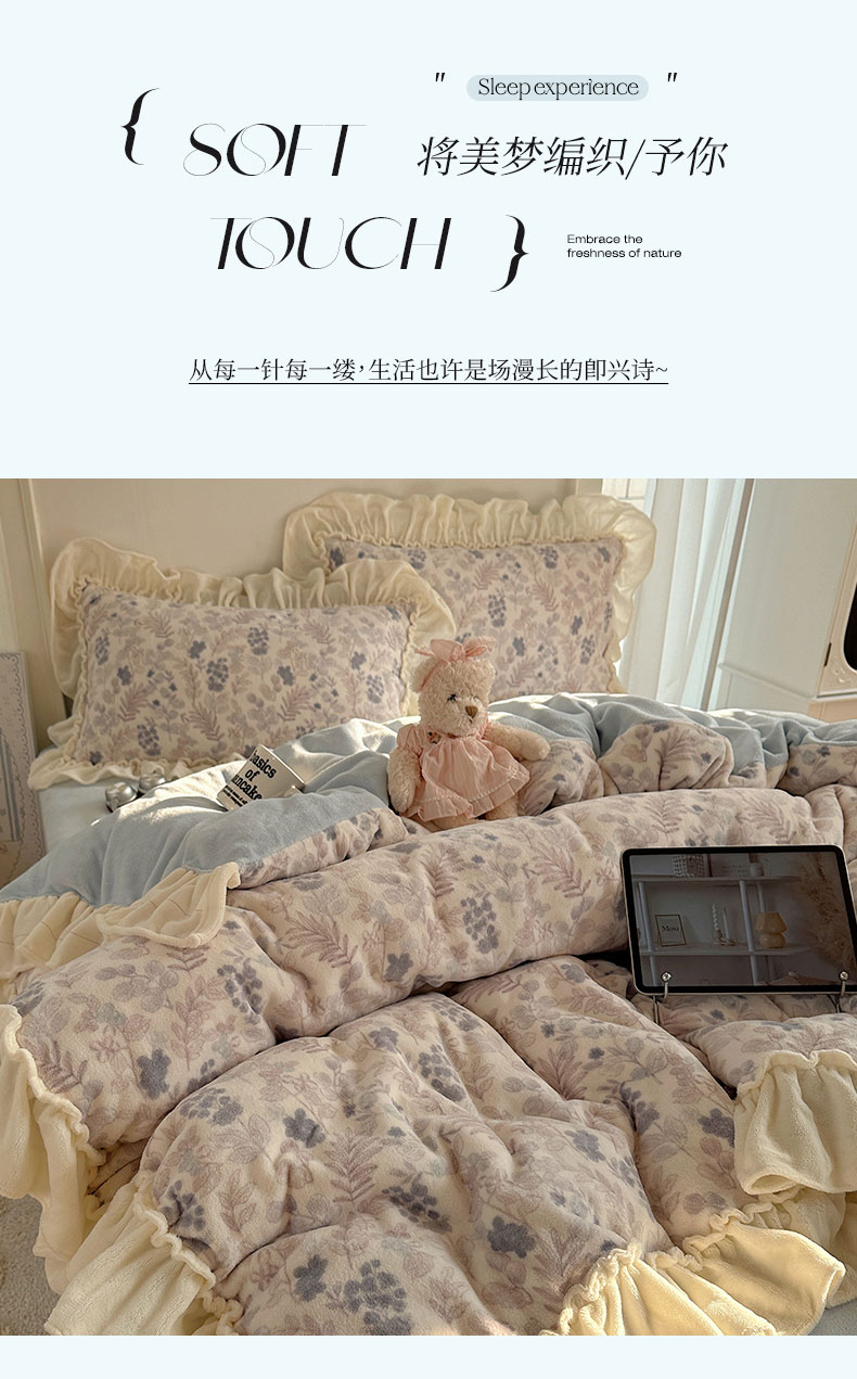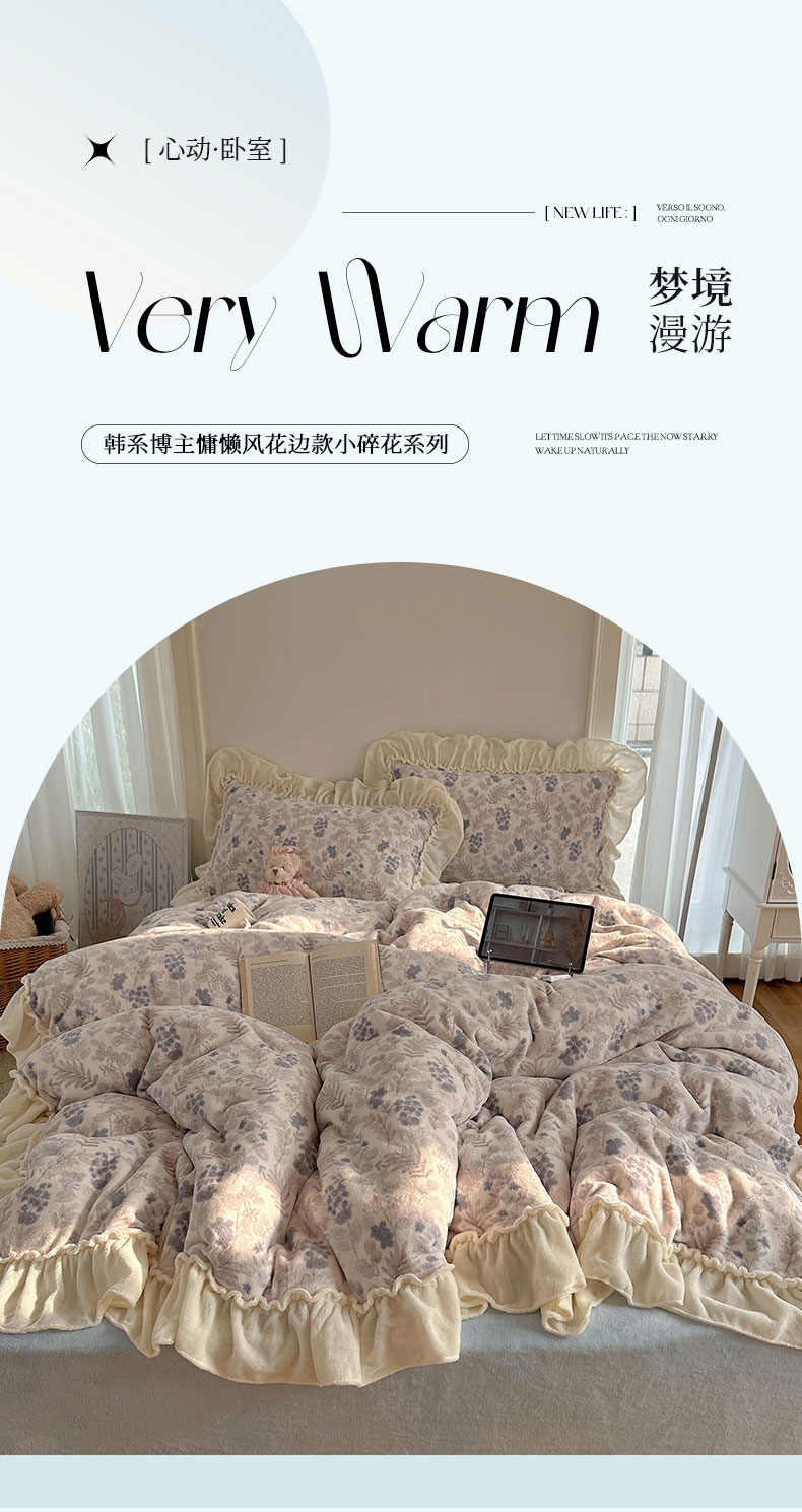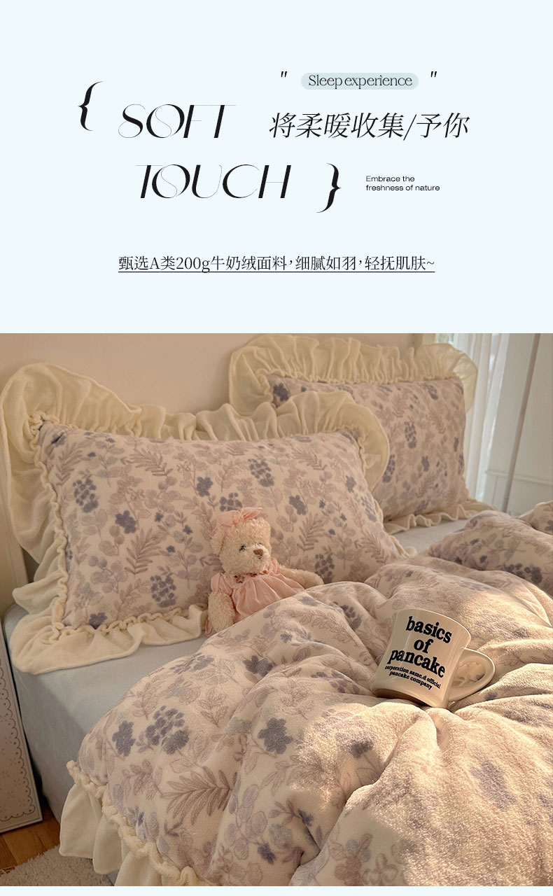 当前位置: 91家纺网 > 商品网购 > 床品套件 > 四件套 > 牛奶绒四件套 > 六巷胡同 2025新款韩系博主慵懒风小碎花A类牛奶绒花边款四件套 压花边-远山含黛