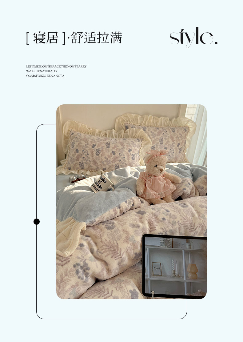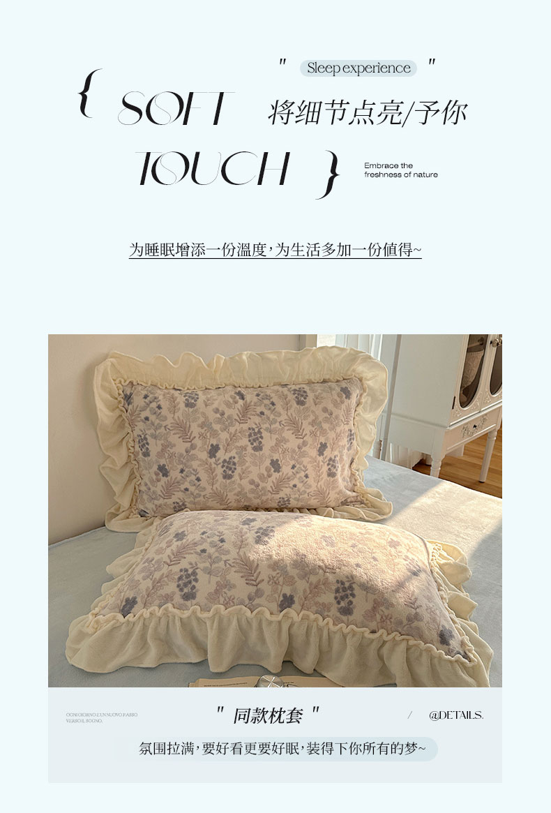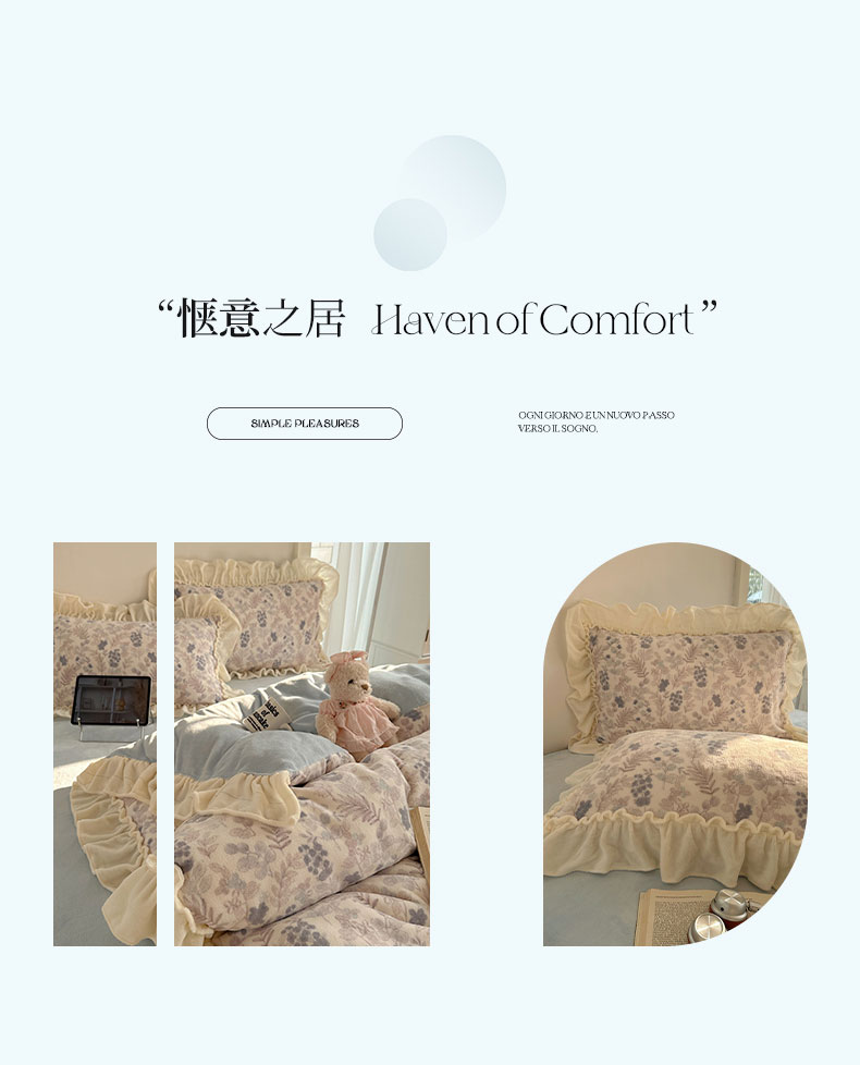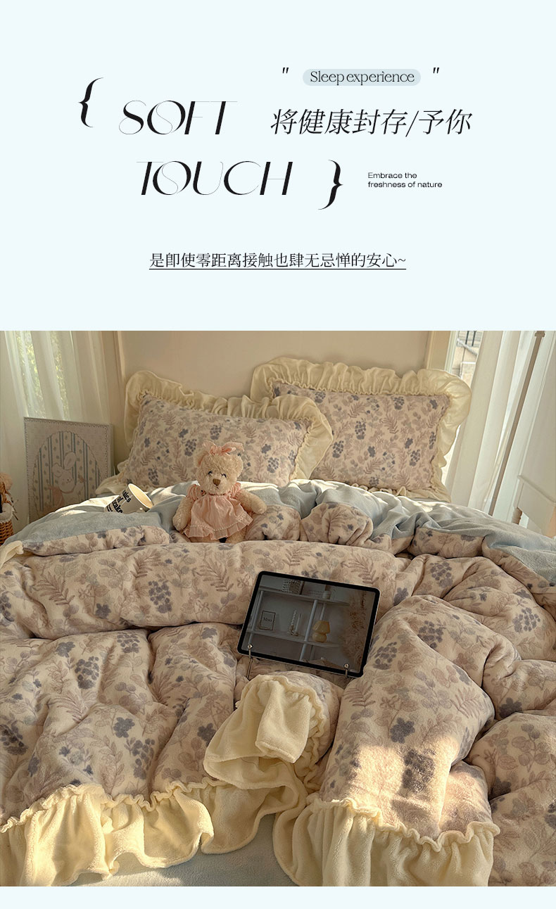 当前位置: 91家纺网 > 商品网购 > 床品套件 > 四件套 > 牛奶绒四件套 > 六巷胡同 2025新款韩系博主慵懒风小碎花A类牛奶绒花边款四件套 压花边-远山含黛