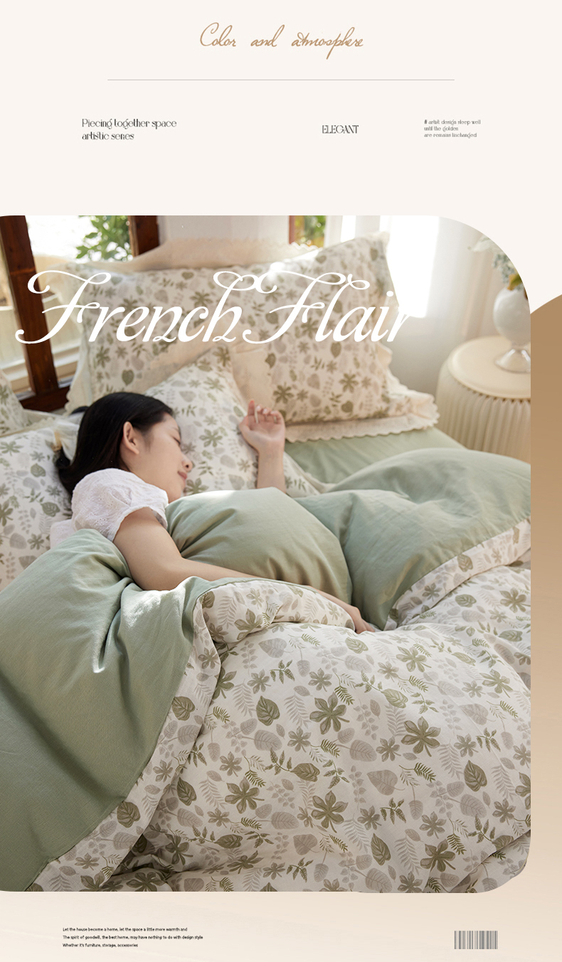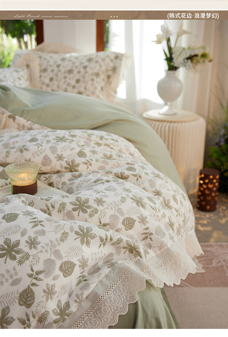 当前位置: 91家纺网 > 商品网购 > 床品套件 > 四件套 > 双层纱四件套 > 清雅福 2026春夏新品韩版全棉双层纱镂空花边系列四件套 芊叶
