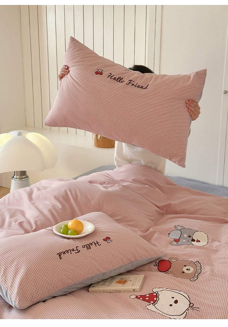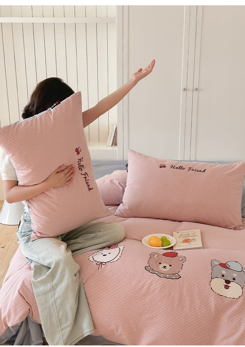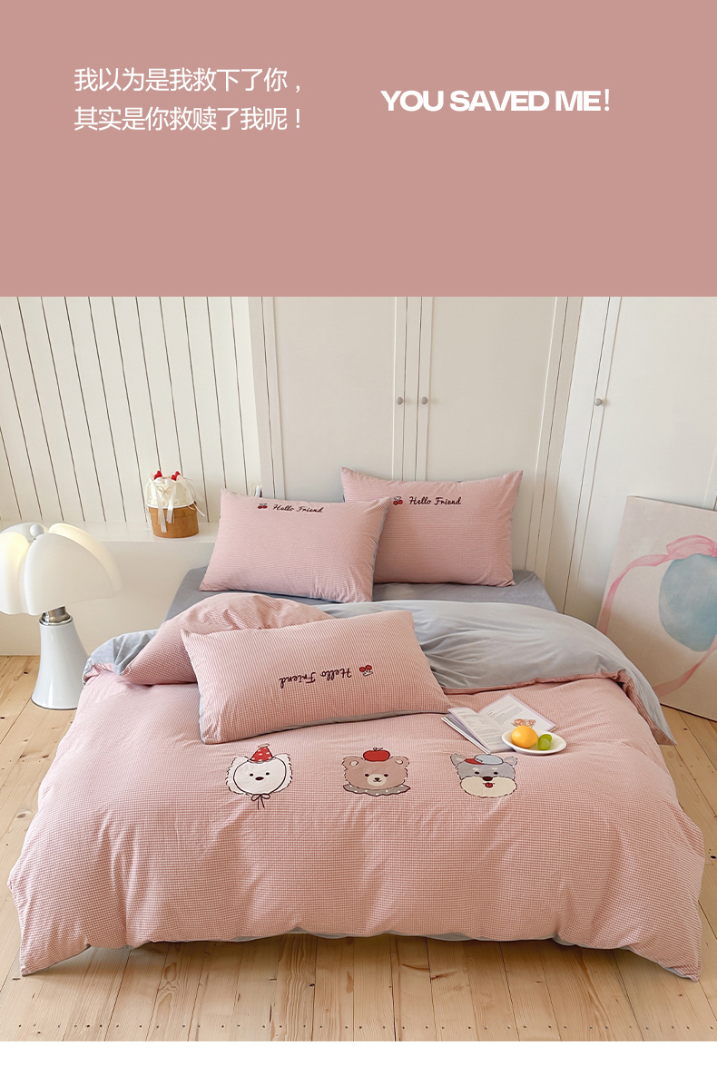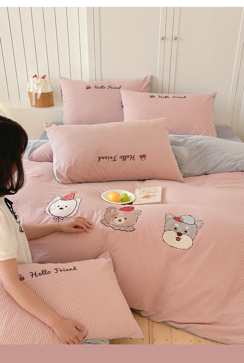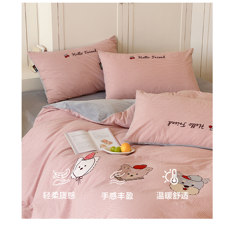 当前位置: 91家纺网 > 商品网购 > 床品套件 > 四件套 > 水洗棉四件套 > RYB红黄兰 2025新款设计师原创A面全棉色织水洗棉+B面婴儿绒贴布绣四件套 蜜格萌宠粉