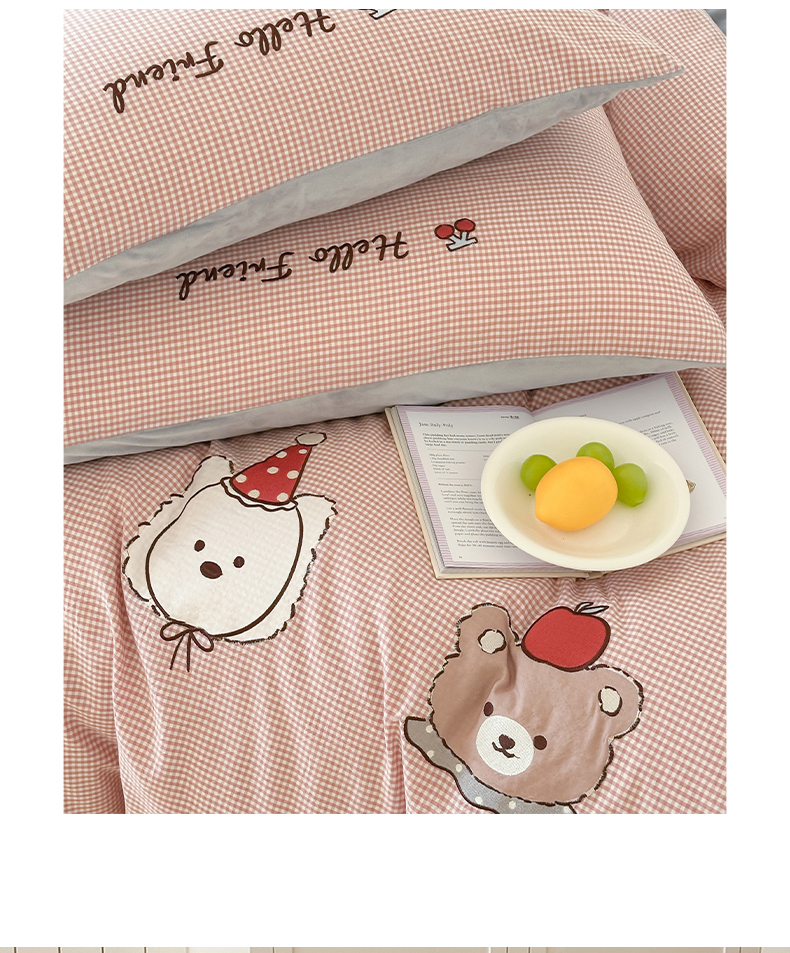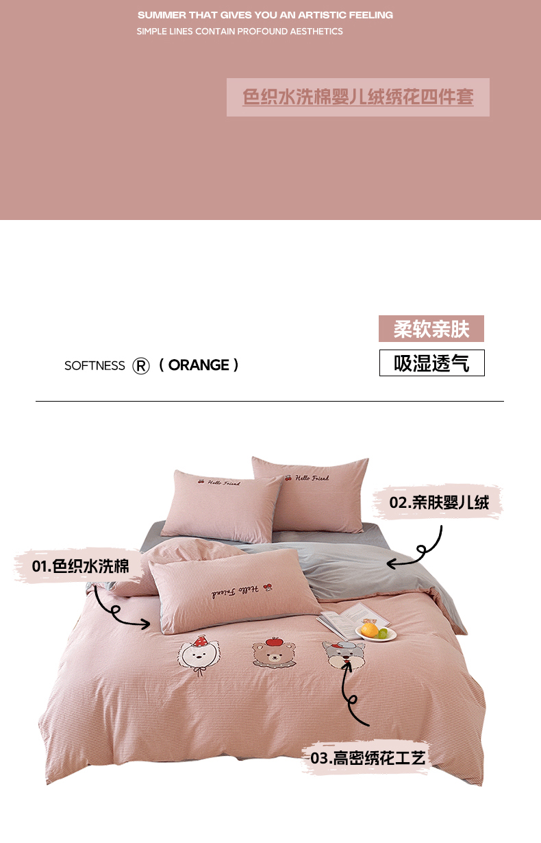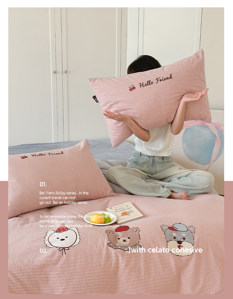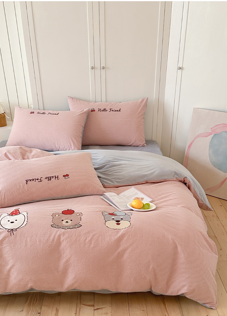 当前位置: 91家纺网 > 商品网购 > 床品套件 > 四件套 > 水洗棉四件套 > RYB红黄兰 2025新款设计师原创A面全棉色织水洗棉+B面婴儿绒贴布绣四件套 蜜格萌宠粉