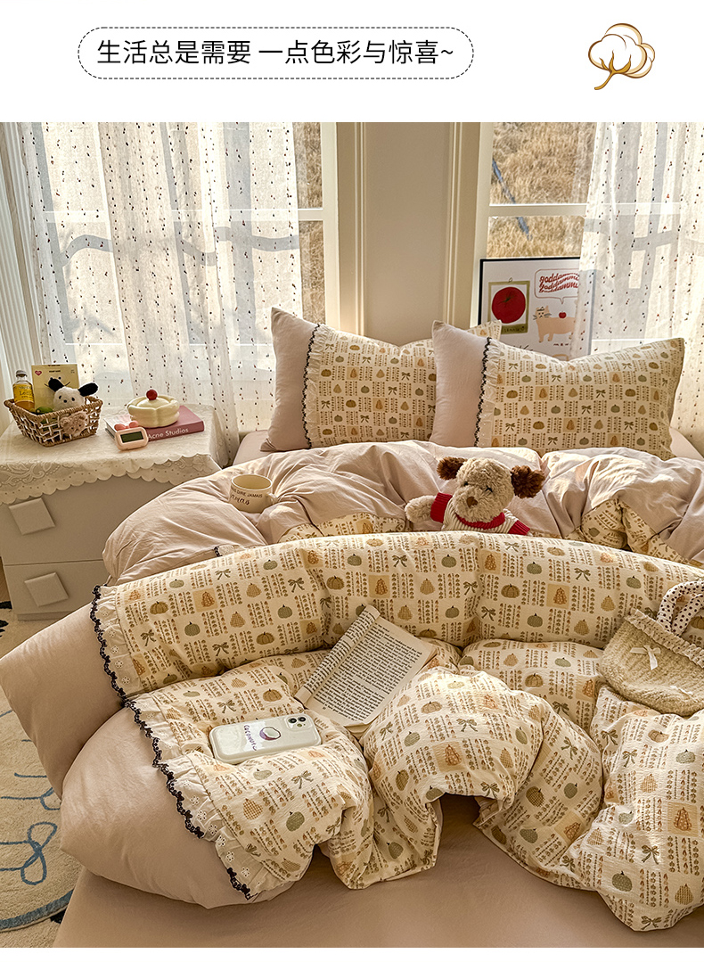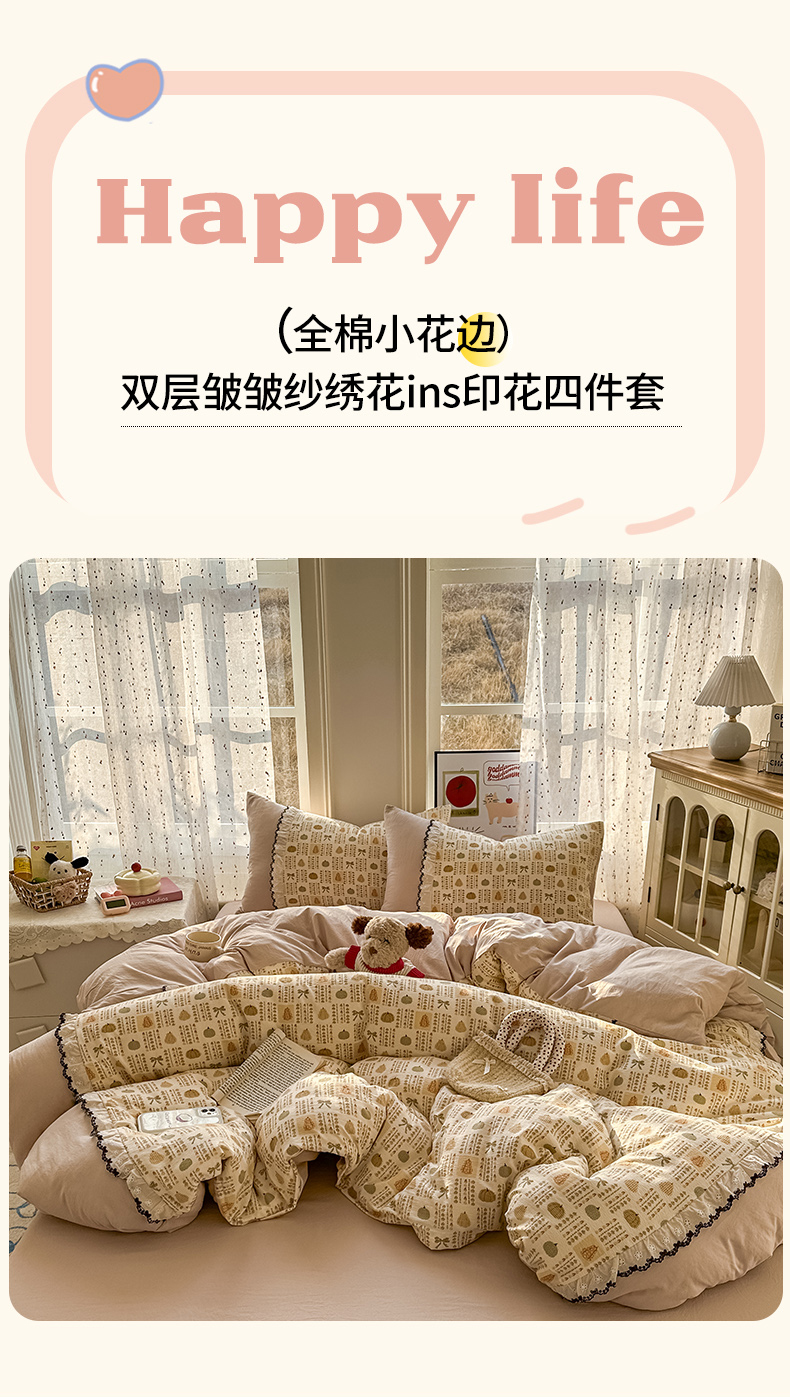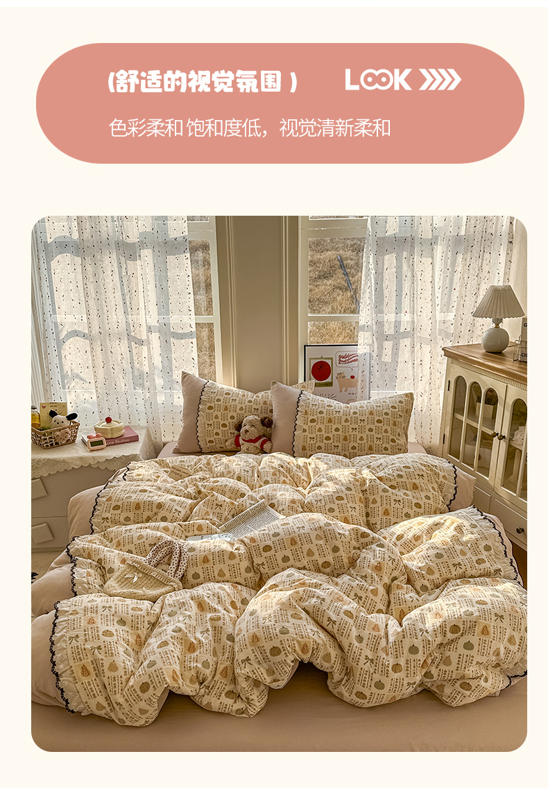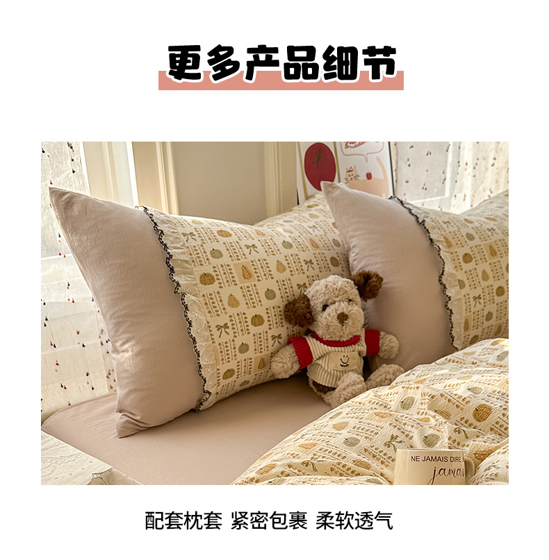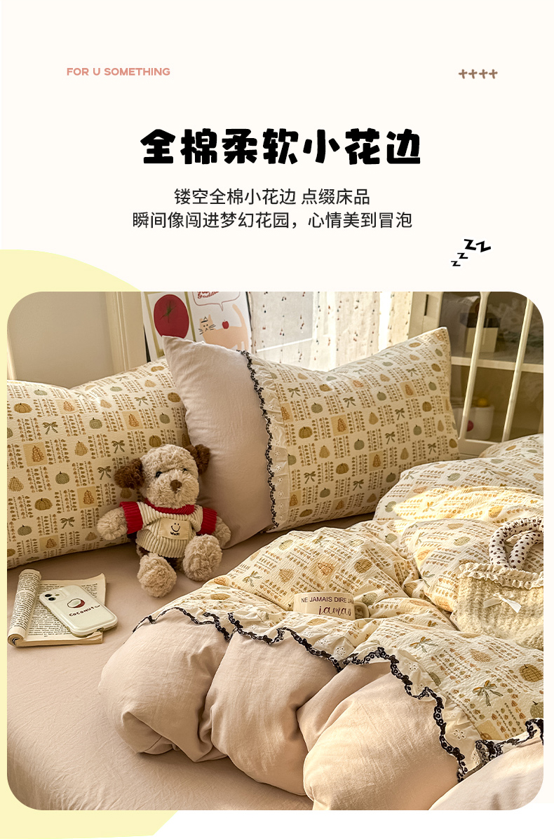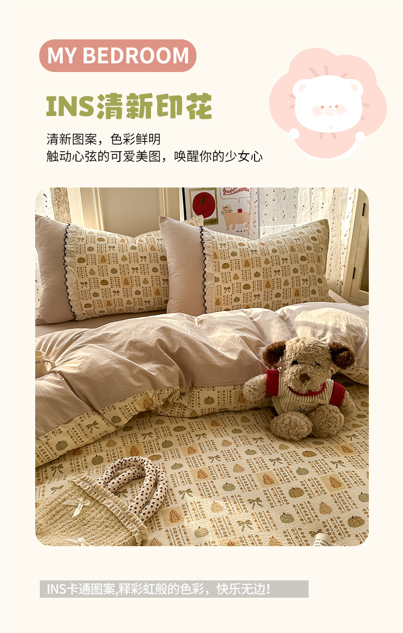 当前位置: 91家纺网 > 商品网购 > 床品套件 > 四件套 > 水洗棉四件套 > 贝凯瑞 2026新款小花边水洗棉绣花ins小清新床单床裙床笠四件套 水果派对