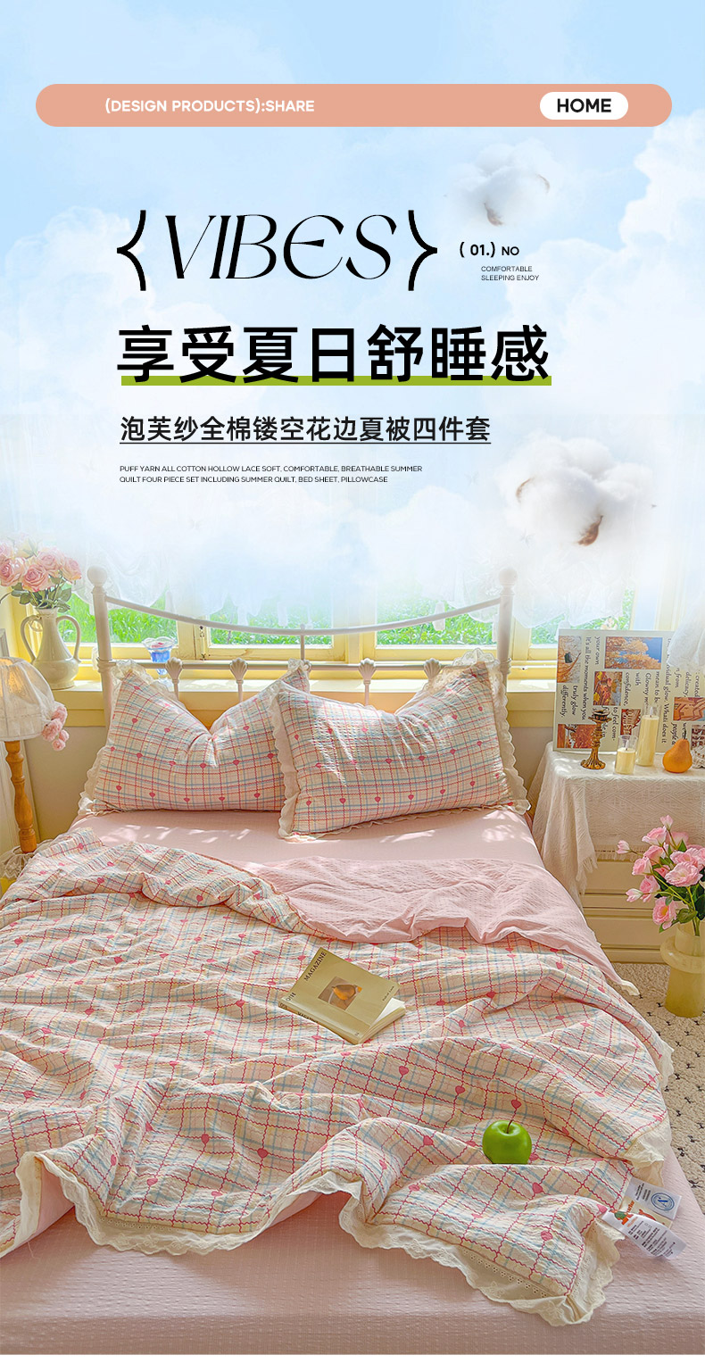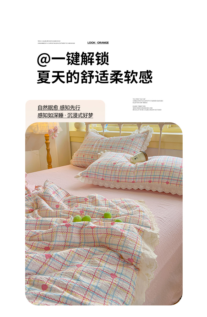 商品名称:金梦拉家纺 2026新款全棉花边系列泡芙纱泡泡纱夏被夏凉被空调被四件套 格格心动