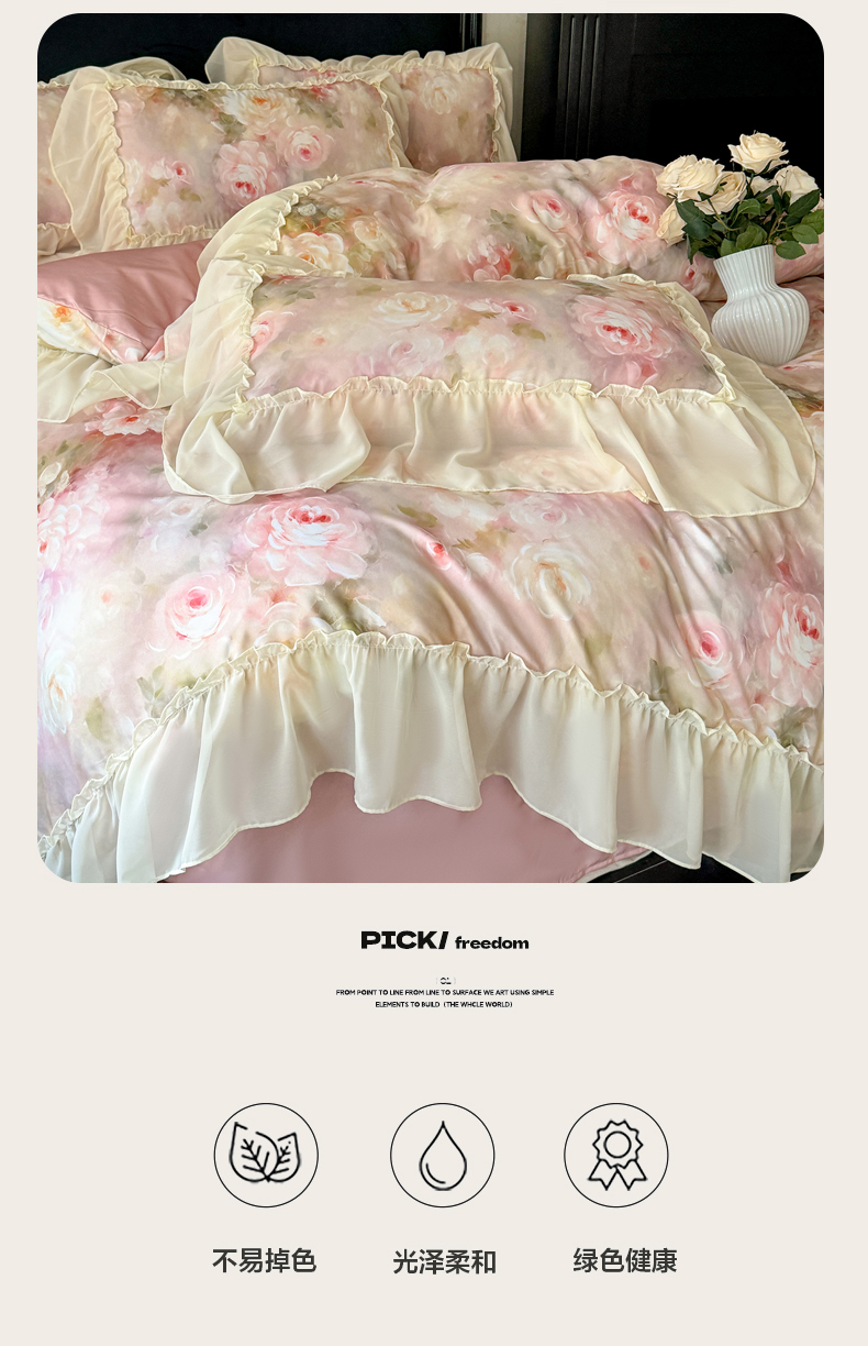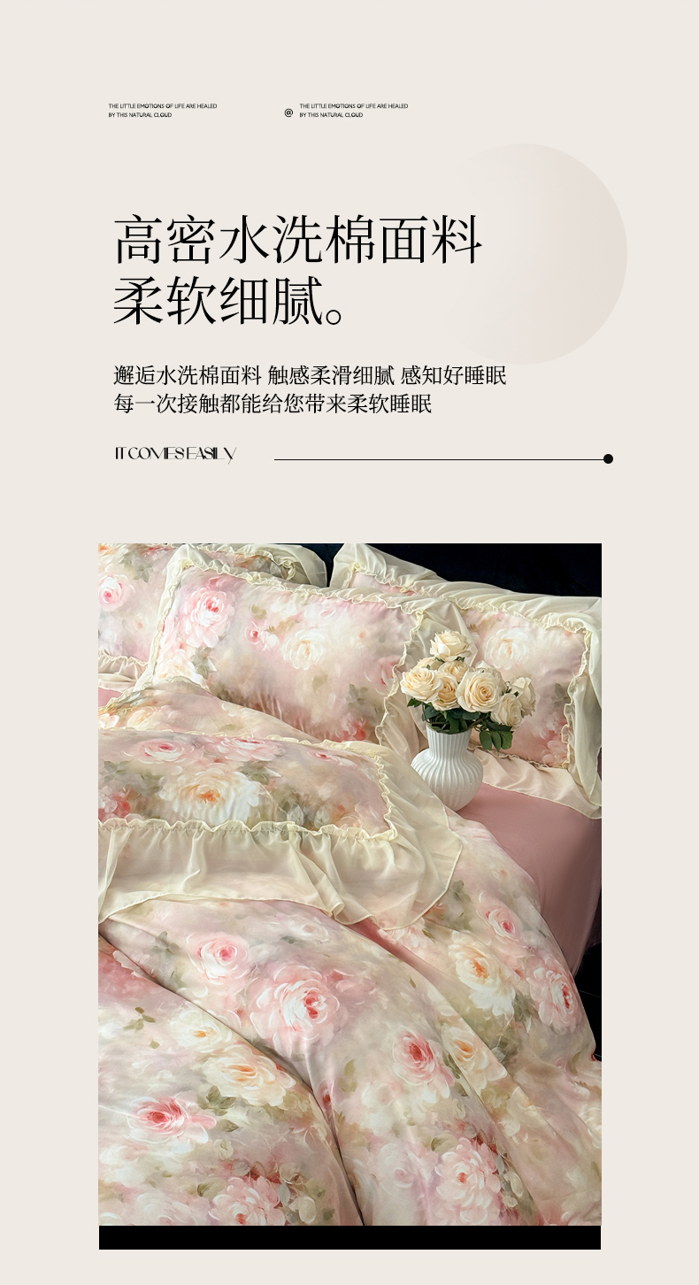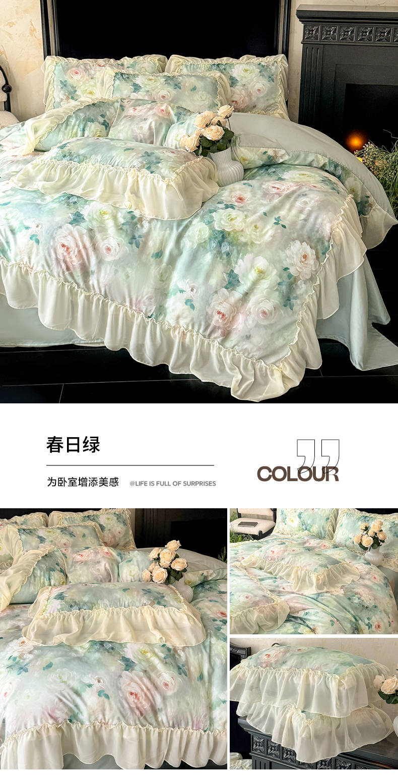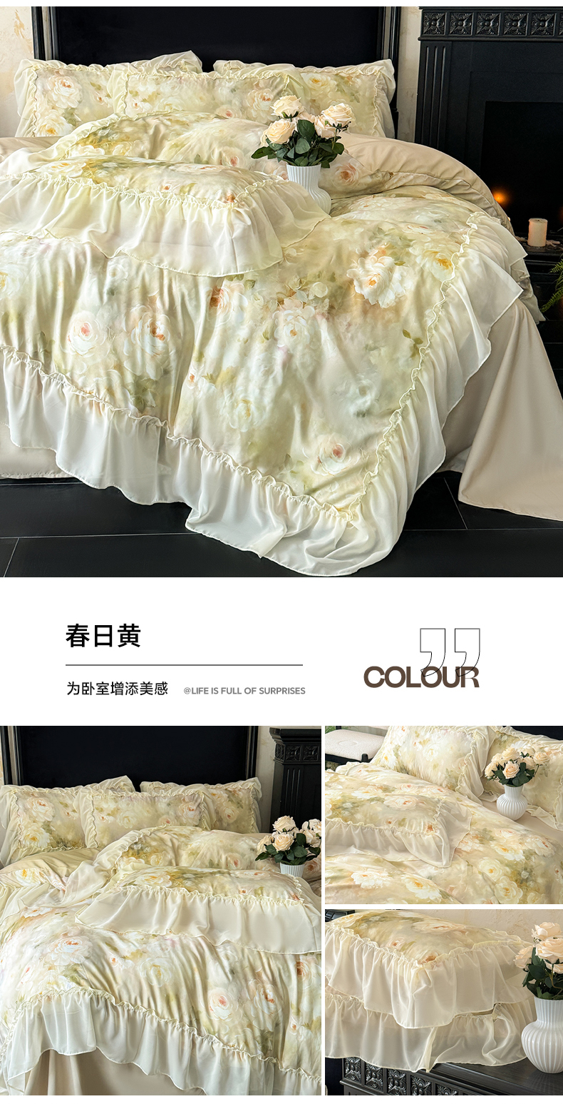 当前位置: 91家纺网 > 商品网购 > 床品套件 > 四件套 > 其它四件套 > (总)你好美丽 2025新款高克重数码印花水洗棉蕾丝四件套-春日