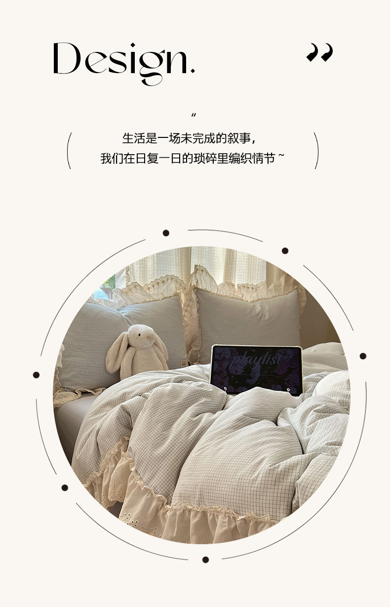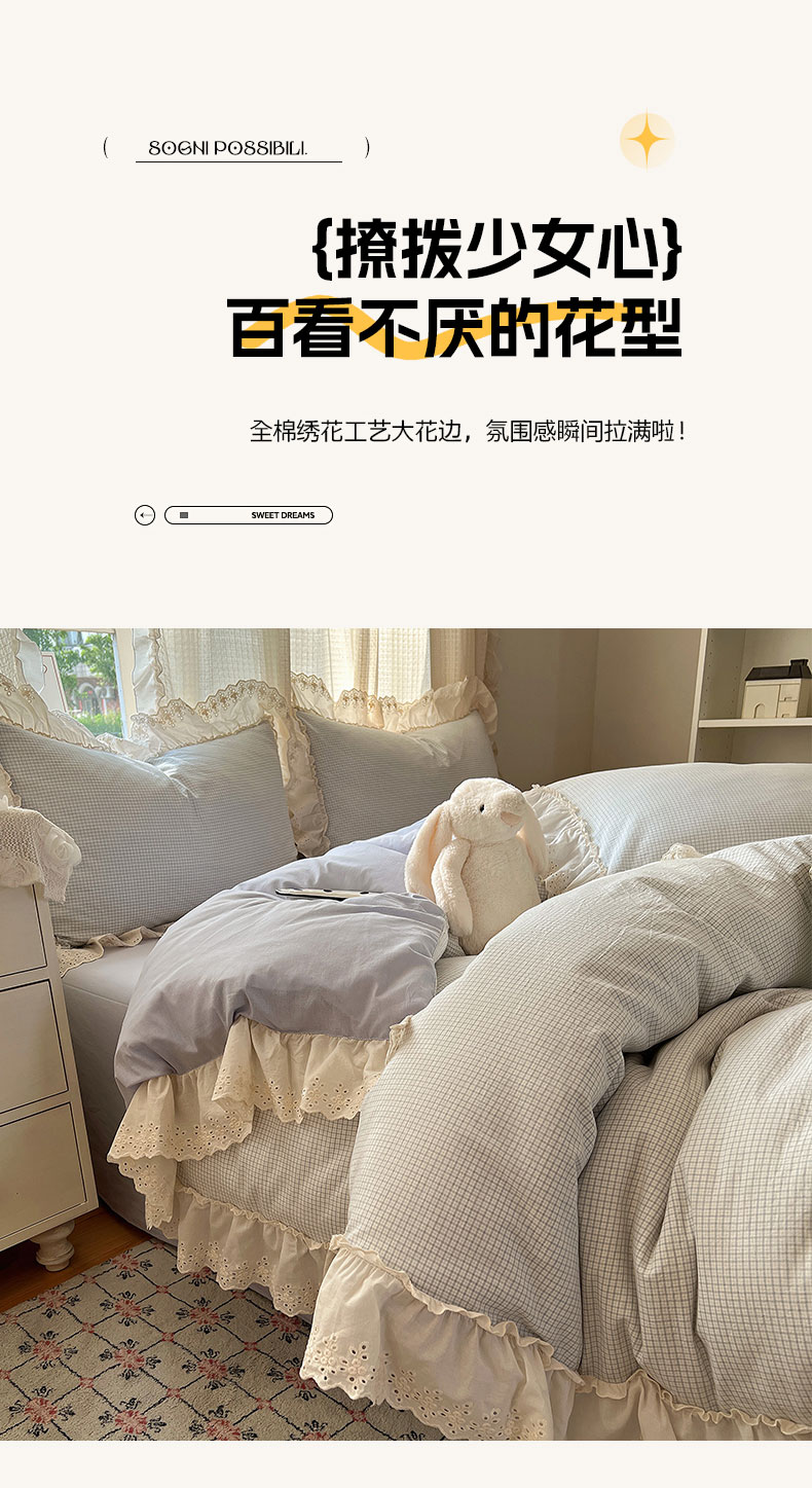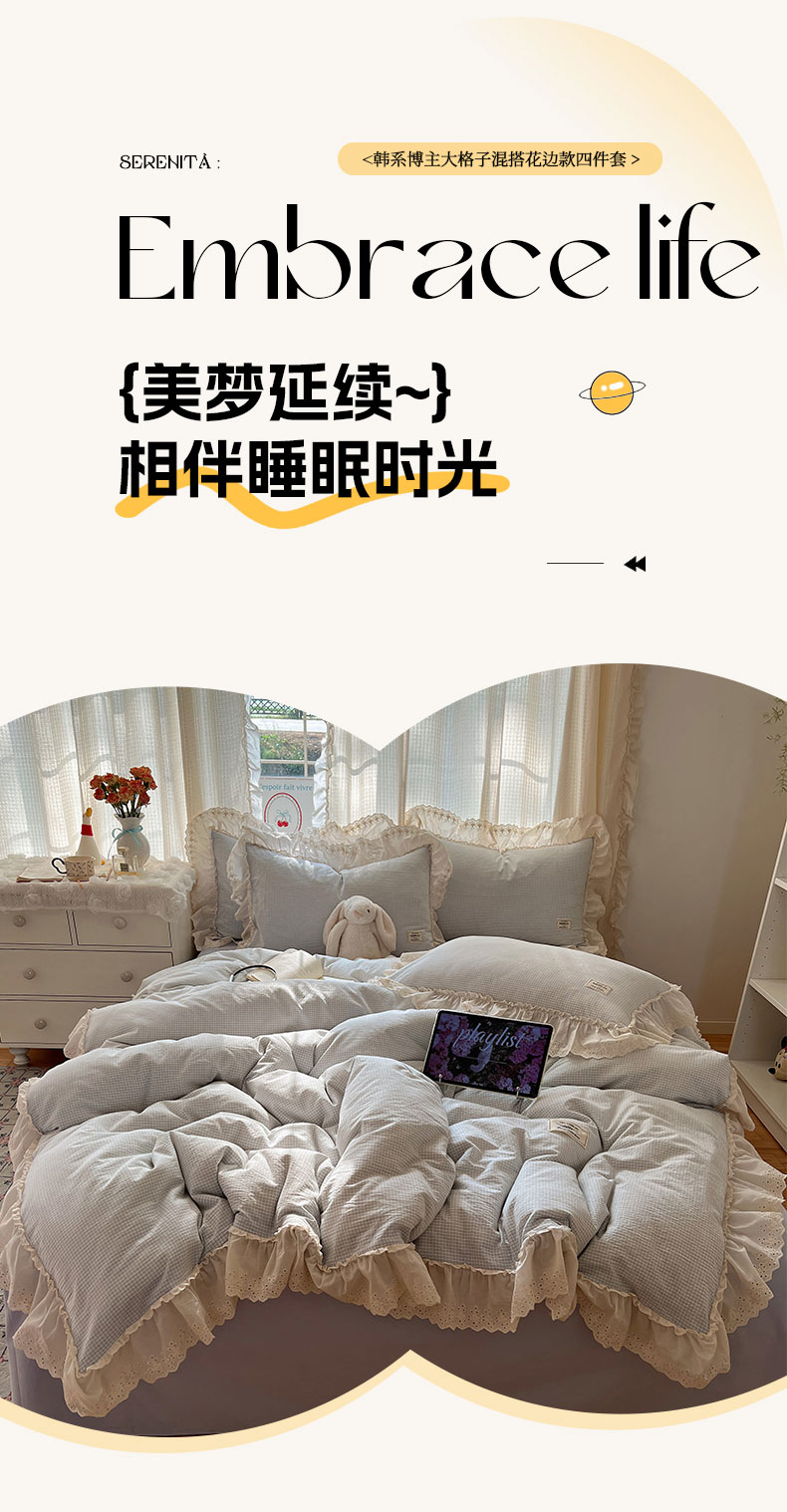 当前位置: 91家纺网 > 商品网购 > 床品套件 > 四件套 > 水洗棉四件套 > 六巷胡同 2025新款法式小清新全棉色织水洗棉花边款小格子四件套 花边维尔蓝格