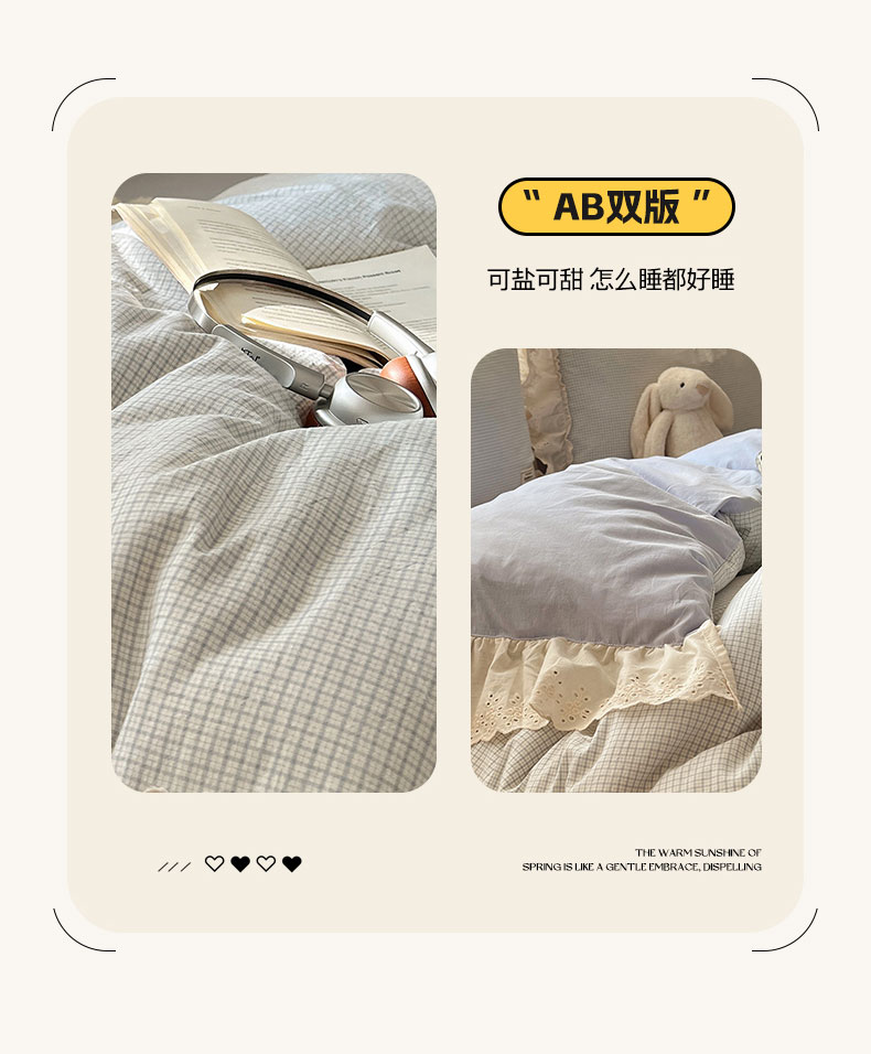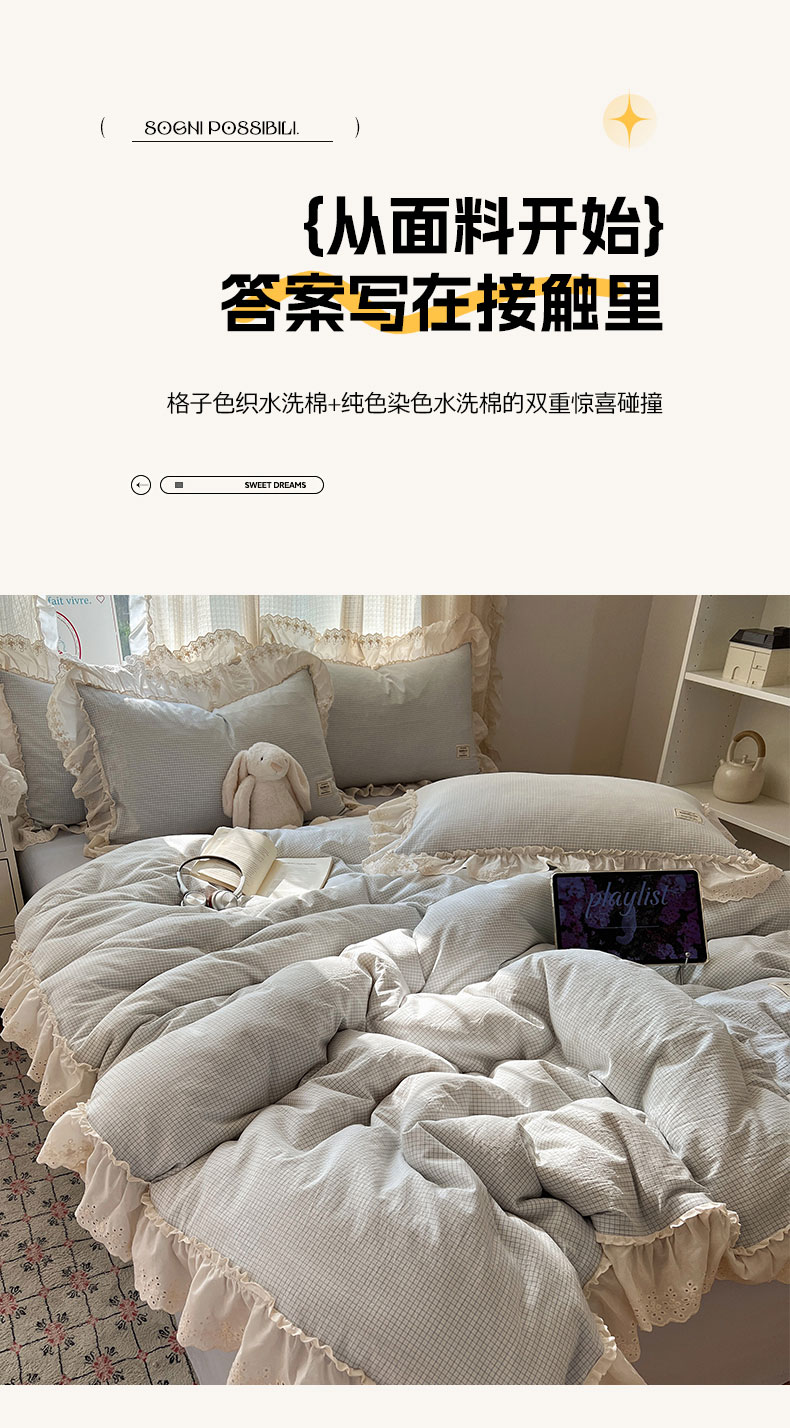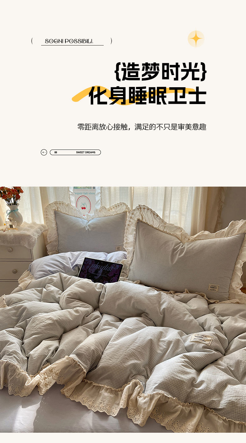 当前位置: 91家纺网 > 商品网购 > 床品套件 > 四件套 > 水洗棉四件套 > 六巷胡同 2025新款法式小清新全棉色织水洗棉花边款小格子四件套 花边维尔蓝格