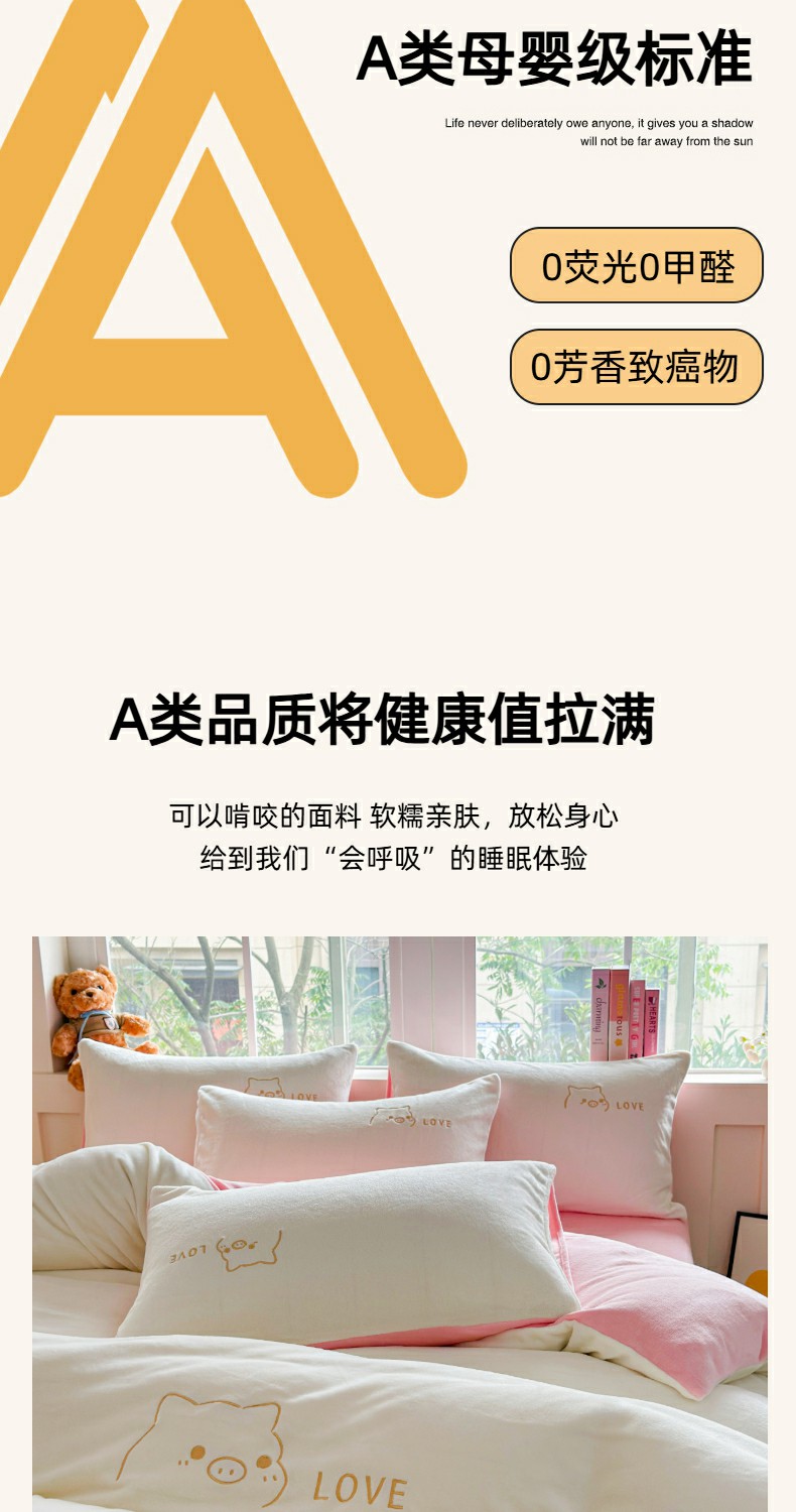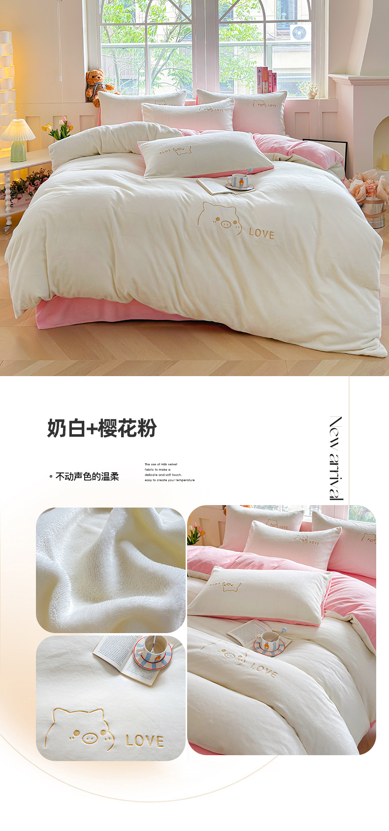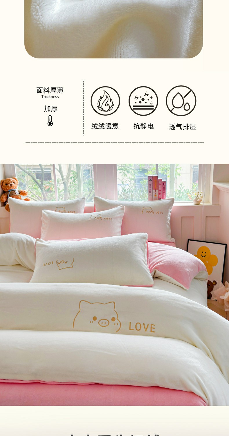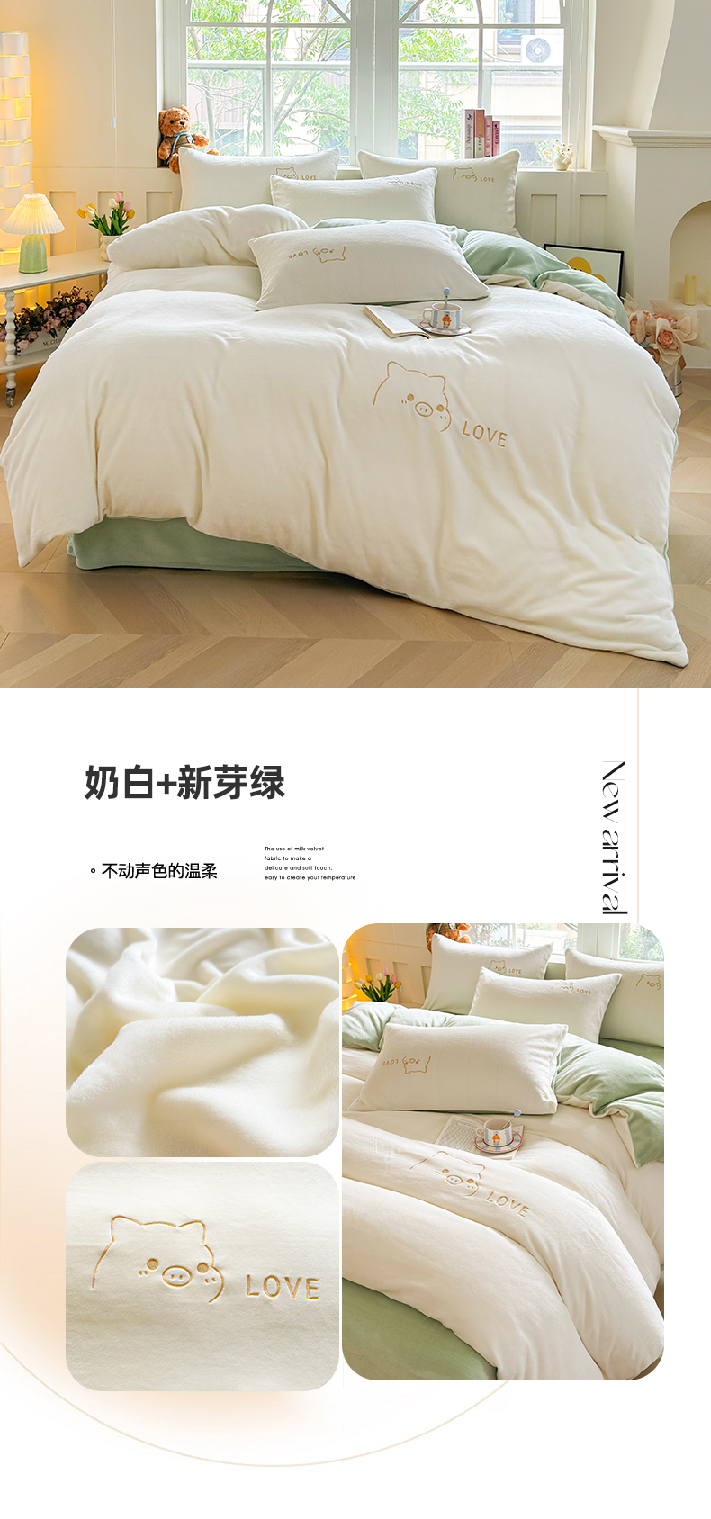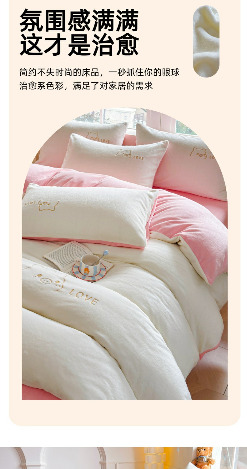 (总)梦恬佳 2025新款亲肤舒适牛奶绒刺绣四件套,杏+米咖,豆沙+太空灰,高级灰,高级灰+杏色,奶白+新芽绿,奶白+樱花粉