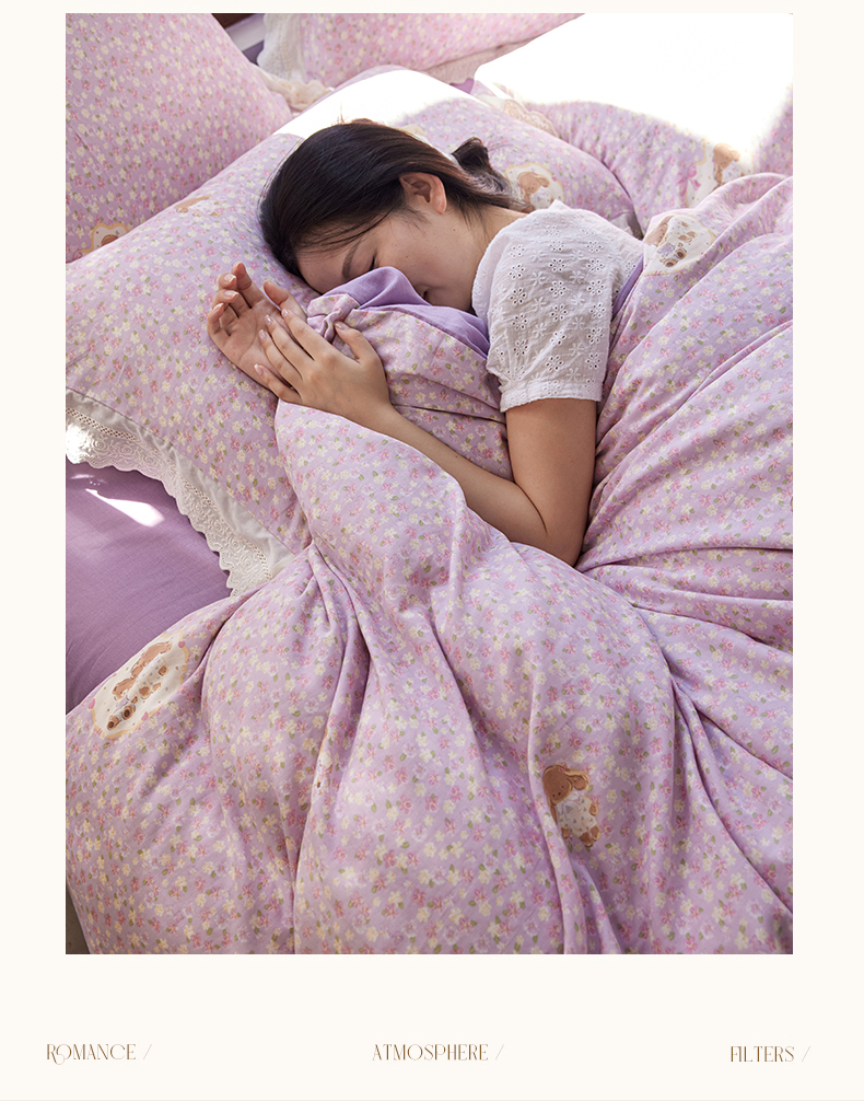 当前位置: 91家纺网 > 商品网购 > 床品套件 > 四件套 > 双层纱四件套 > 清雅福 2026春夏新品韩版全棉双层纱镂空花边系列四件套 粉色回忆-紫