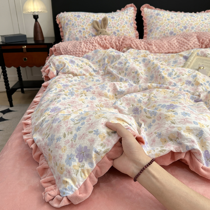 (总)仟网汇 2025新款热款剪花绒毛毛球绒水晶绒四件套,粉色