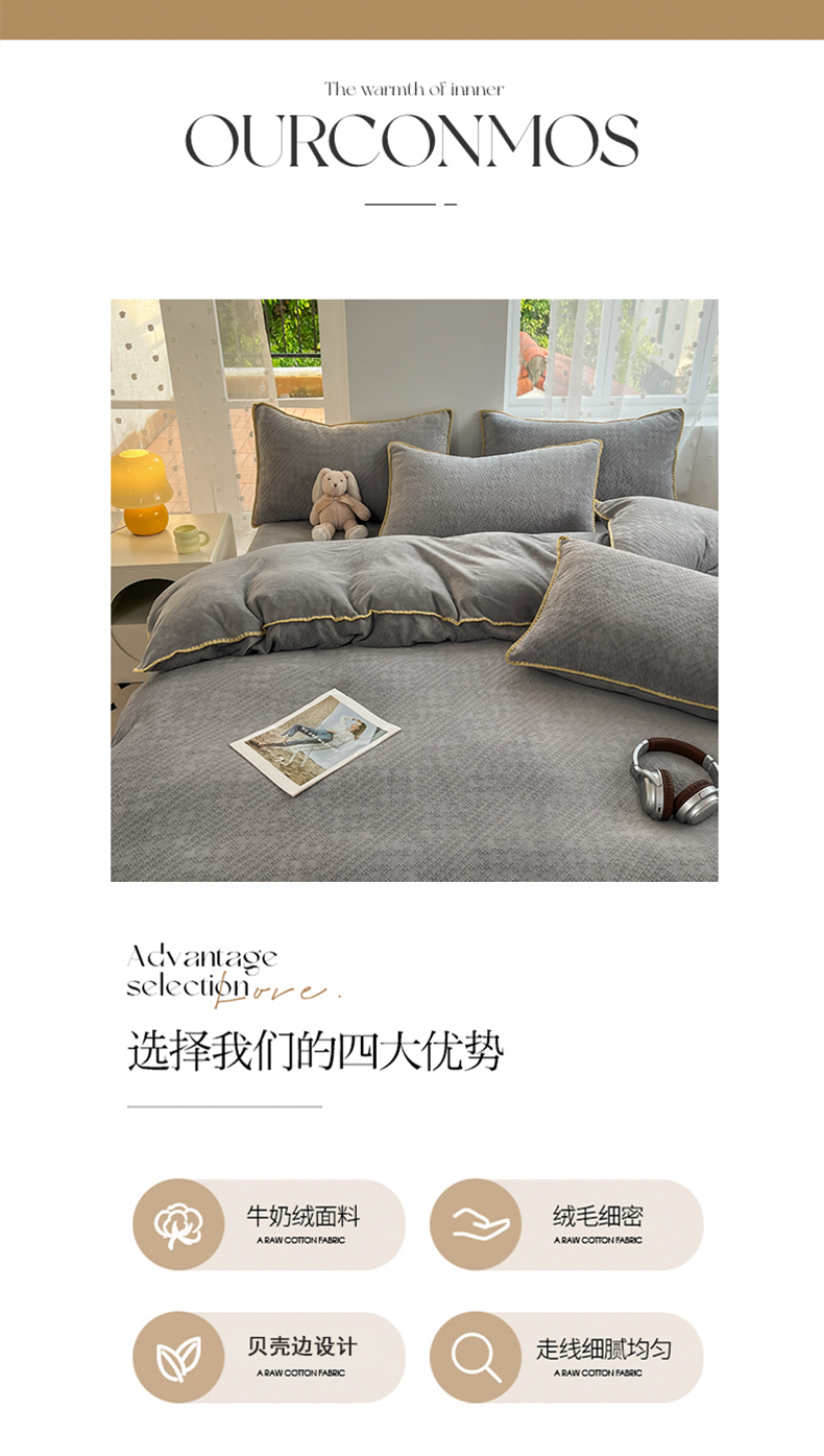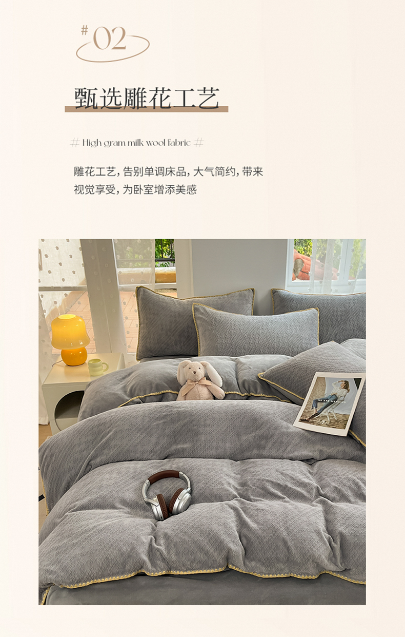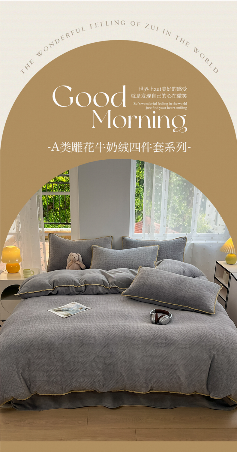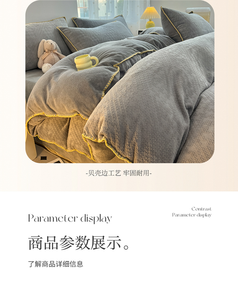 当前位置: 91家纺网 > 商品网购 > 床品套件 > 四件套 > 牛奶绒四件套 > 晚依家纺 2024新款230g纯色立体雕花牛奶绒四件套贝壳边加厚保暖定制定做 语格-石英灰
