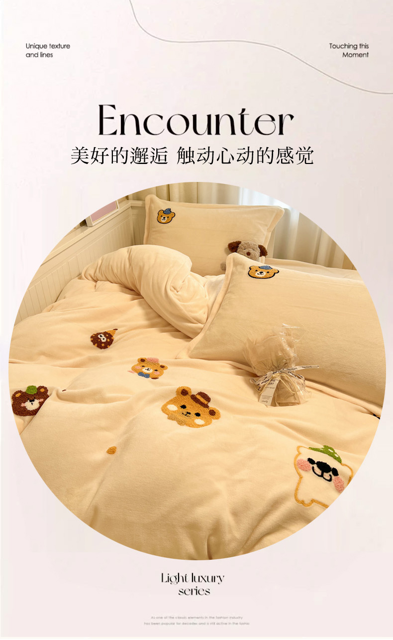 绒小宣 高克重牛奶绒印花四件套,富贵一生,含羞草,满庭芳,萌萌兔,情定一生,仙仙兔,向阳花语,幸运花束,一生有你