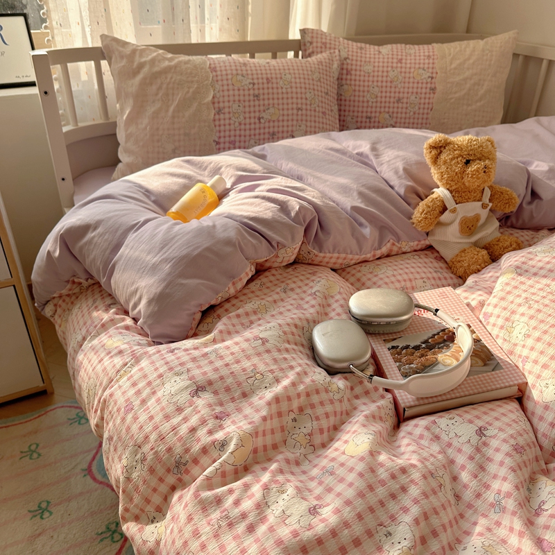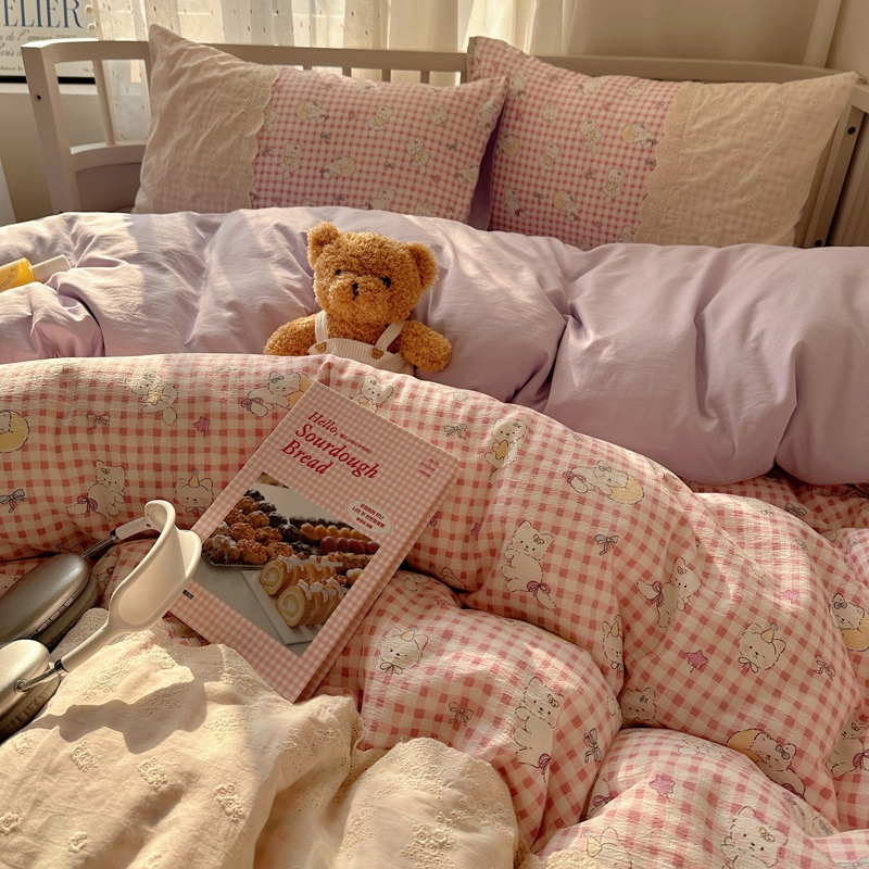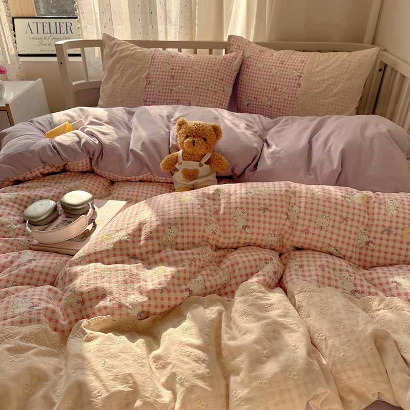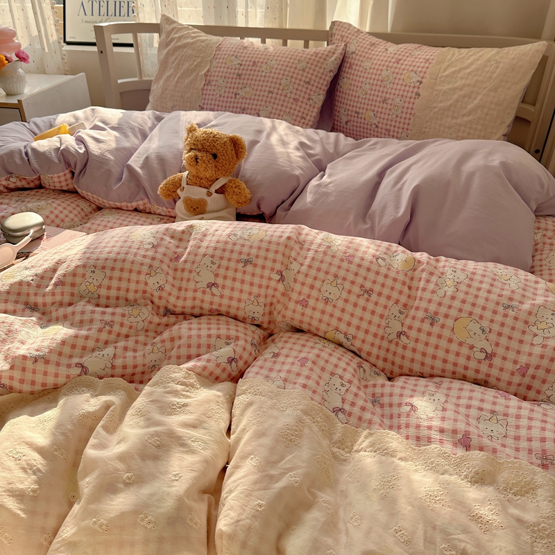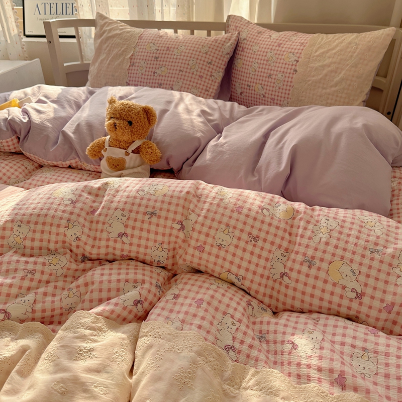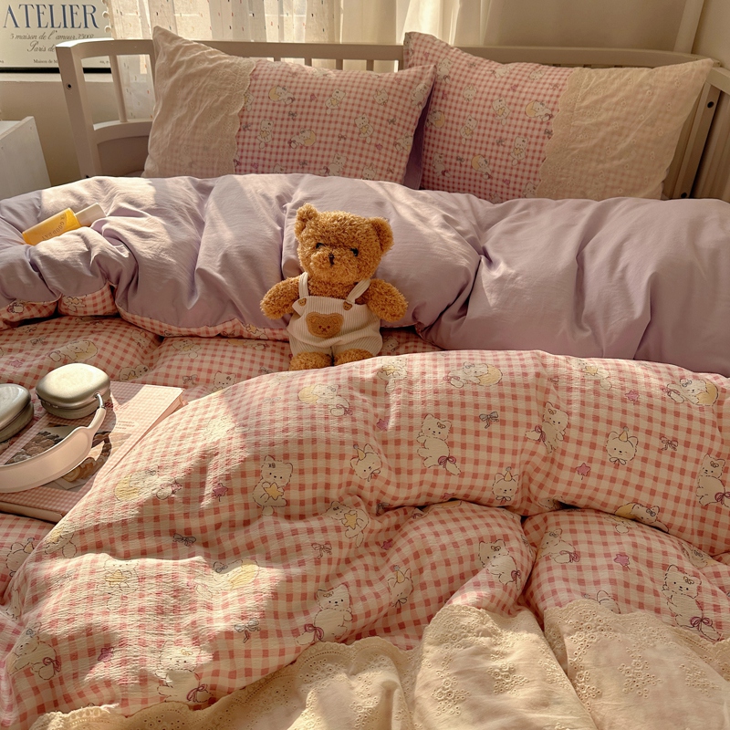 商品名称:顾里2025新款蕾丝花边云感双层纱套件四件套 粉格奶猫
