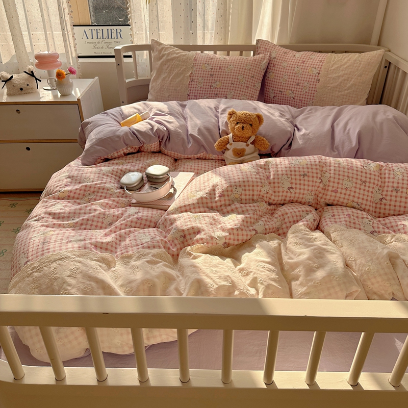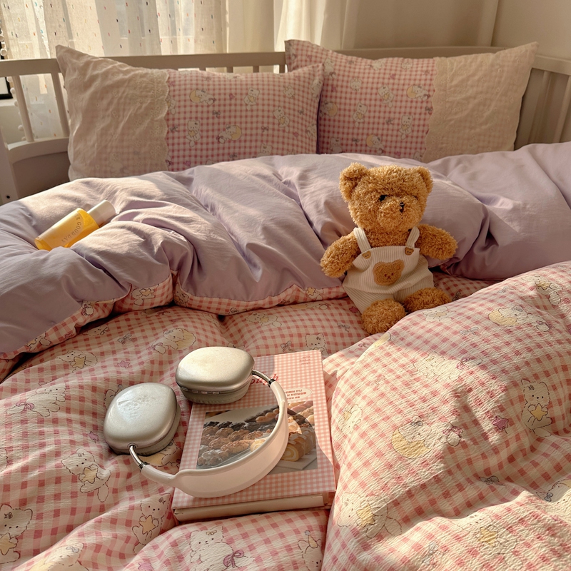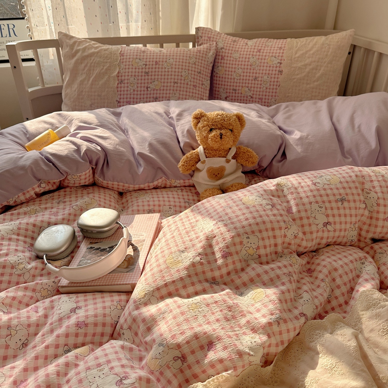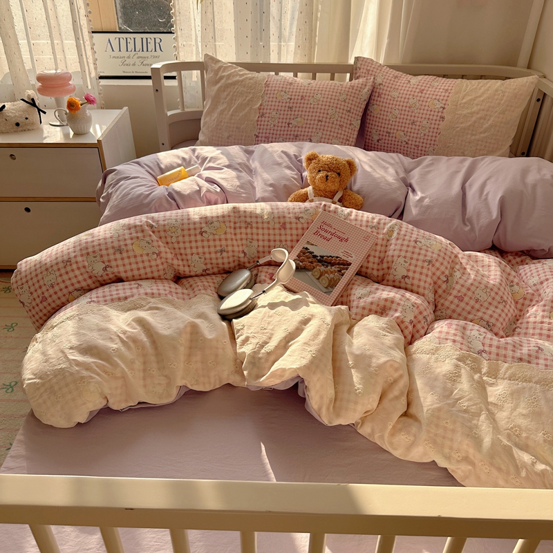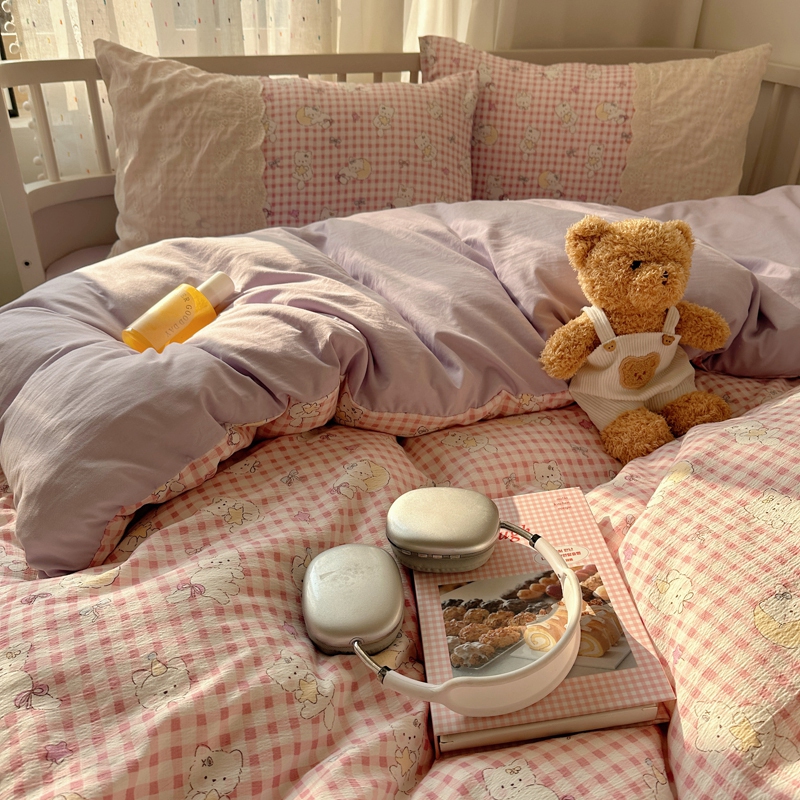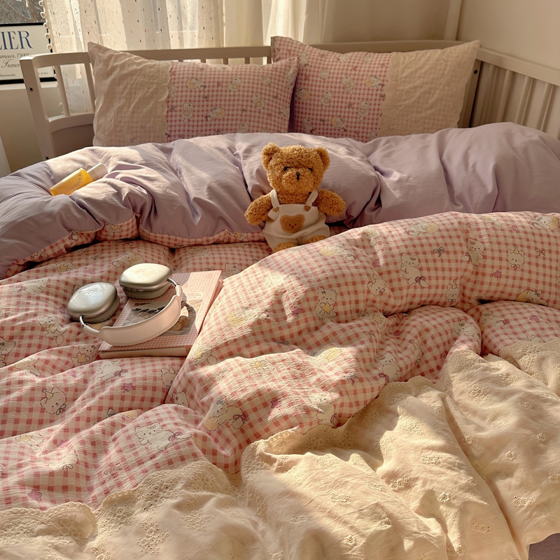 商品名称:顾里2025新款蕾丝花边云感双层纱套件四件套 粉格奶猫