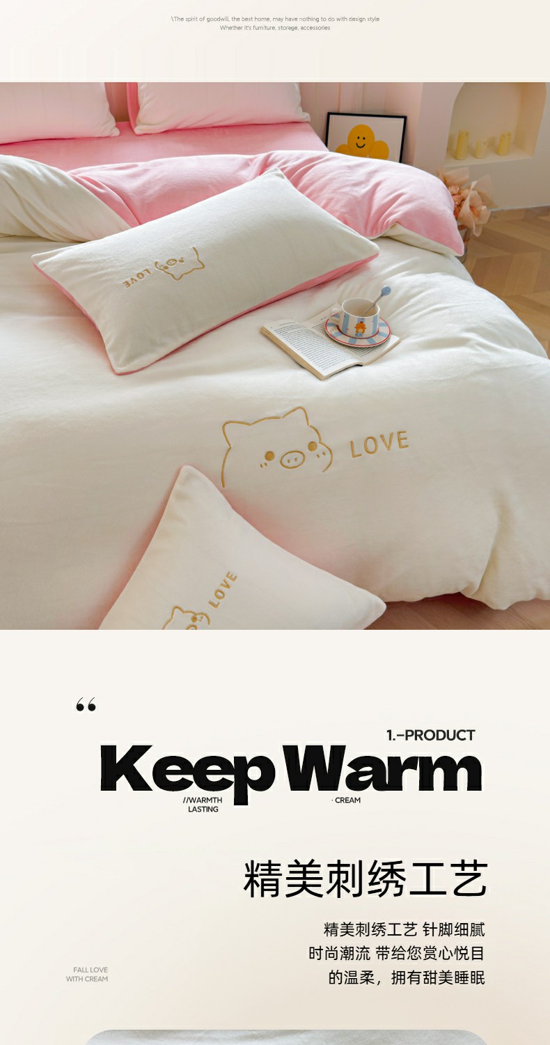 梦恬佳 2025新款亲肤舒适牛奶绒刺绣四件套 奶白+樱花粉