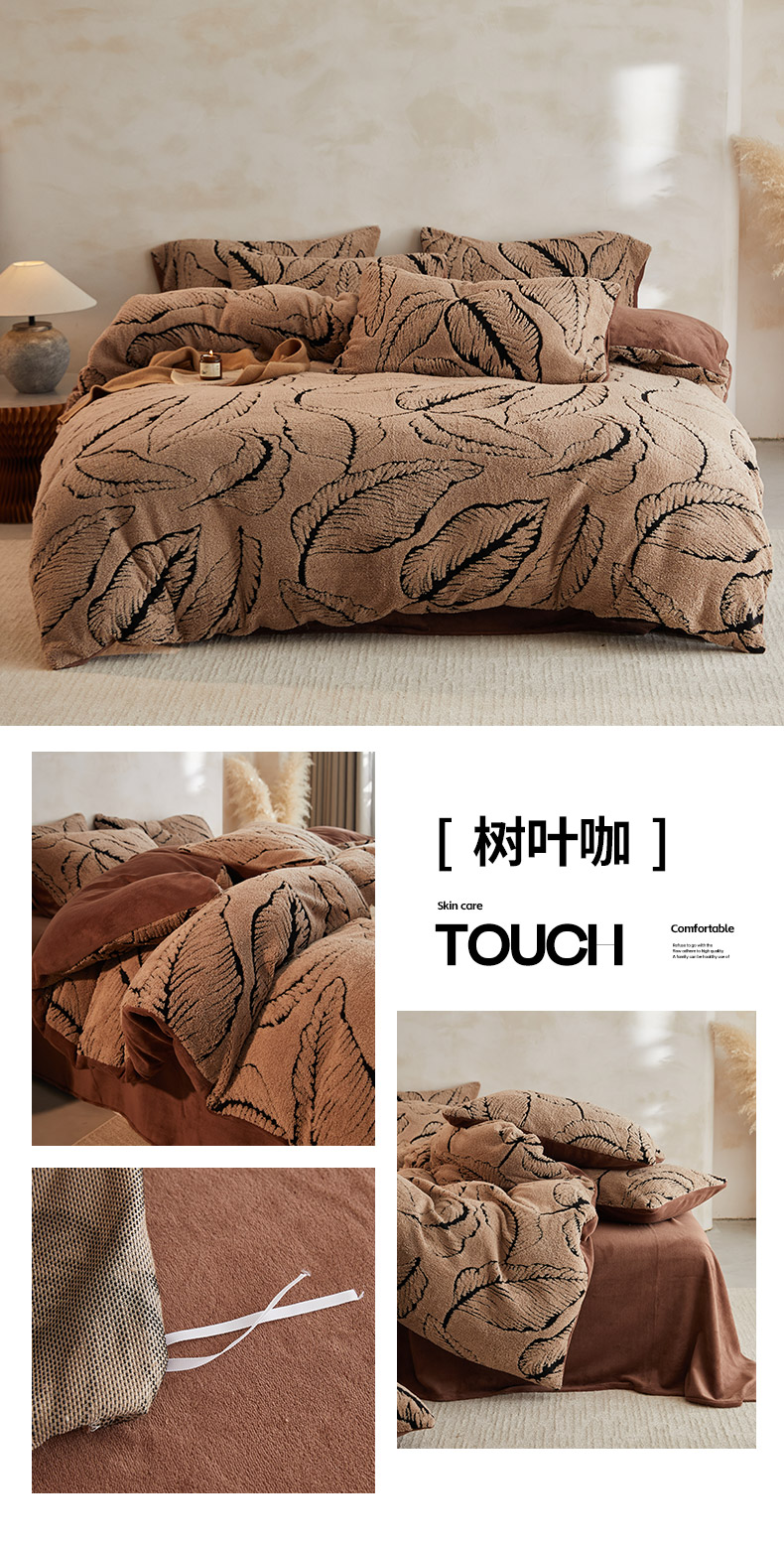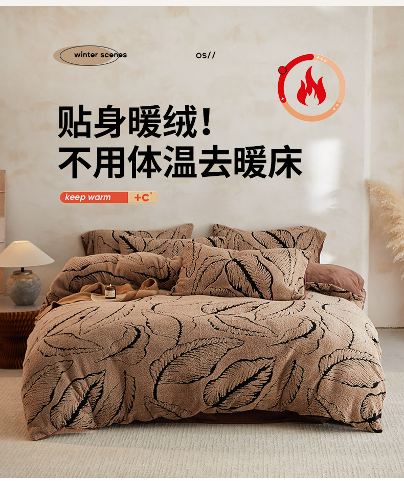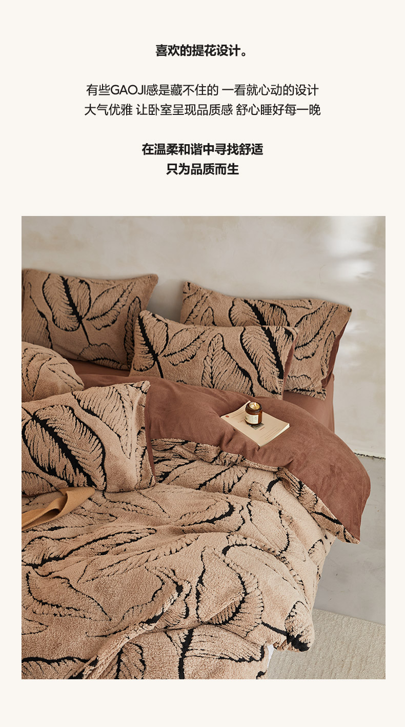商品名称:吾秀家居 2025新款牛奶绒提花绵羊绒四件套-羊绒系列 树叶咖