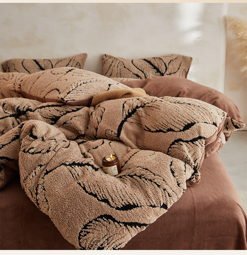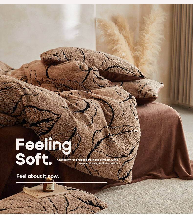 吾秀家居 2025新款牛奶绒提花绵羊绒四件套-羊绒系列 树叶咖