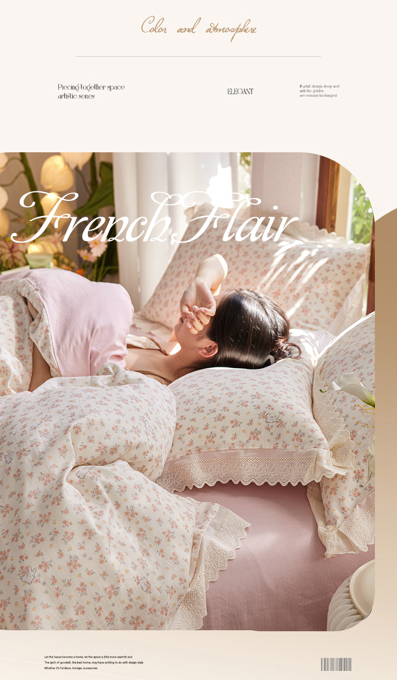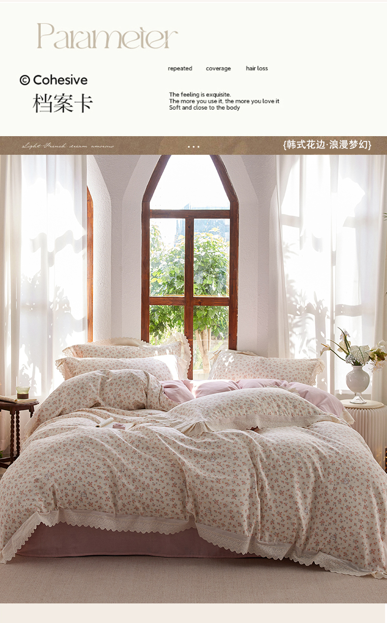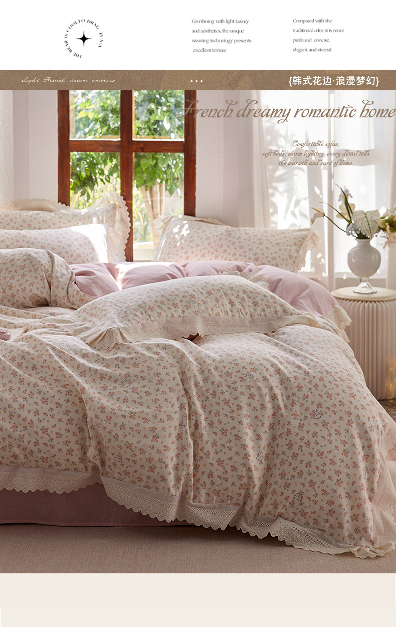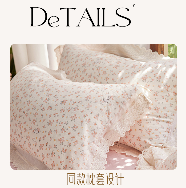 当前位置: 91家纺网 > 商品网购 > 床品套件 > 四件套 > 双层纱四件套 > 清雅福 2026春夏新品韩版全棉双层纱镂空花边系列四件套 花丛小兔