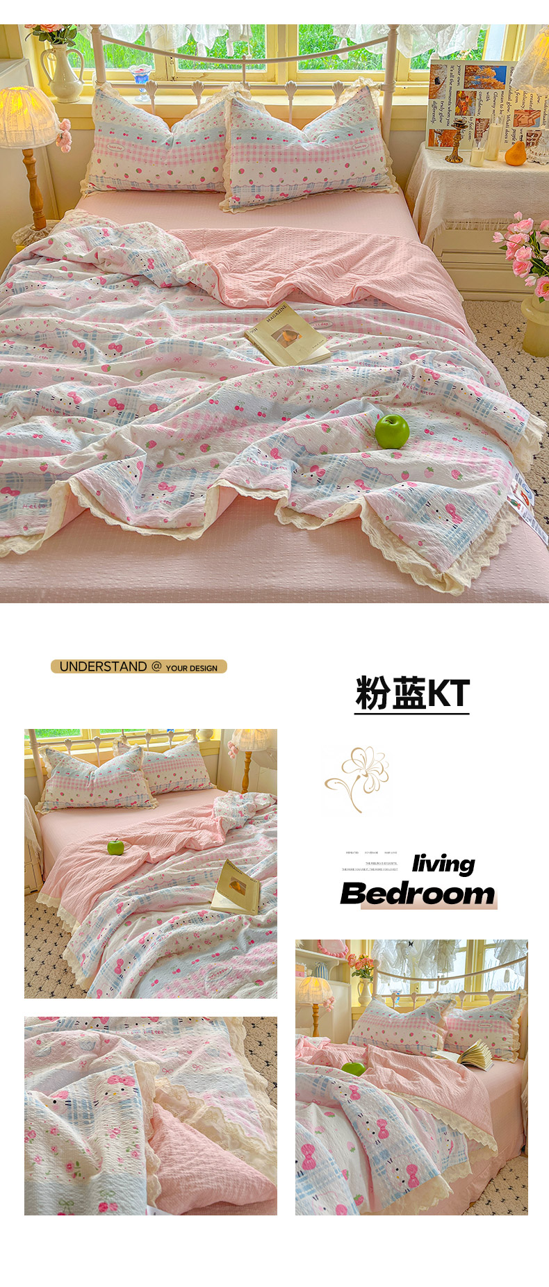 (总)金梦拉家纺 2026新款全棉花边系列泡芙纱泡泡纱夏被夏凉被空调被四件套,躲雨小兔,粉蓝KT,格格心动,花漾浅梦,木马小花团,浅蓝花照,青草録,柔韵粉樱,甜甜樱桃,雾蓝粉黛,小紫花免,紫色木马