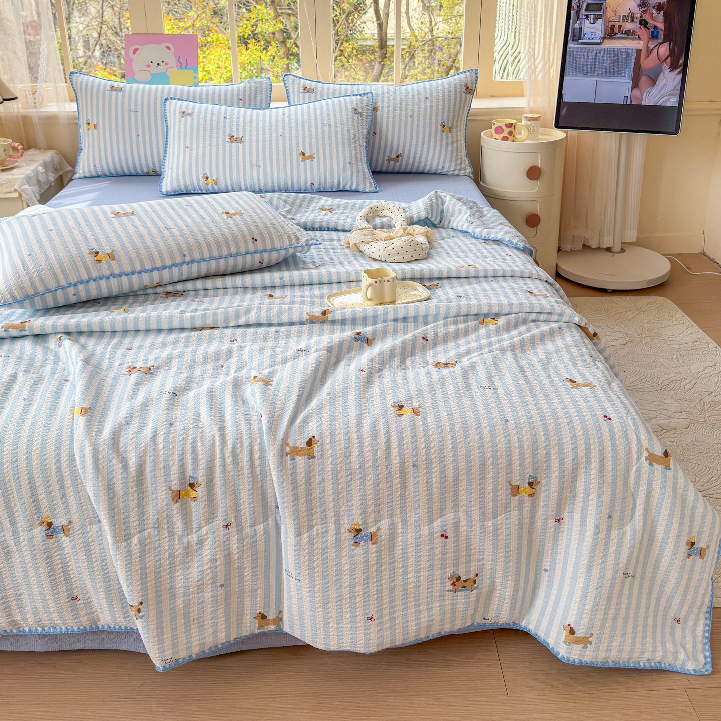 (总)仟网汇 2026新款贝壳边泡芙纱三角针夏被四件套,滑板狗,丽莎,奶油小狗,柿柿如意,甜心小兔,夏被叠拍