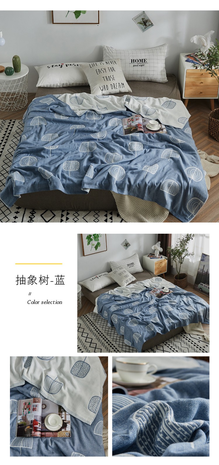 商品名称:朴尔 五层毛巾被薄款夏被纱布被子盖毯空调被全棉 抽象树-蓝