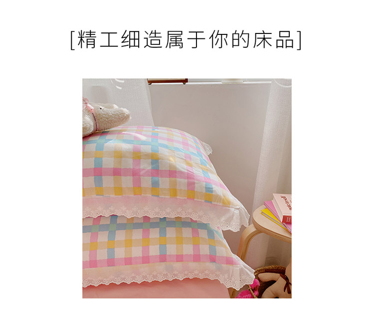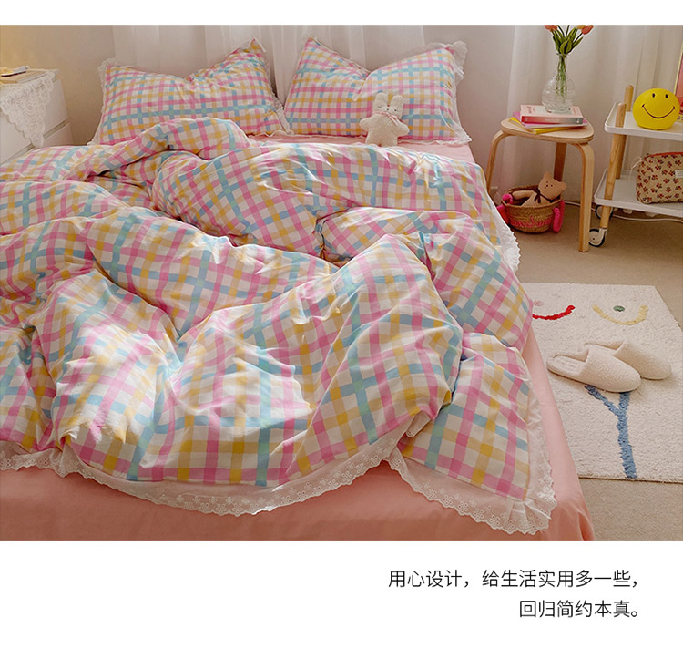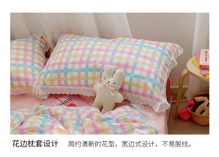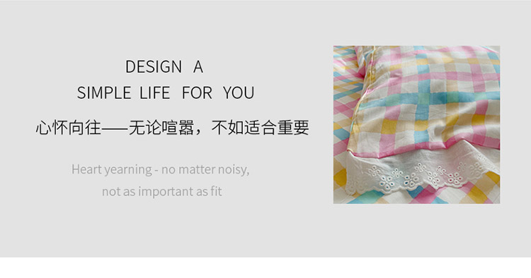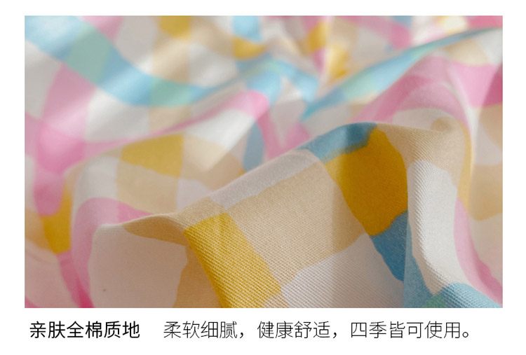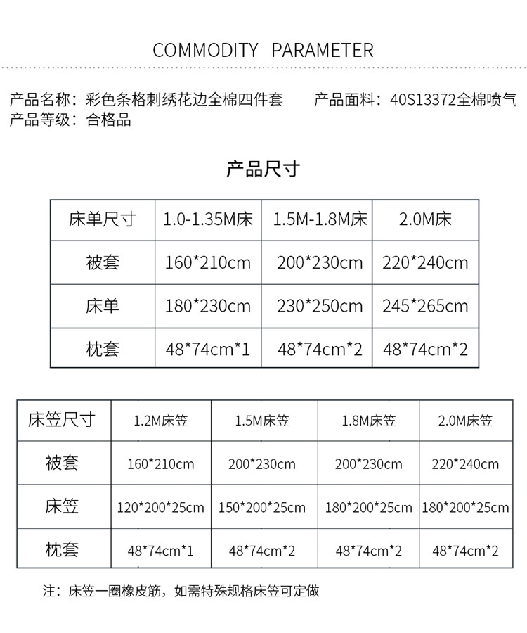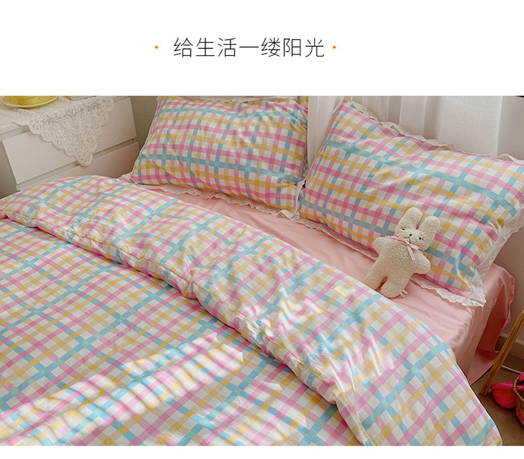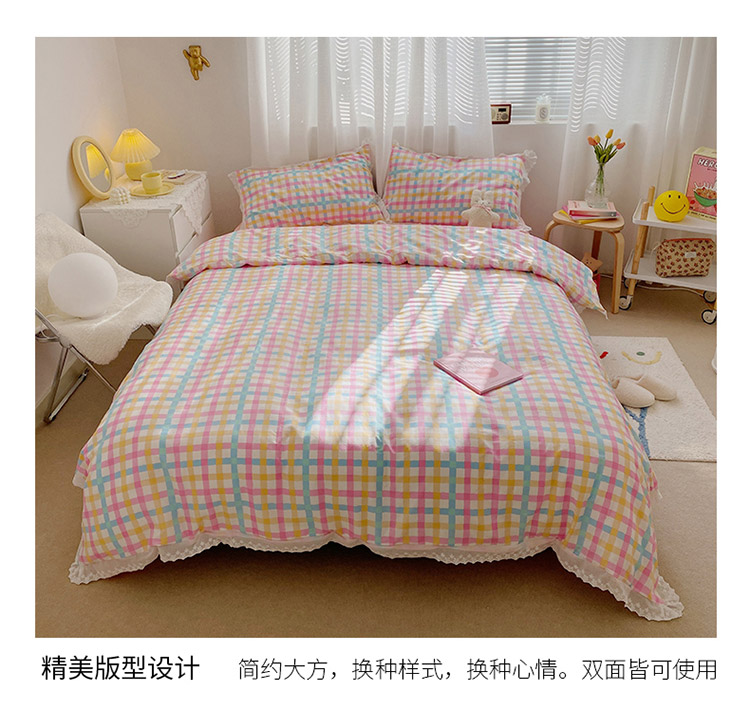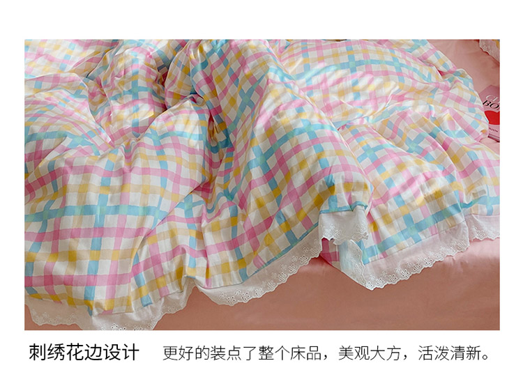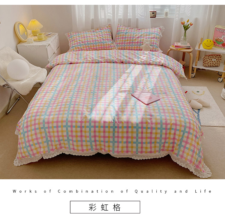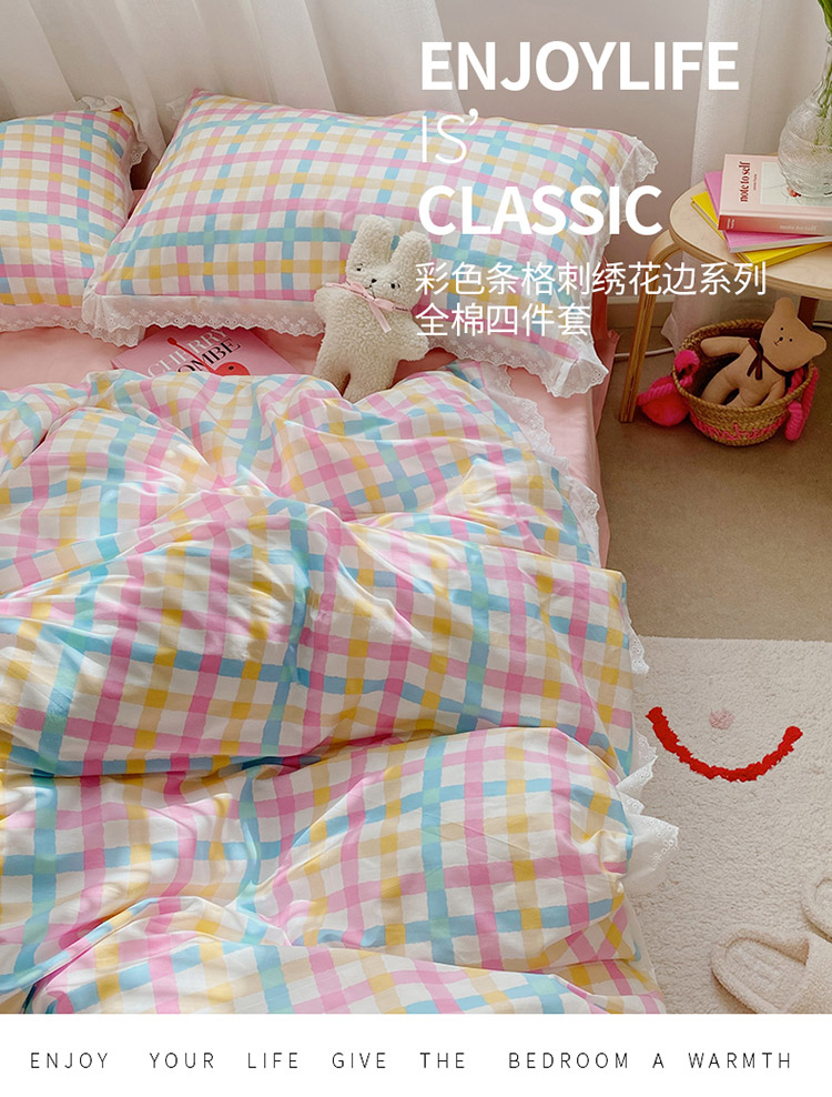 当前位置: 91家纺网 > 商品网购 > 床品套件 > 四件套 > 全棉普通四件套 > 艾沁 2021新款纯棉彩色条格刺绣花边系列四件套 彩虹格