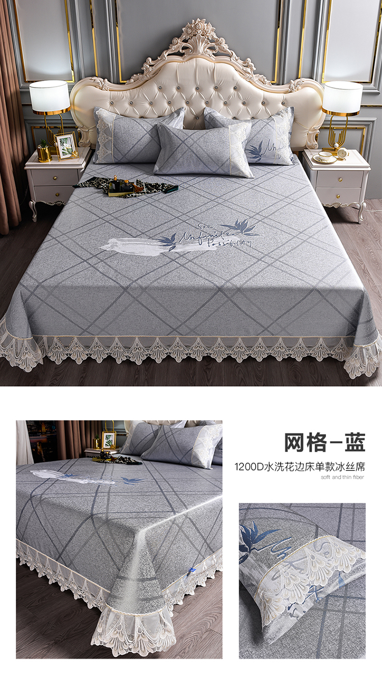 印季家纺-2023新款1200D水洗冰丝花边床单款凉席 网格-蓝