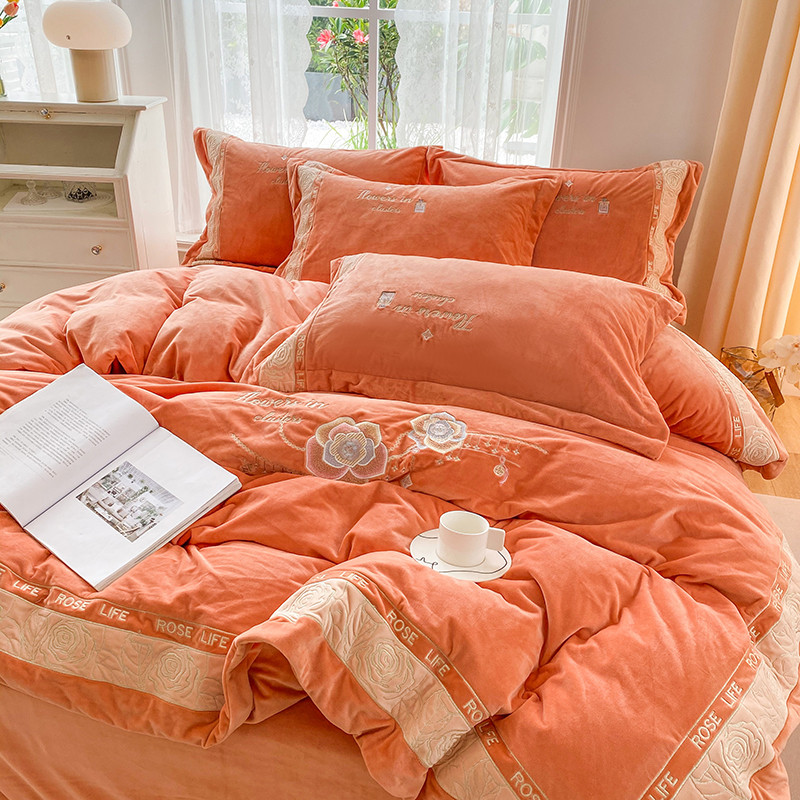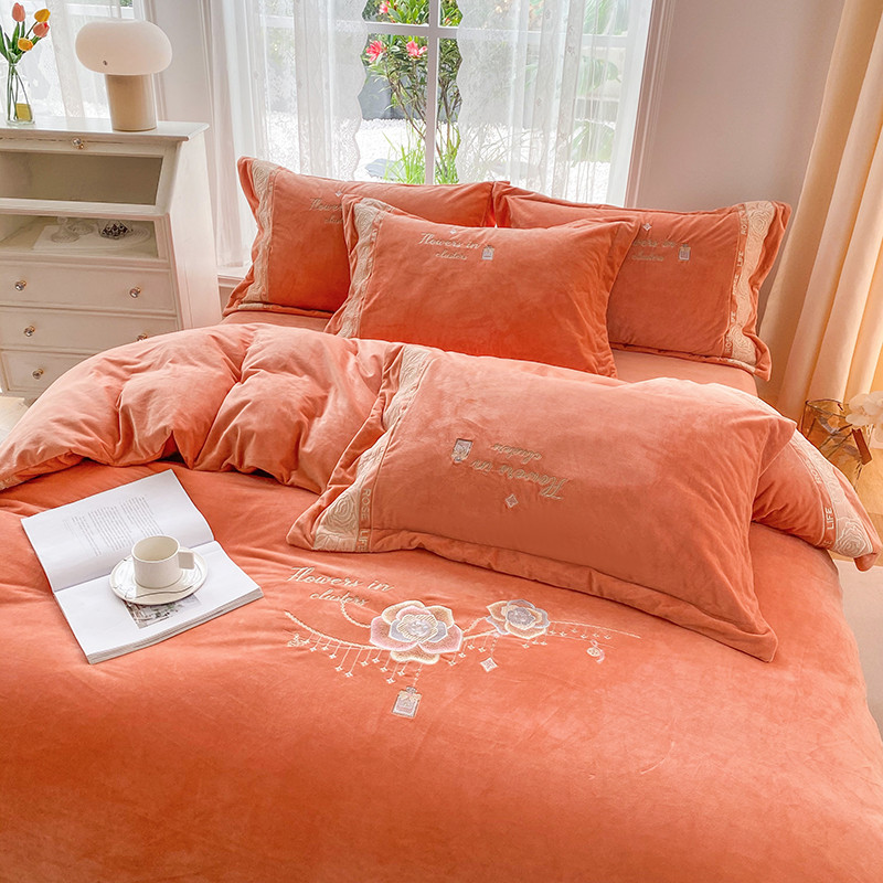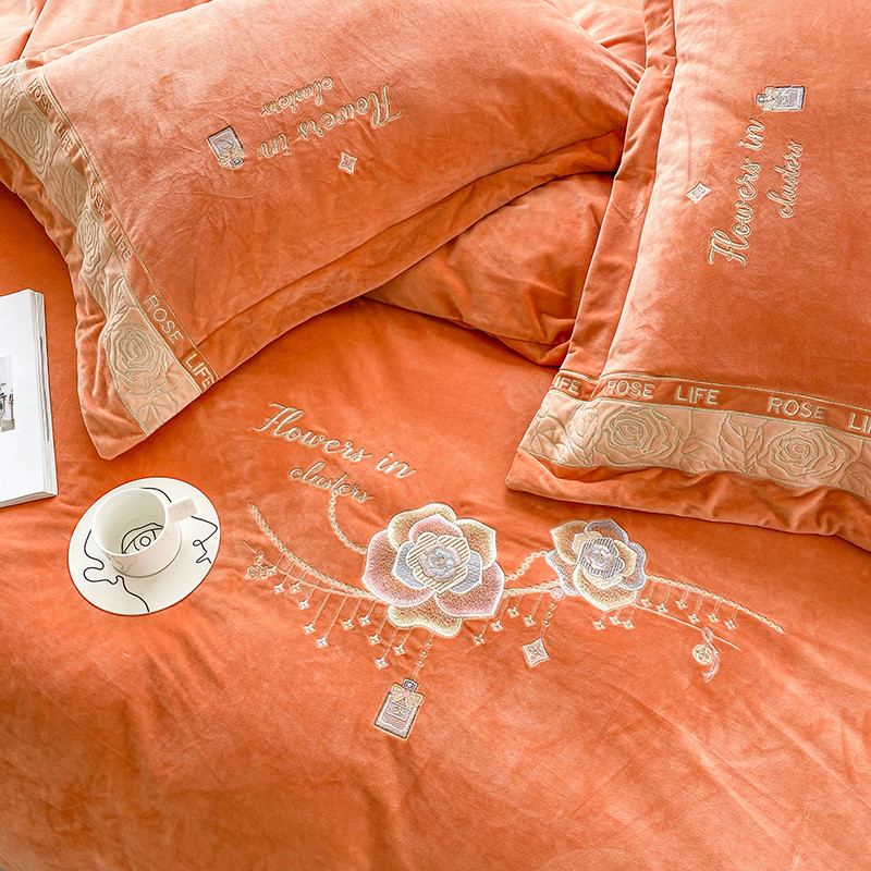 商品名称:可以家居 2023新款全消光婴儿绒牛奶绒刺绣四件套-恋语 恋语-橙