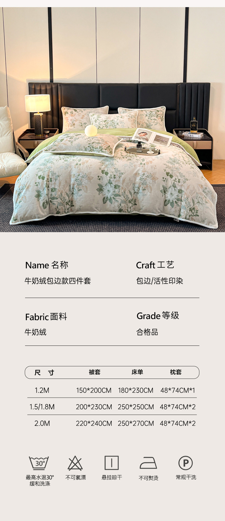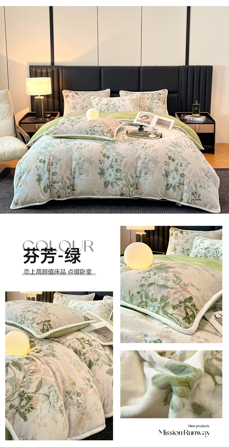 商品名称:诺梵家纺 2025新款牛奶绒印花包边四件套 芬芳-绿