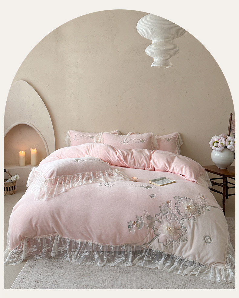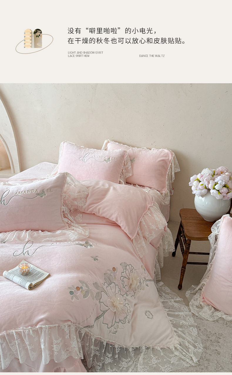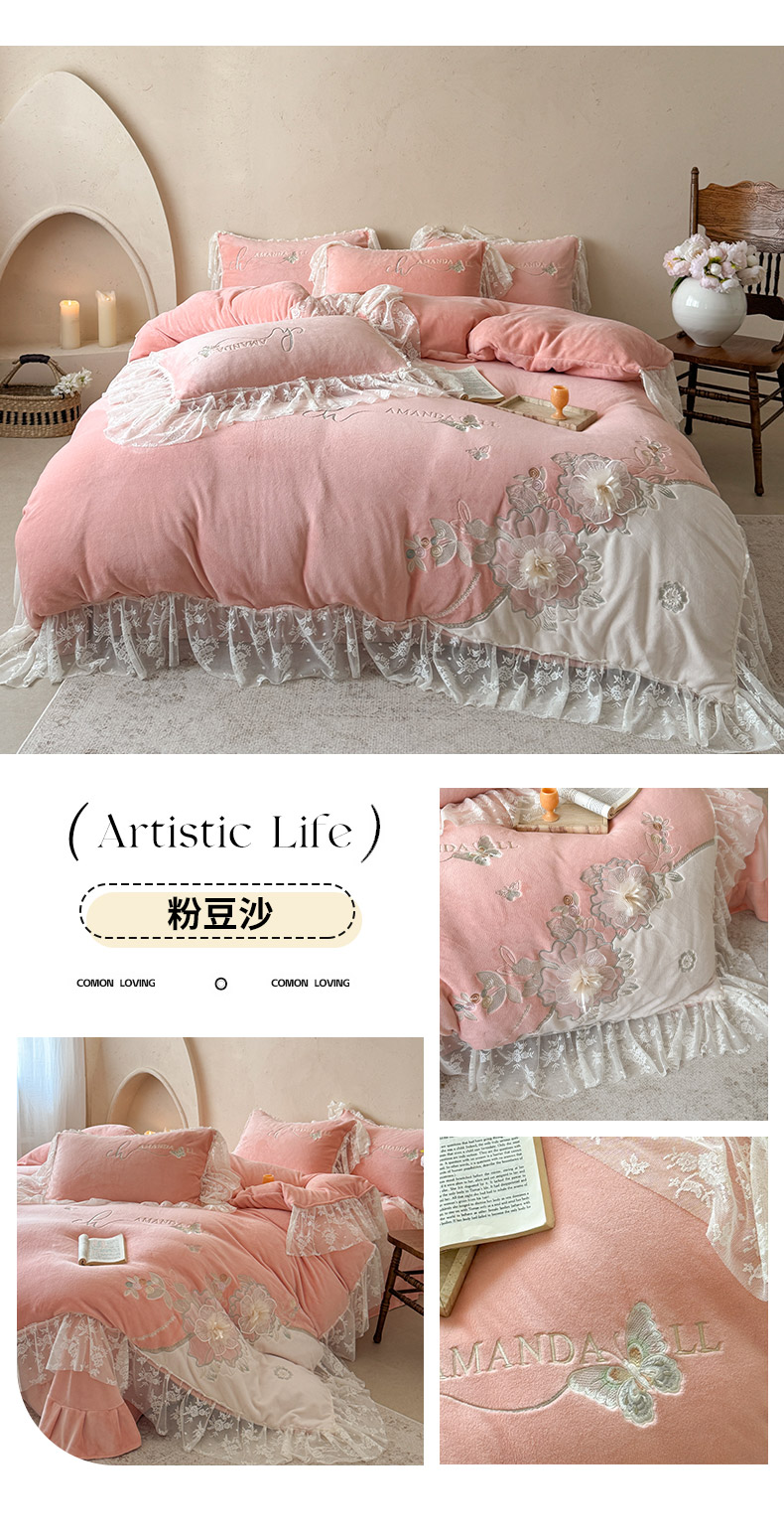 商品名称:可以家居 2025新款高克重全消光超细旦奶芙云绒四件套-玛利亚系列-莱卡芙 粉豆沙