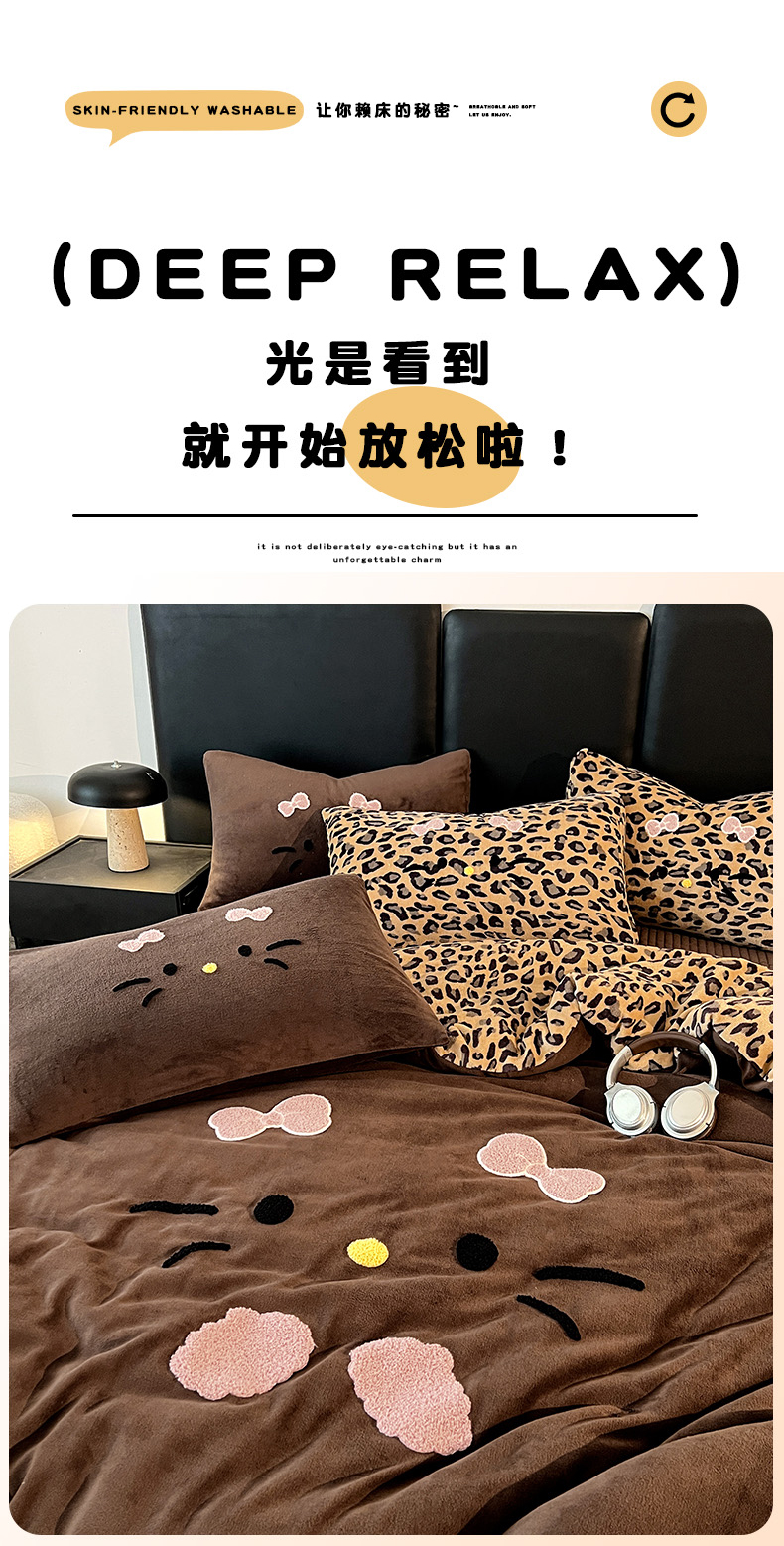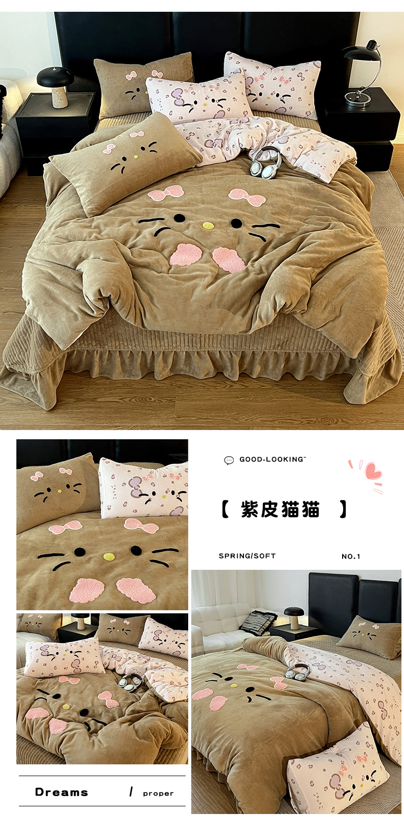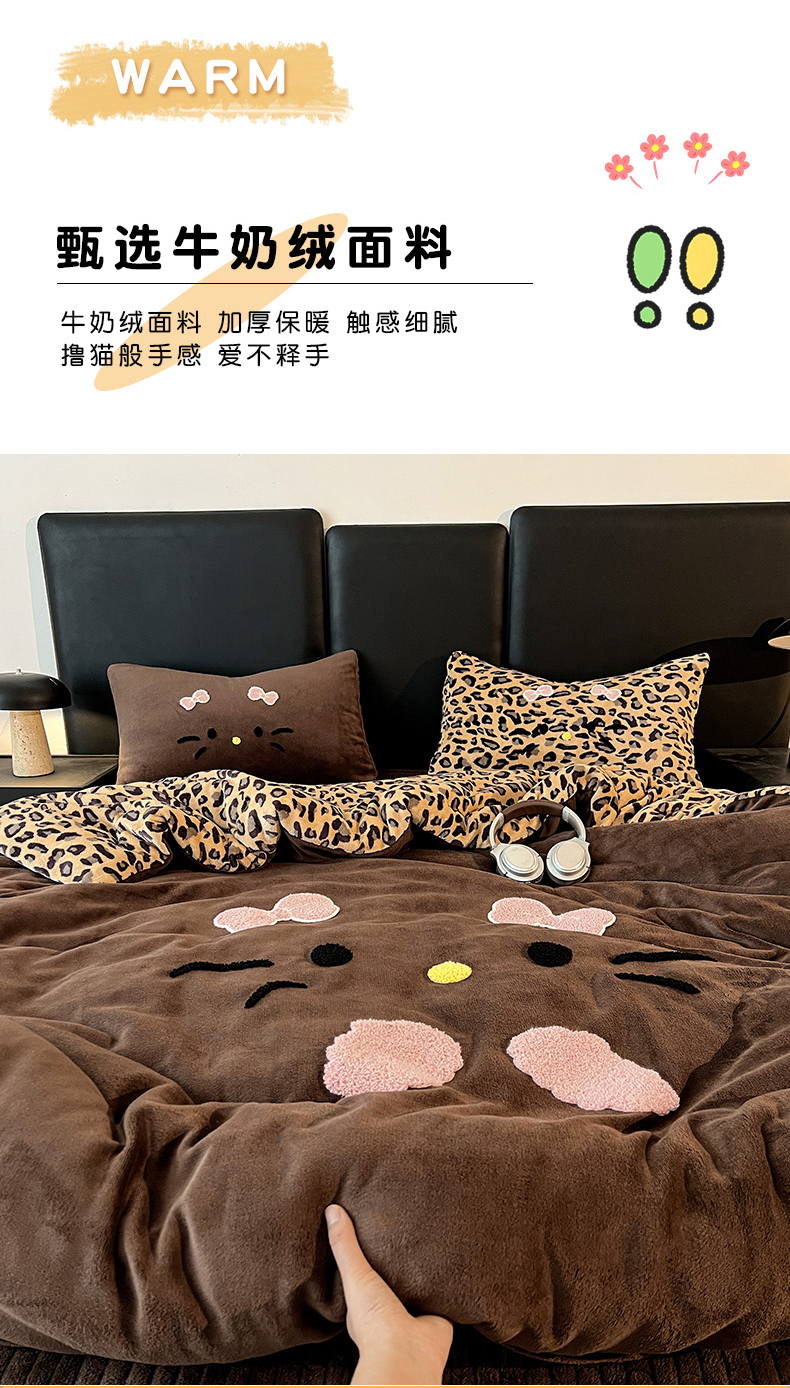 商品名称:富米莱(原臻工厂) 2025新款牛奶绒猫咪毛巾绣床盖床裙四件套 黑皮猫猫