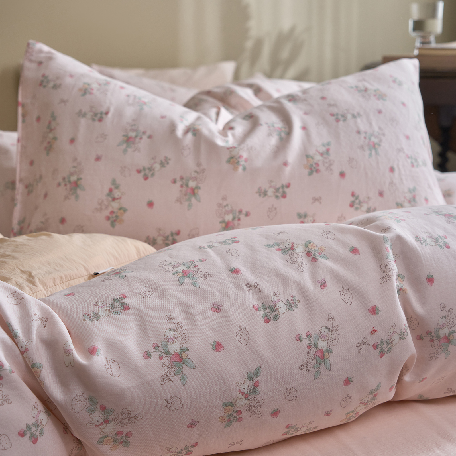 商品名称:洋铭区(原狠狠爱) 2026春季新款简约全棉 无边双层纱 四件套系列 草莓粉兔