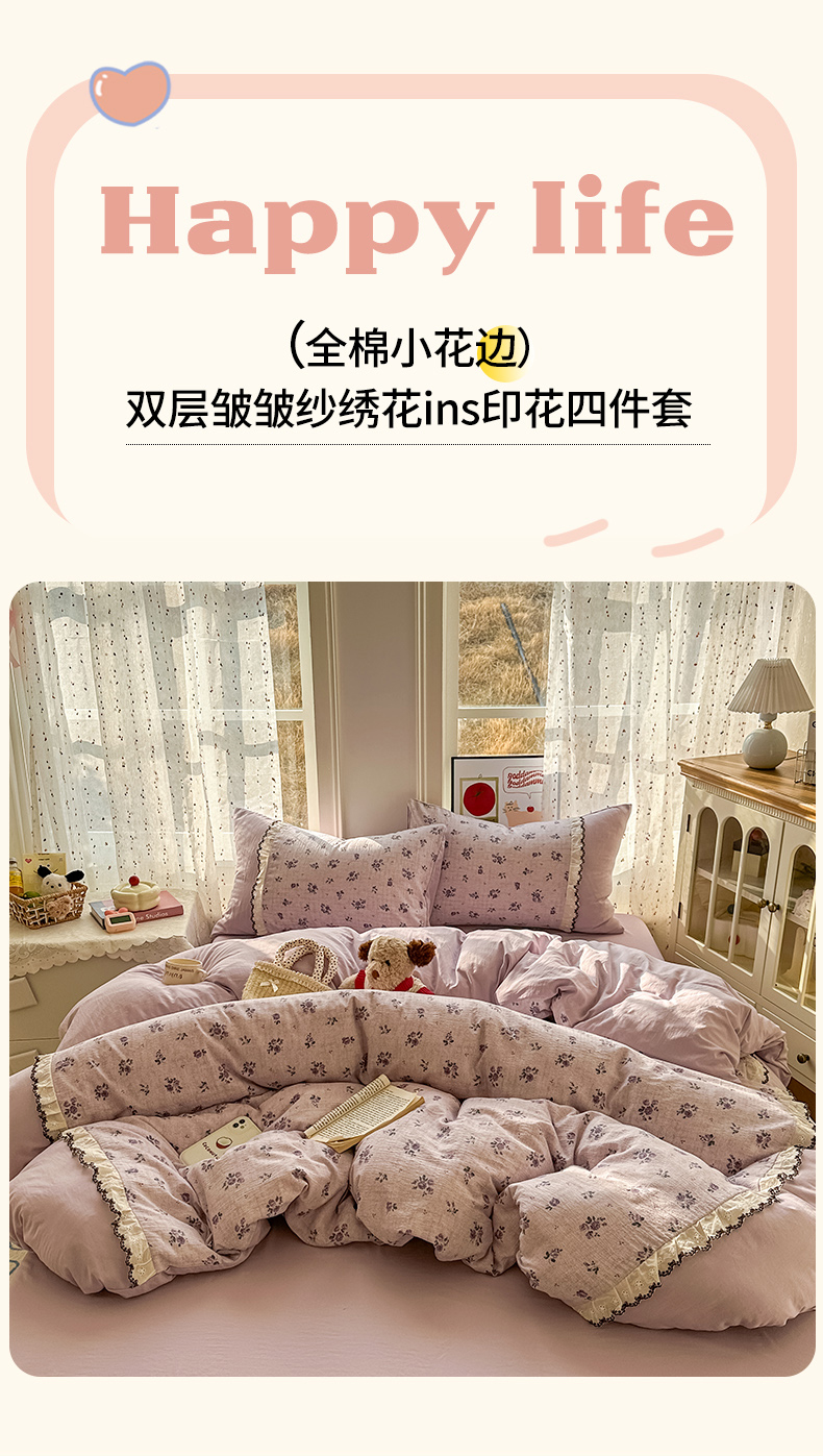 (总)贝凯瑞 2026新款双层纱水洗棉法式复古花边床盖单件三件四件套-甜心,甜心love,甜心草莓,甜心独秀,甜心玫瑰,甜心樱桃