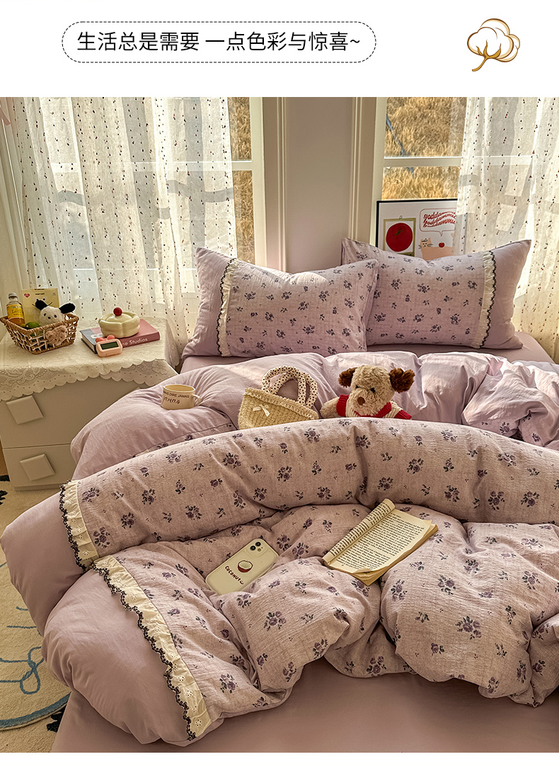 (总)贝凯瑞 2026新款水洗皱皱纱双层纱云朵棉三层夹棉绗绣刺绣小花边单件三件床盖,粉黛甜心,海盐气泡,奶咖碎梦,软萌小狗,芋泥奶冻,组合图仅供展示-不可下单