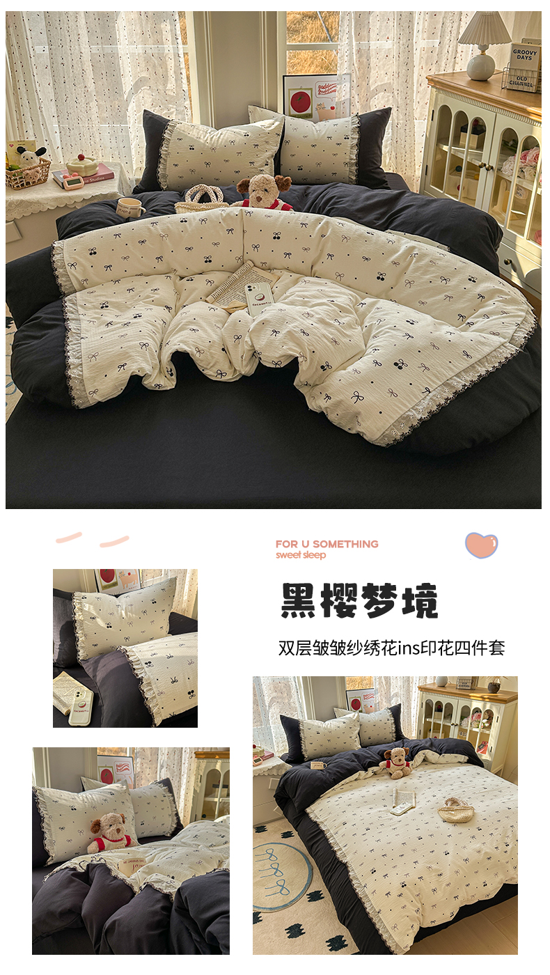 (总)贝凯瑞 2026 (蝴蝶结)皱皱纱双层纱水洗棉ins小清新蕾丝花边韩版床裙四件套,波点蝴蝶结,黑巧蝴蝶结,奶芙蝴蝶结