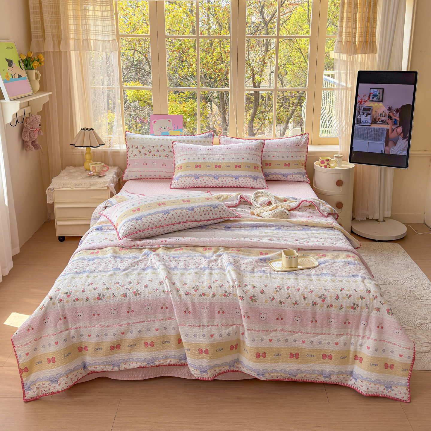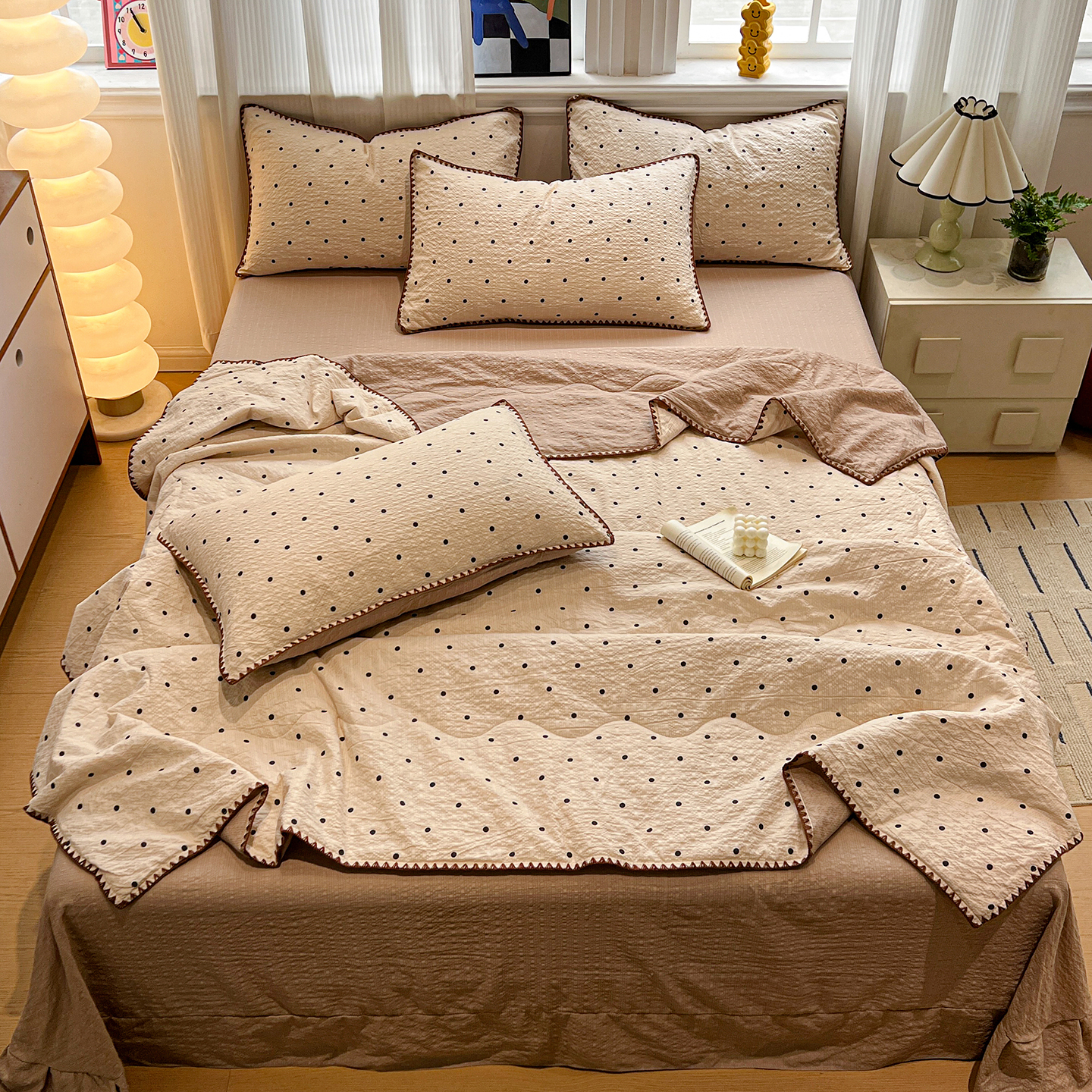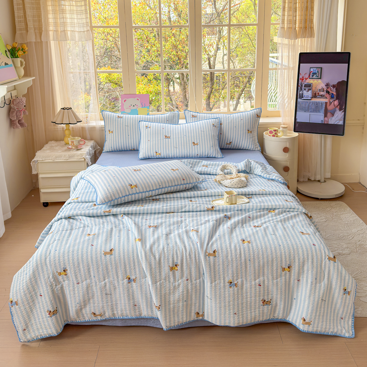(总)仟网汇 2026新款贝壳边泡芙纱三角针夏被四件套,滑板狗,丽莎,奶油小狗,柿柿如意,甜心小兔,夏被叠拍