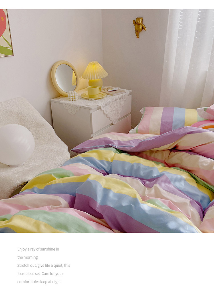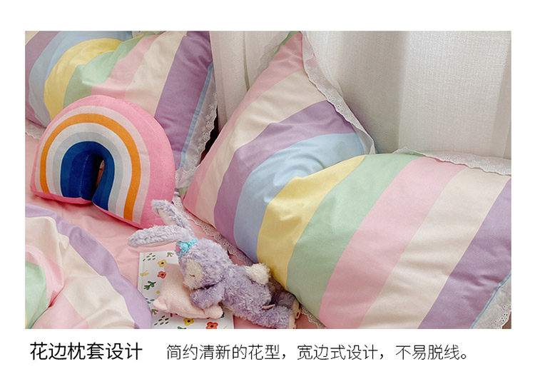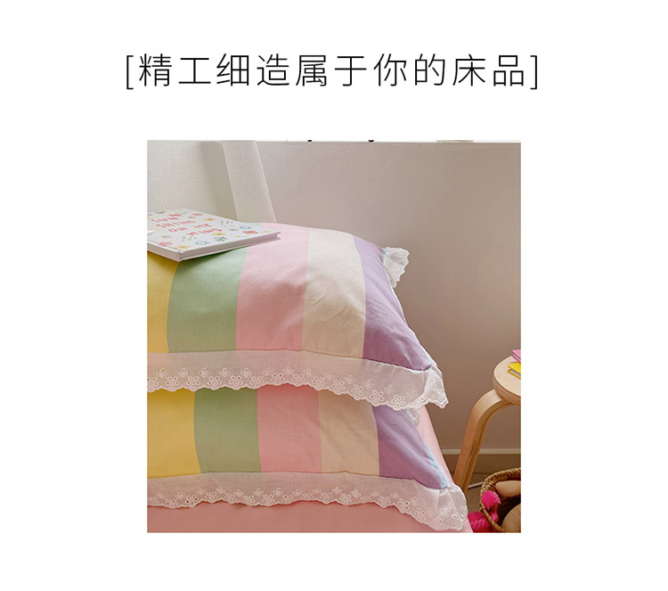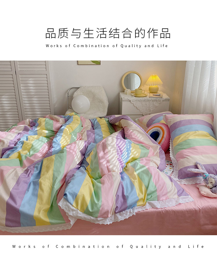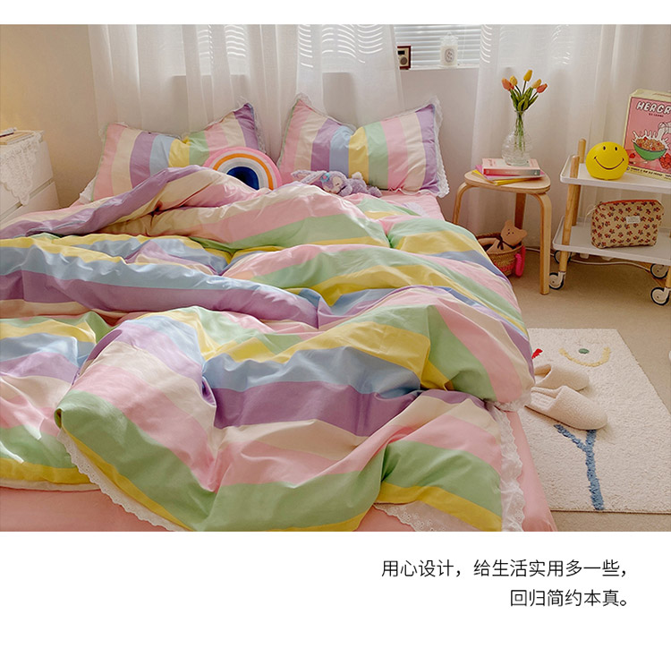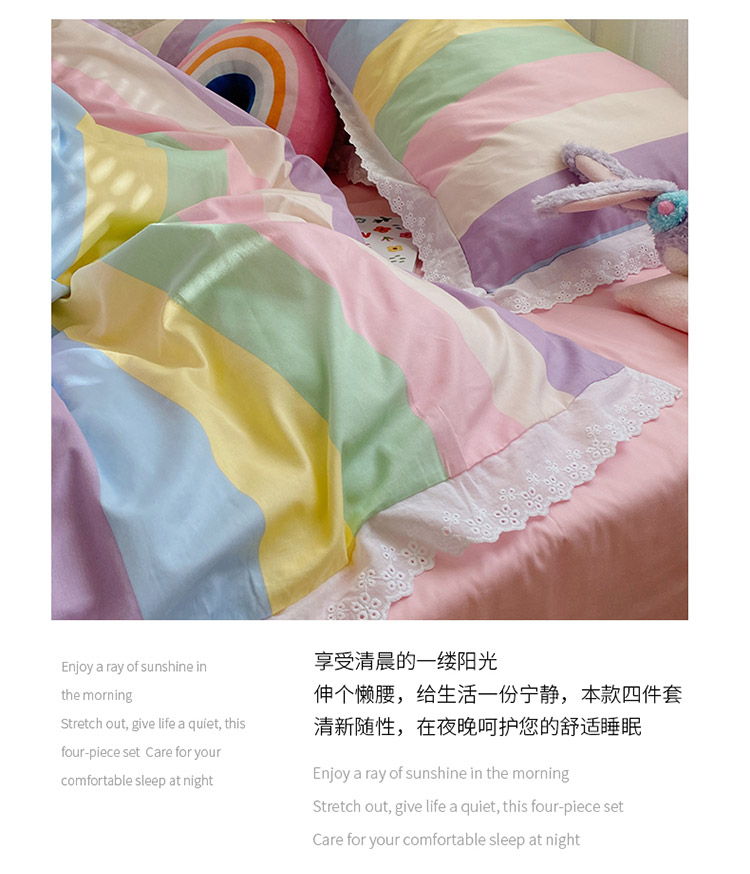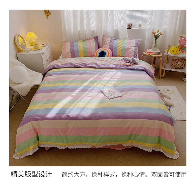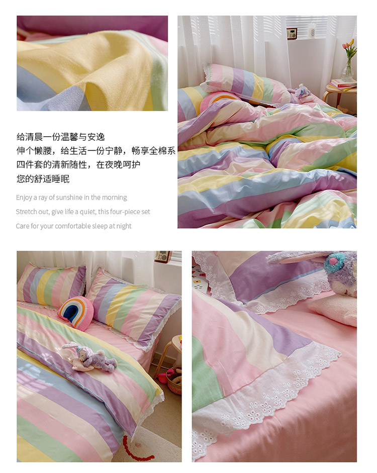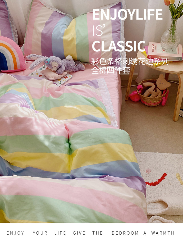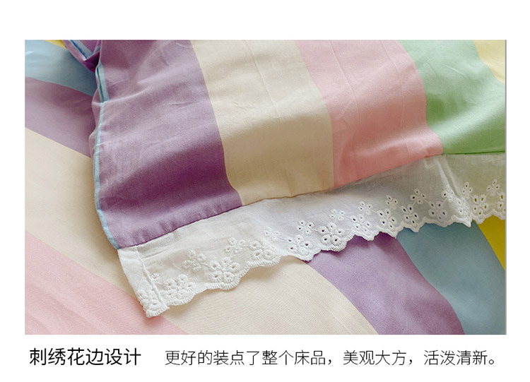 当前位置: 91家纺网 > 商品网购 > 床品套件 > 四件套 > 全棉普通四件套 > 艾沁 2021新款纯棉彩色条格刺绣花边系列四件套 彩条