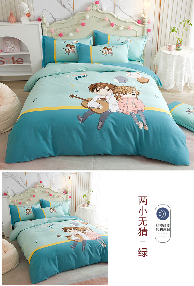 商品名称:沐白家居2023大版全棉印花四件套 2两小无猜-绿